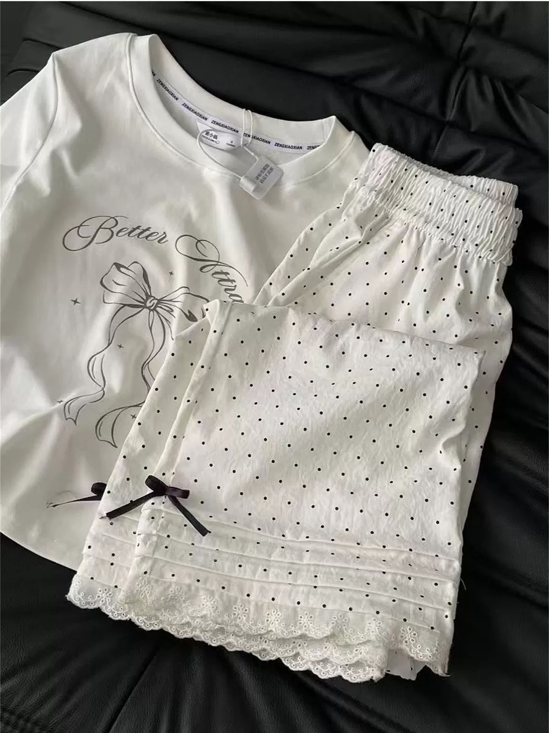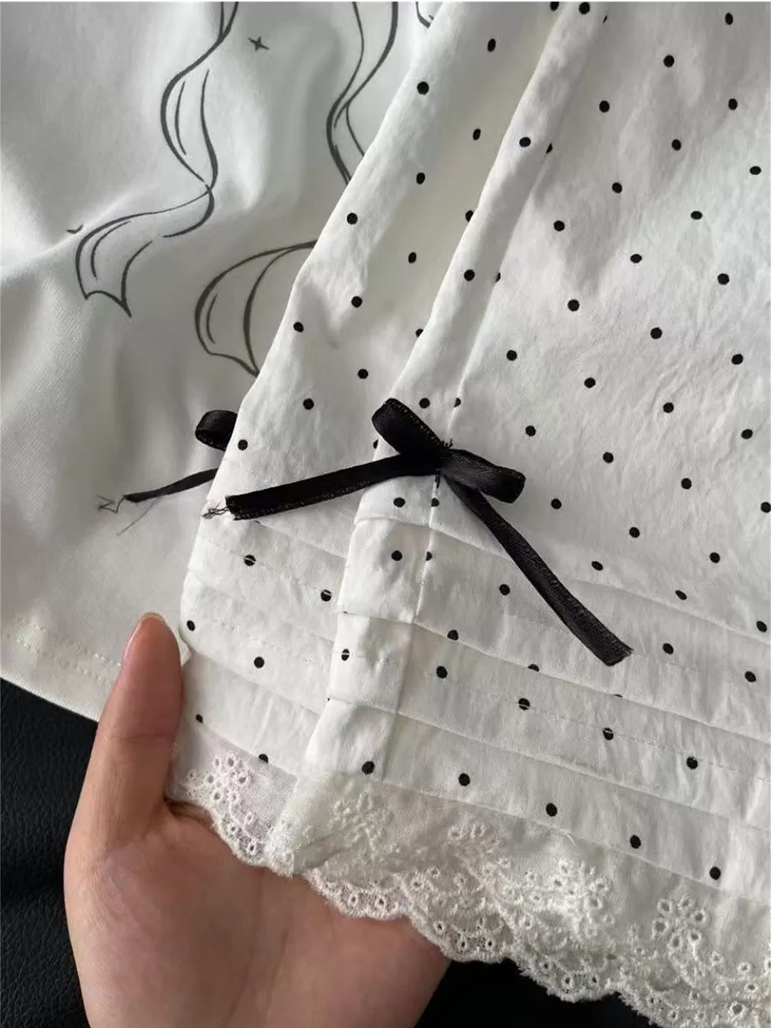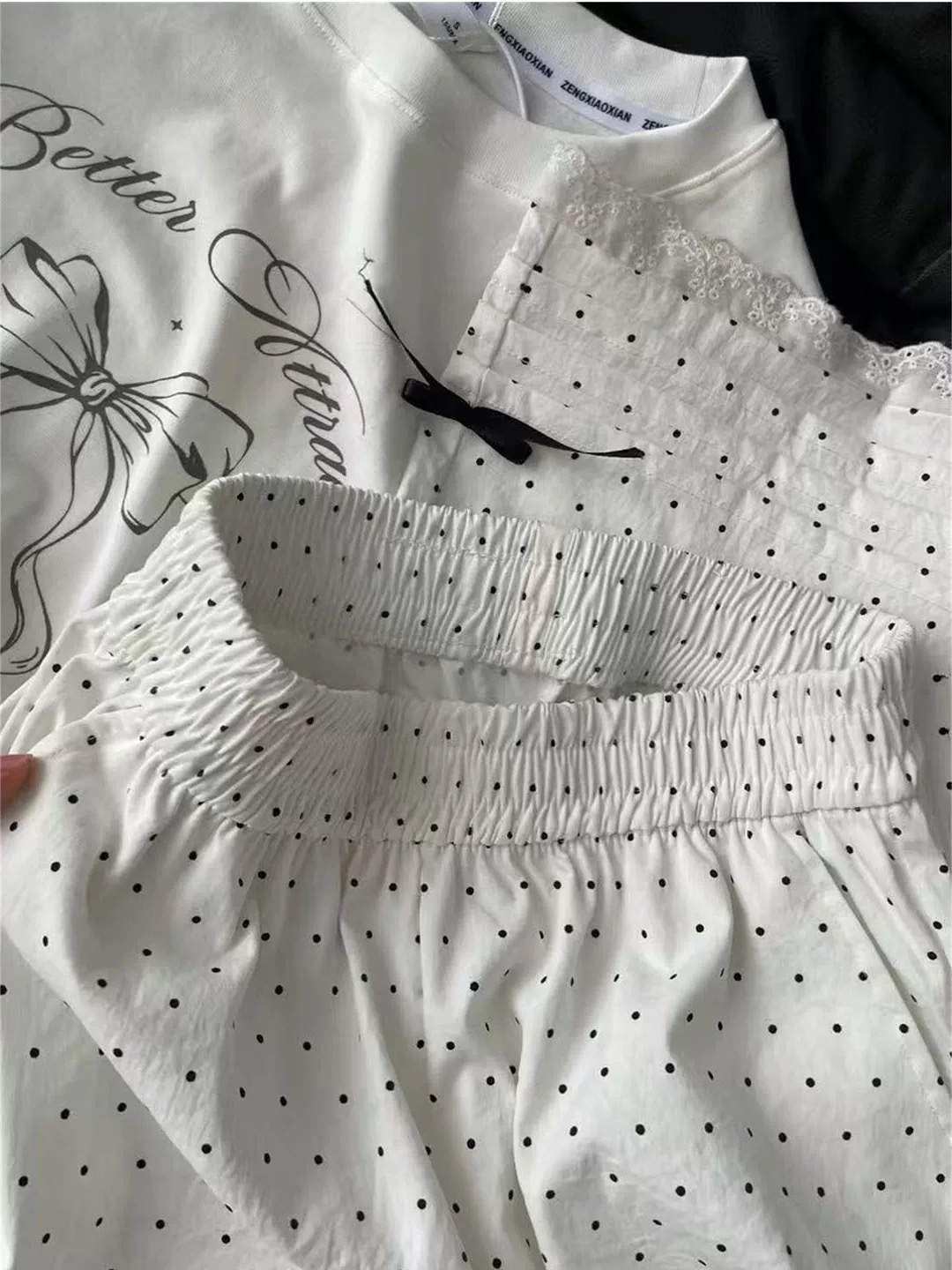 上面搭配什么都可以 下面是一个白色的长裤 面料是那种凉快的 白色耐看,但不耐脏 波点形状的设计