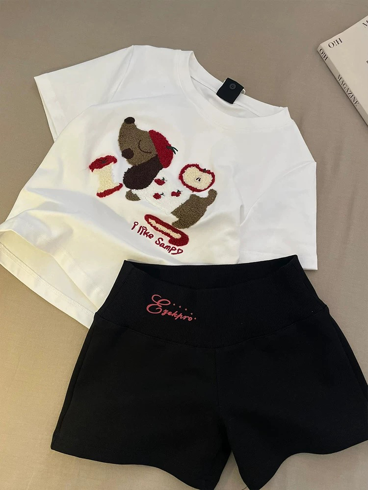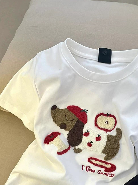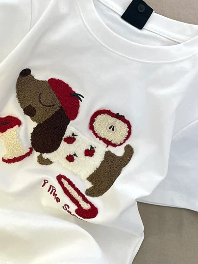 他这个是非常舒服的面料 然后图案是刺绣的,非常像腊肠小狗图案😍😍 夏天穿非常不错,下面搭配什么短裤都可以 也可以搭配牛仔裤 👖