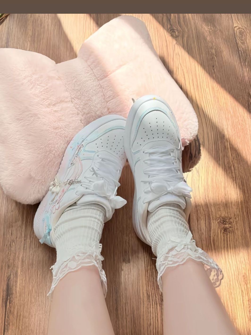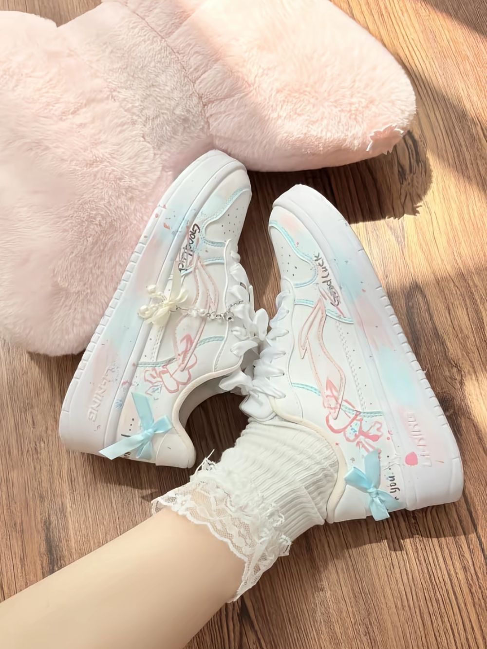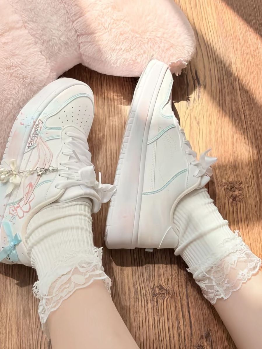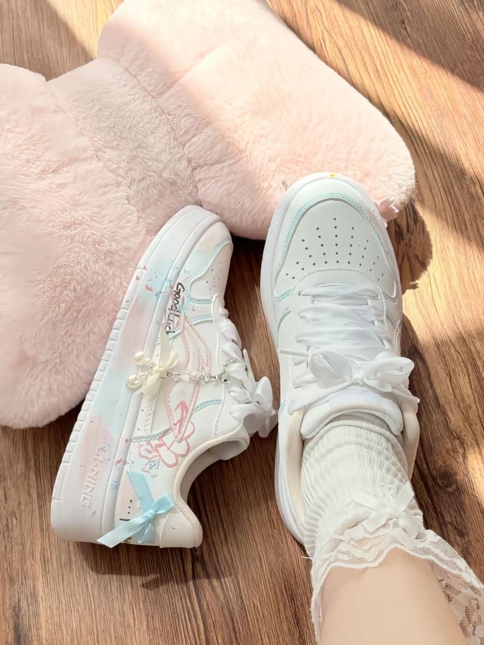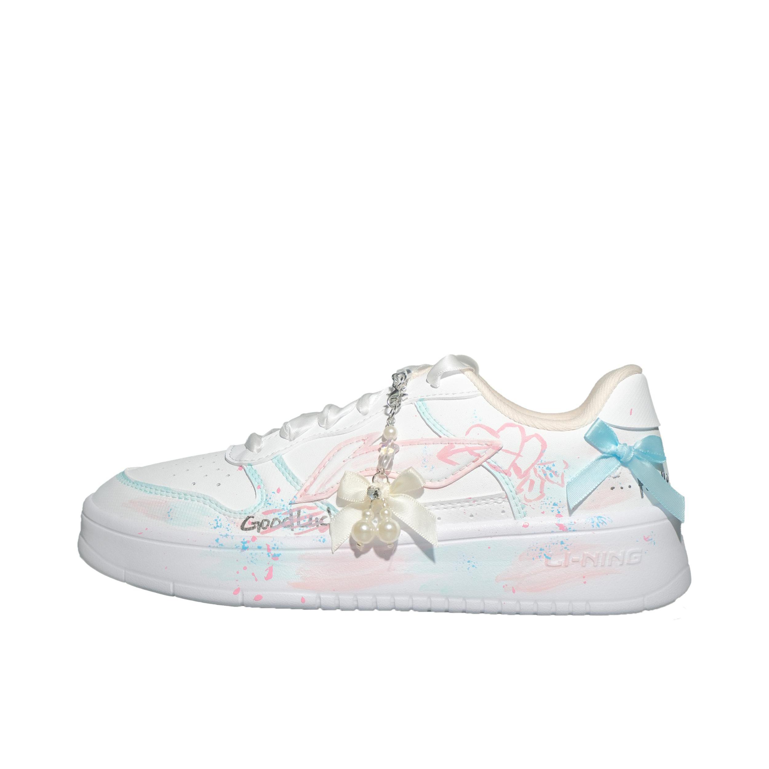 谁能拒绝这双马卡龙色系的李宁板鞋啊!浅粉淡蓝渐变像把春天踩在脚下,珍珠蝴蝶挂饰+丝带鞋带,甜妹感直接拉满✨ 搭lo裙、休闲装都超温柔,少女心狠狠沦陷了!