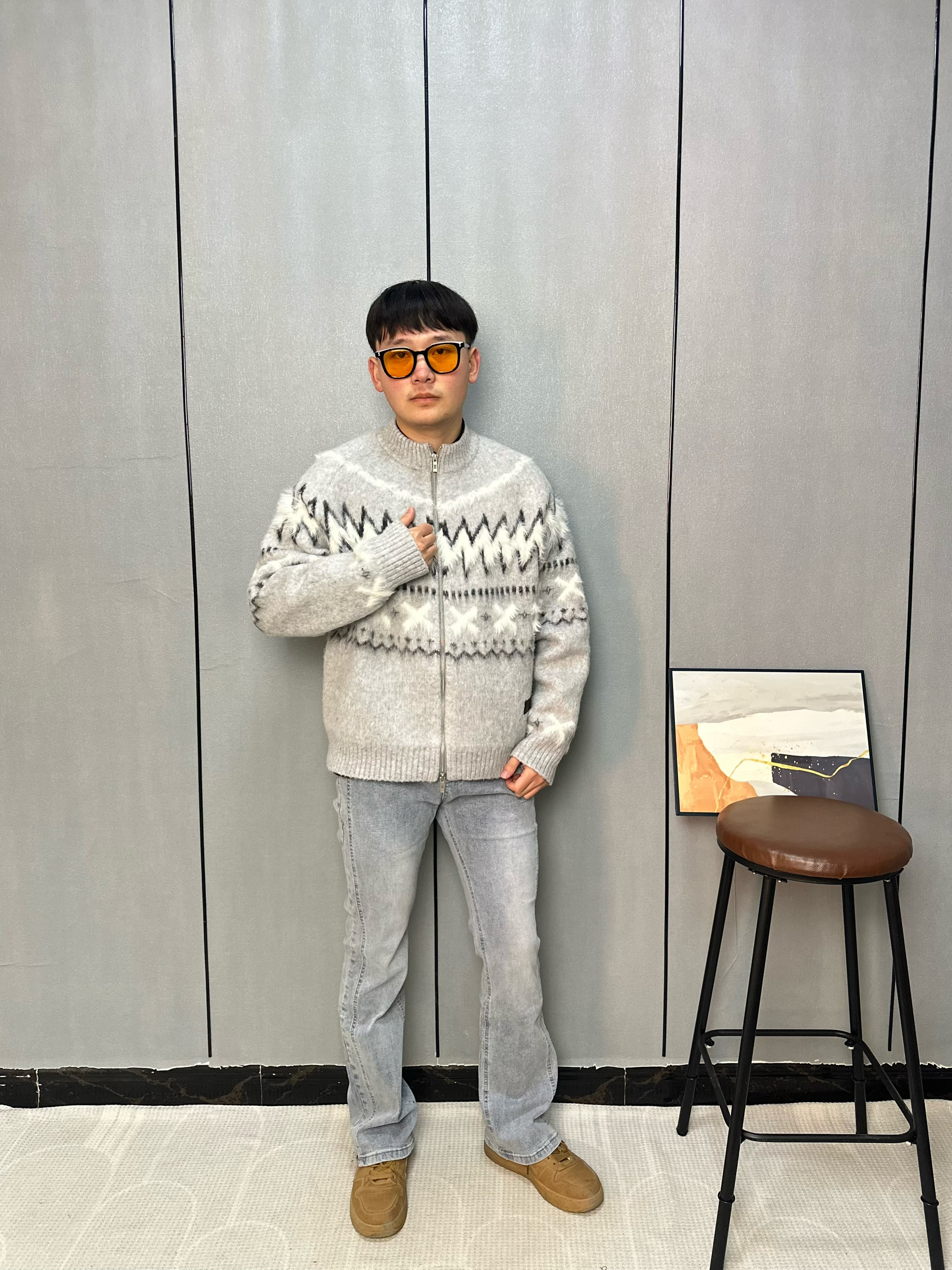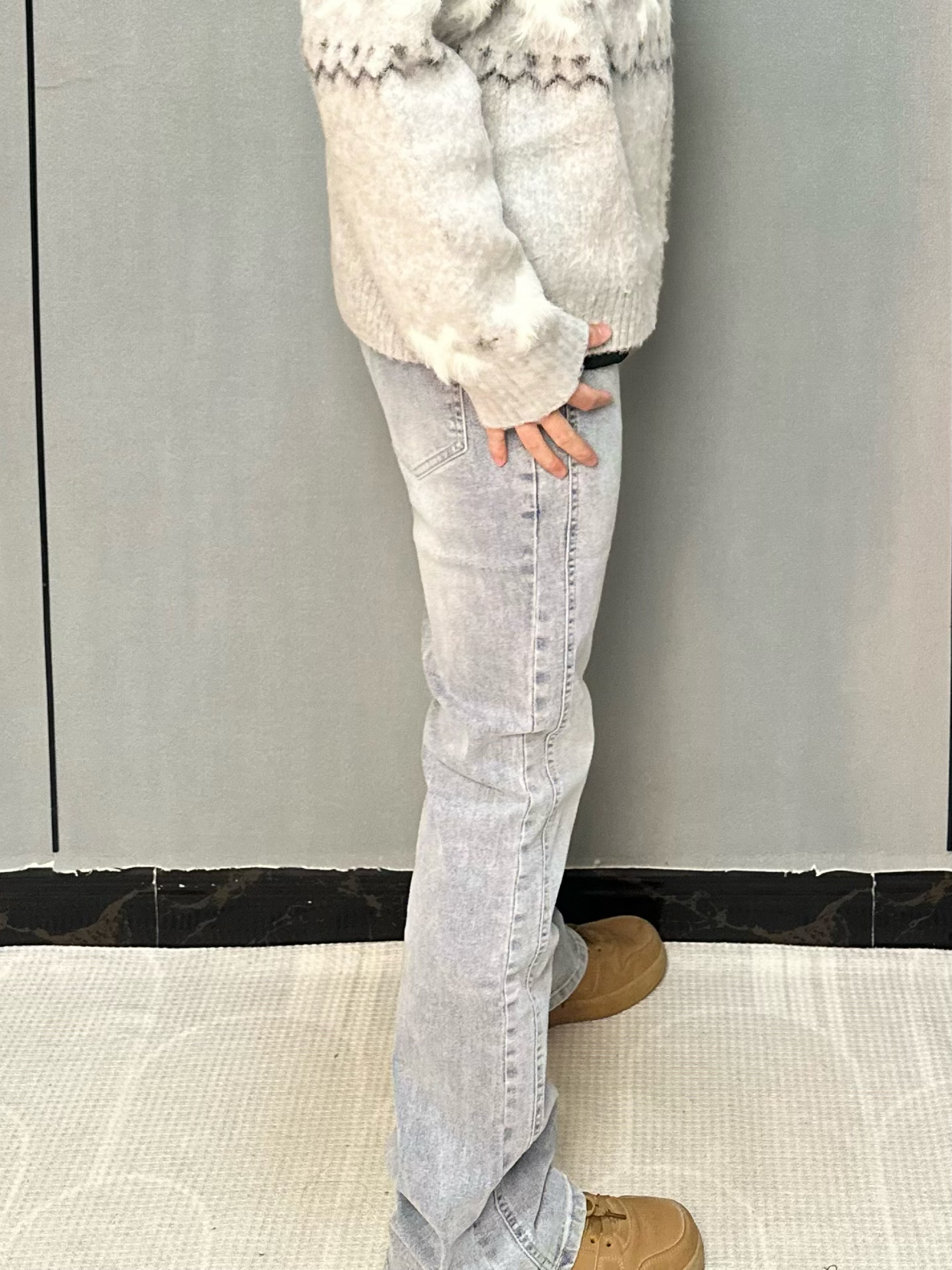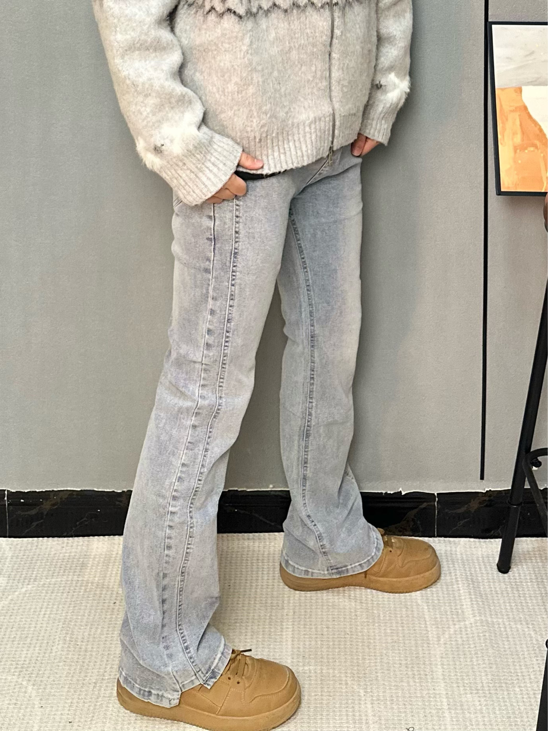 浅蓝水洗微喇牛仔裤承包我这个春天的穿搭💙 版型亮点: 前中线分割设计+微喇裤型 把腿型修饰得又直又长 复古废土风自带慵懒氛围感~ 搭配软糯马海毛拉链毛衣,通勤出街都适配👌 高腰版型刚好露出腰线 小个子也能轻松穿出三七分比例