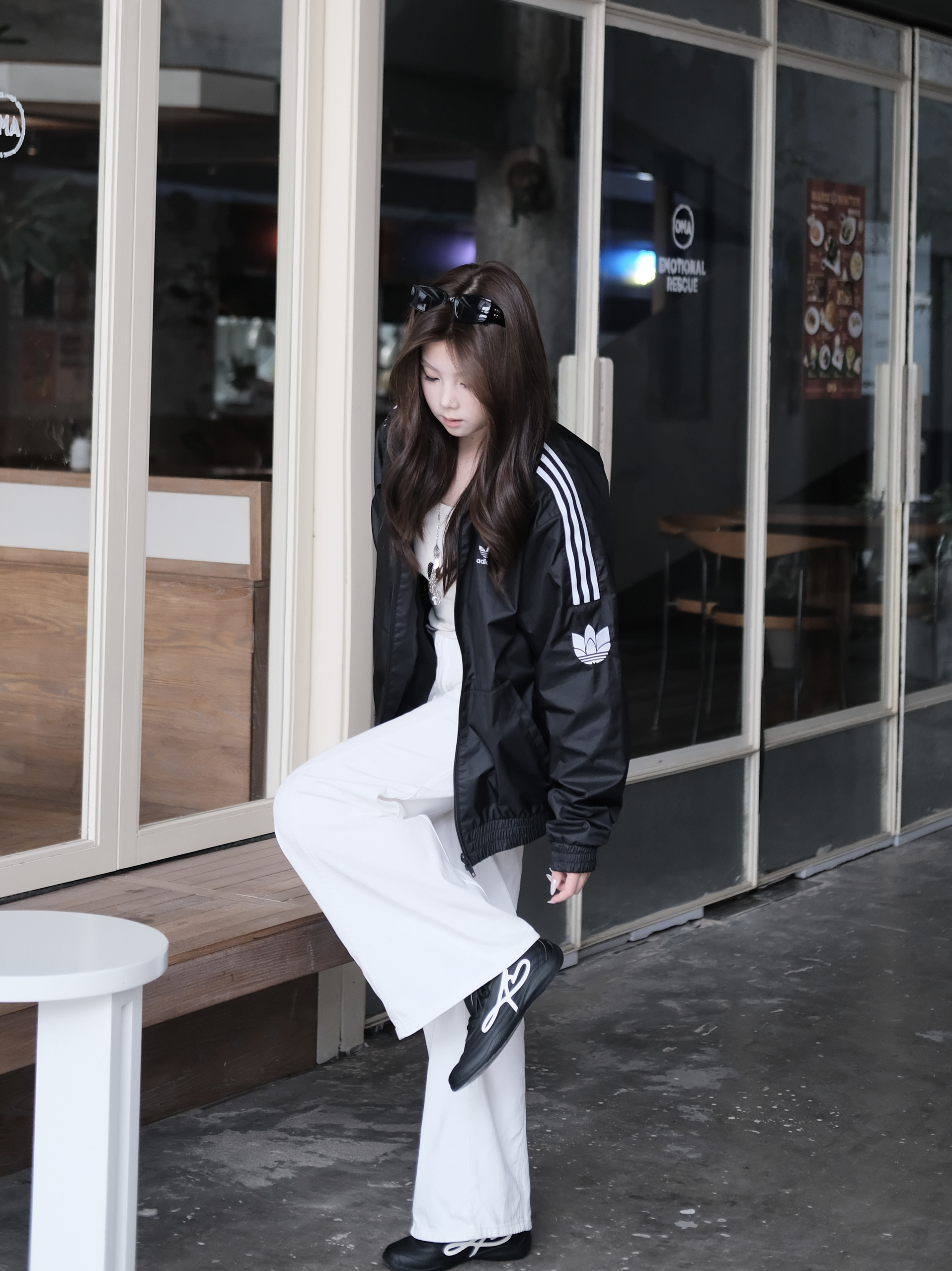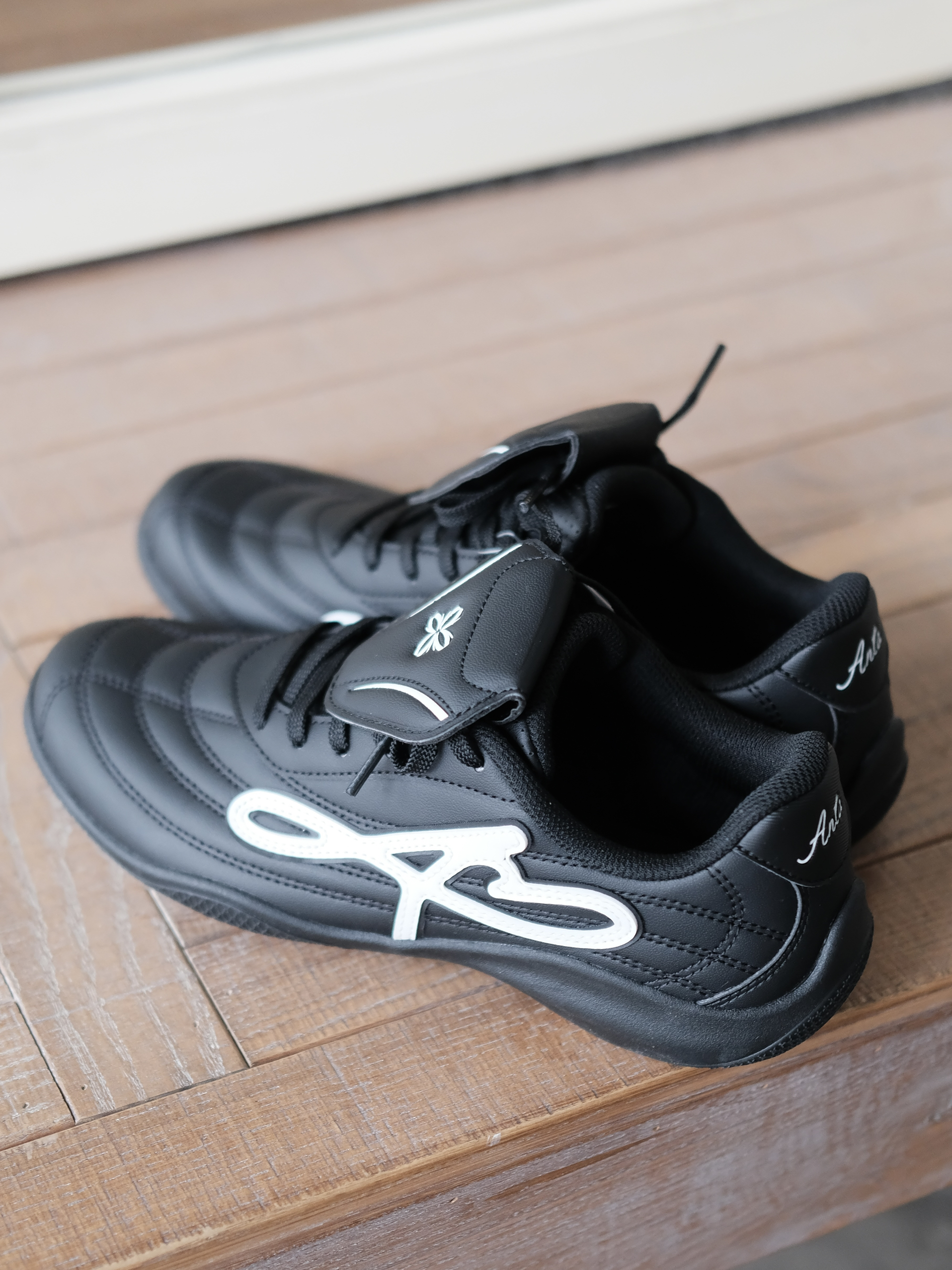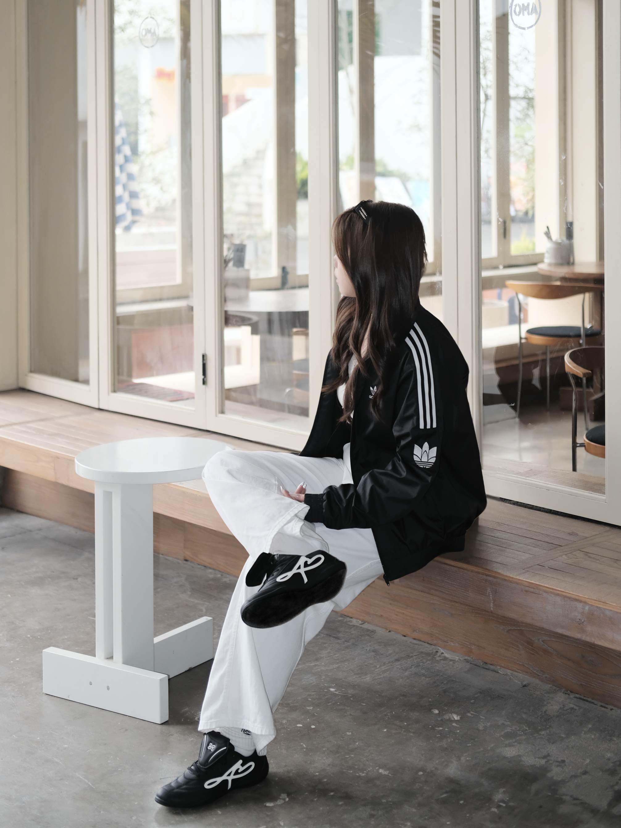 黑白配也能穿出不一样的感觉 脚上是安踏的德训鞋 鞋舌的盖盖感觉很有特点 薄底鞋穿上去脚感舒适 走久了也不累脚 日常搭配毫不费力~