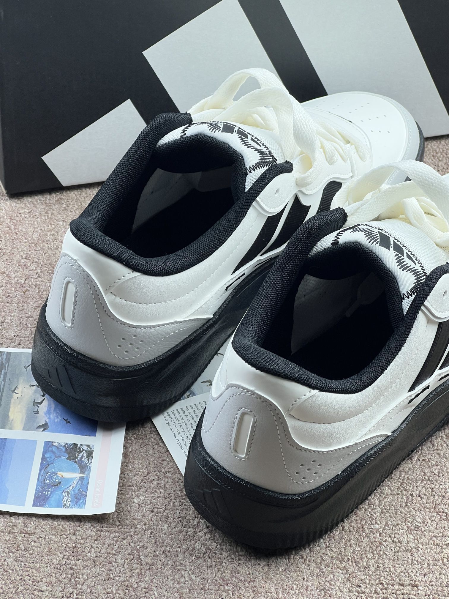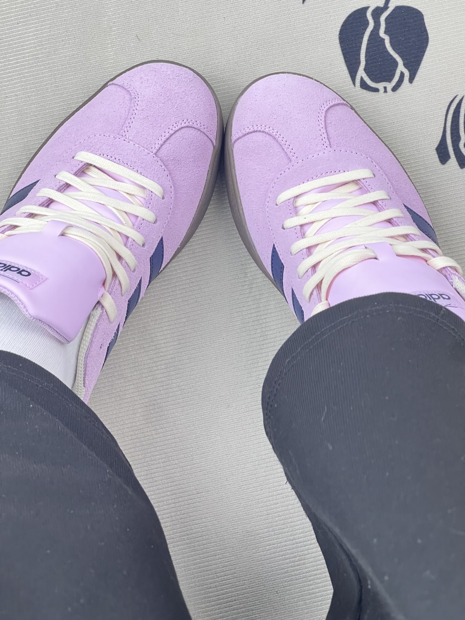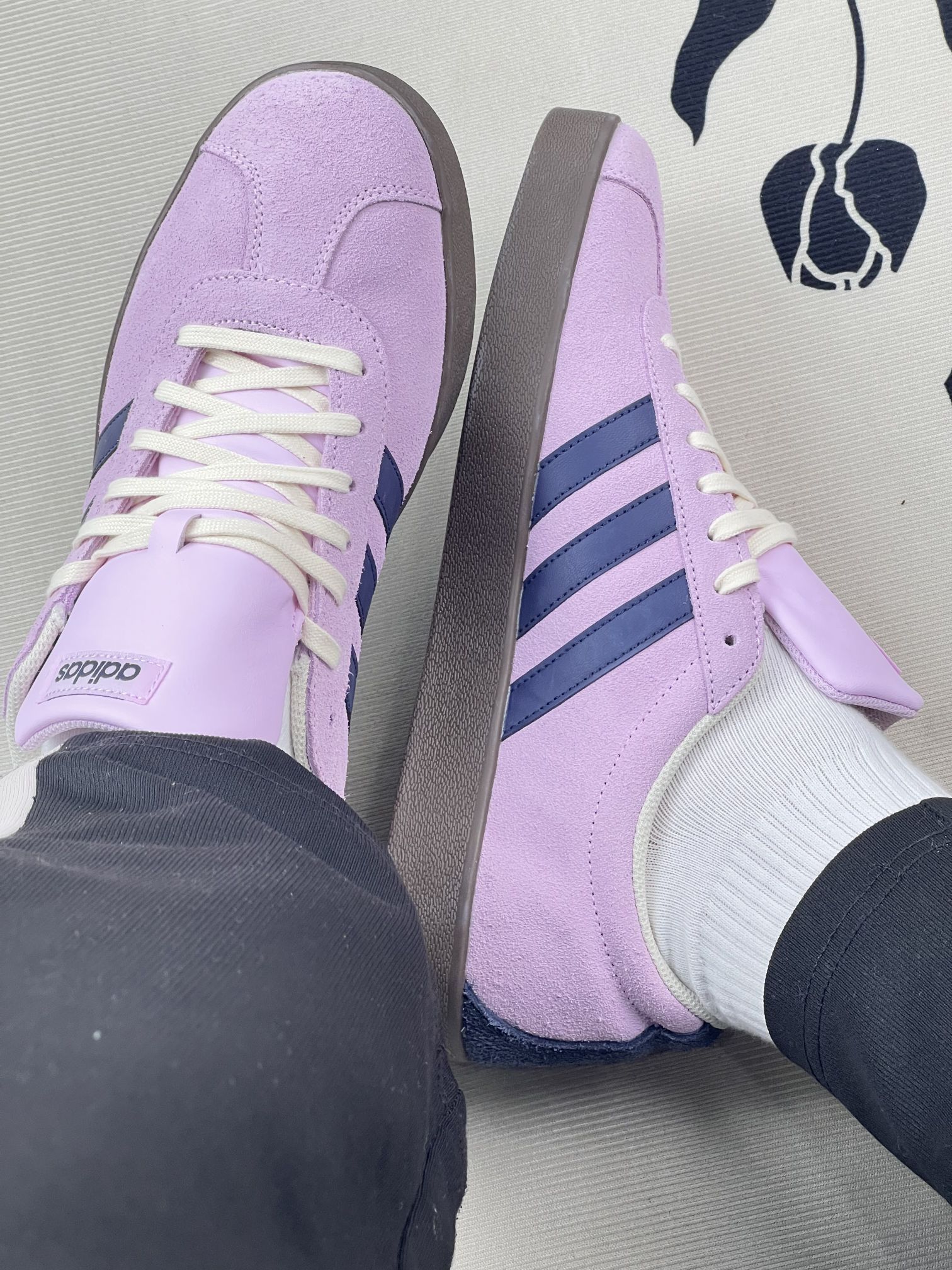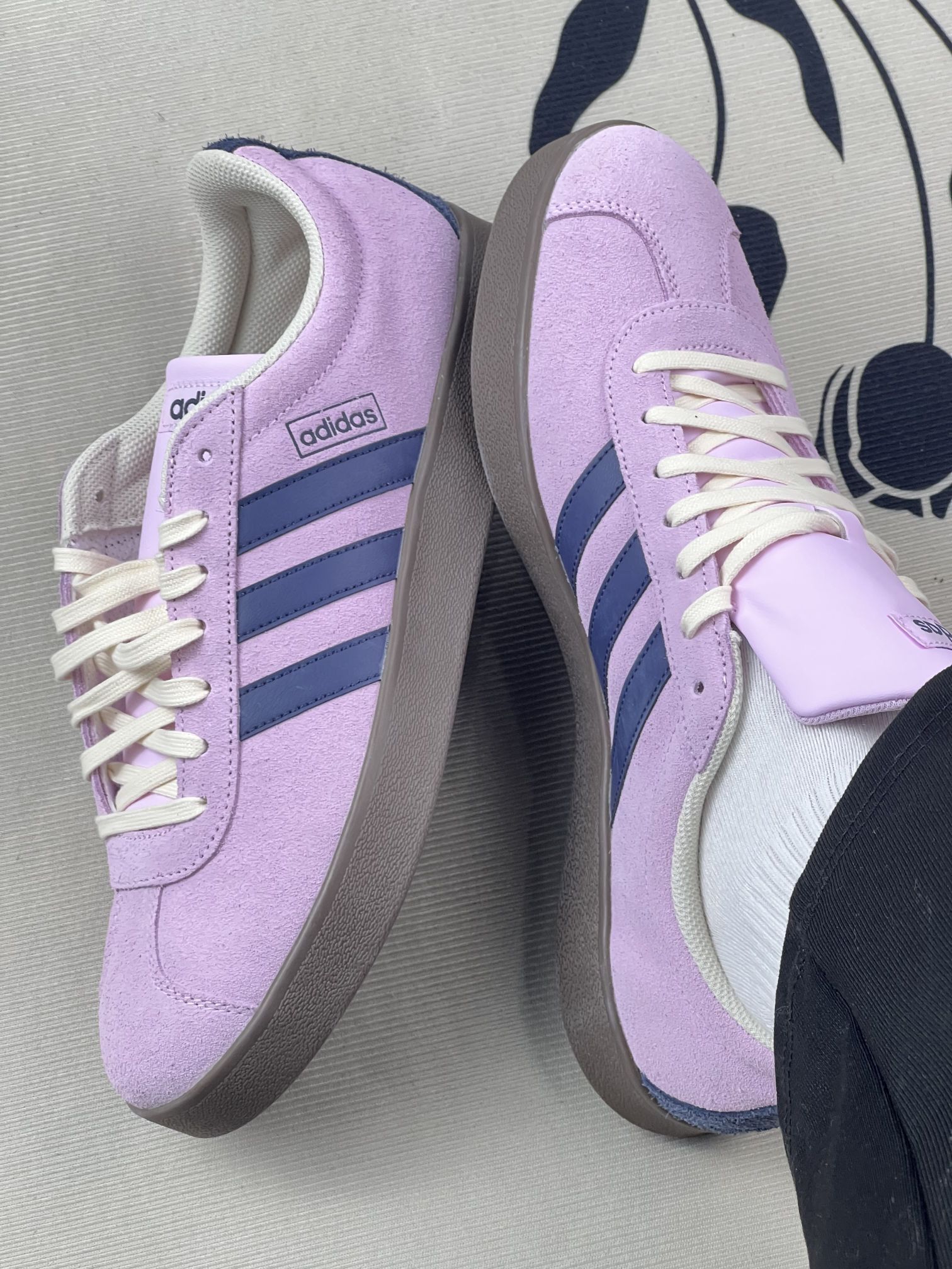 - 视觉与材质:浅粉紫麂皮+藏青三条杠,配色温柔,麂皮摸起来软但容易沾灰,浅色鞋面一踩就显脏,日常打理要费点劲😮💨。 - 上脚感受:鞋型偏窄,脚宽的话前掌会有点挤,刚穿时鞋口磨脚踝,需要穿长袜过渡。生胶底抓地力还行,但走路久了足弓会有点酸,支撑感一般。 - 搭配与细节:配牛仔裤、运动裤都很和谐,奶白鞋带和鞋口包边让整体更柔和。不过鞋舌偏厚,夏天穿会闷脚,透气性一般。 - 小遗憾:麂皮材质不耐造,...