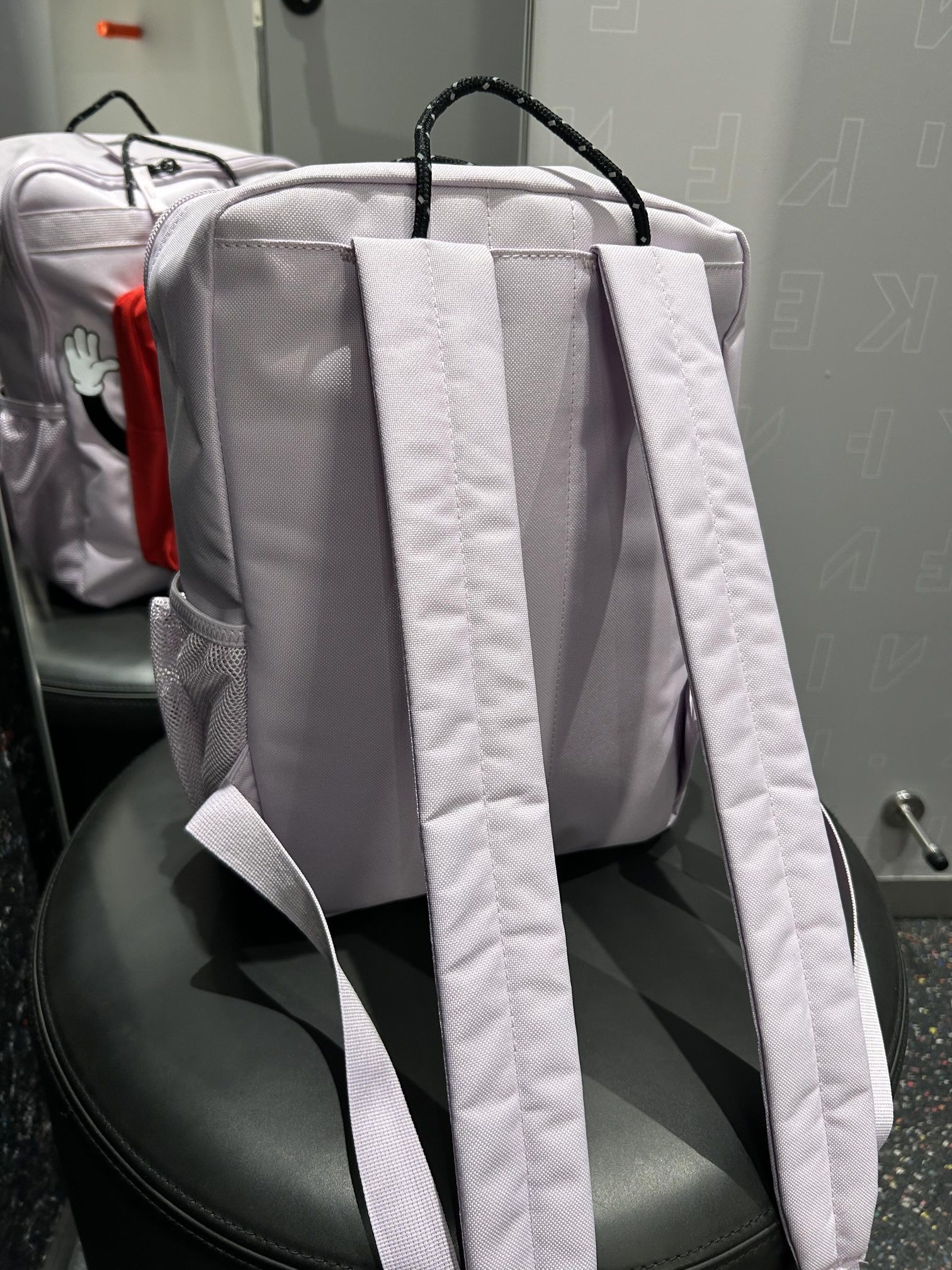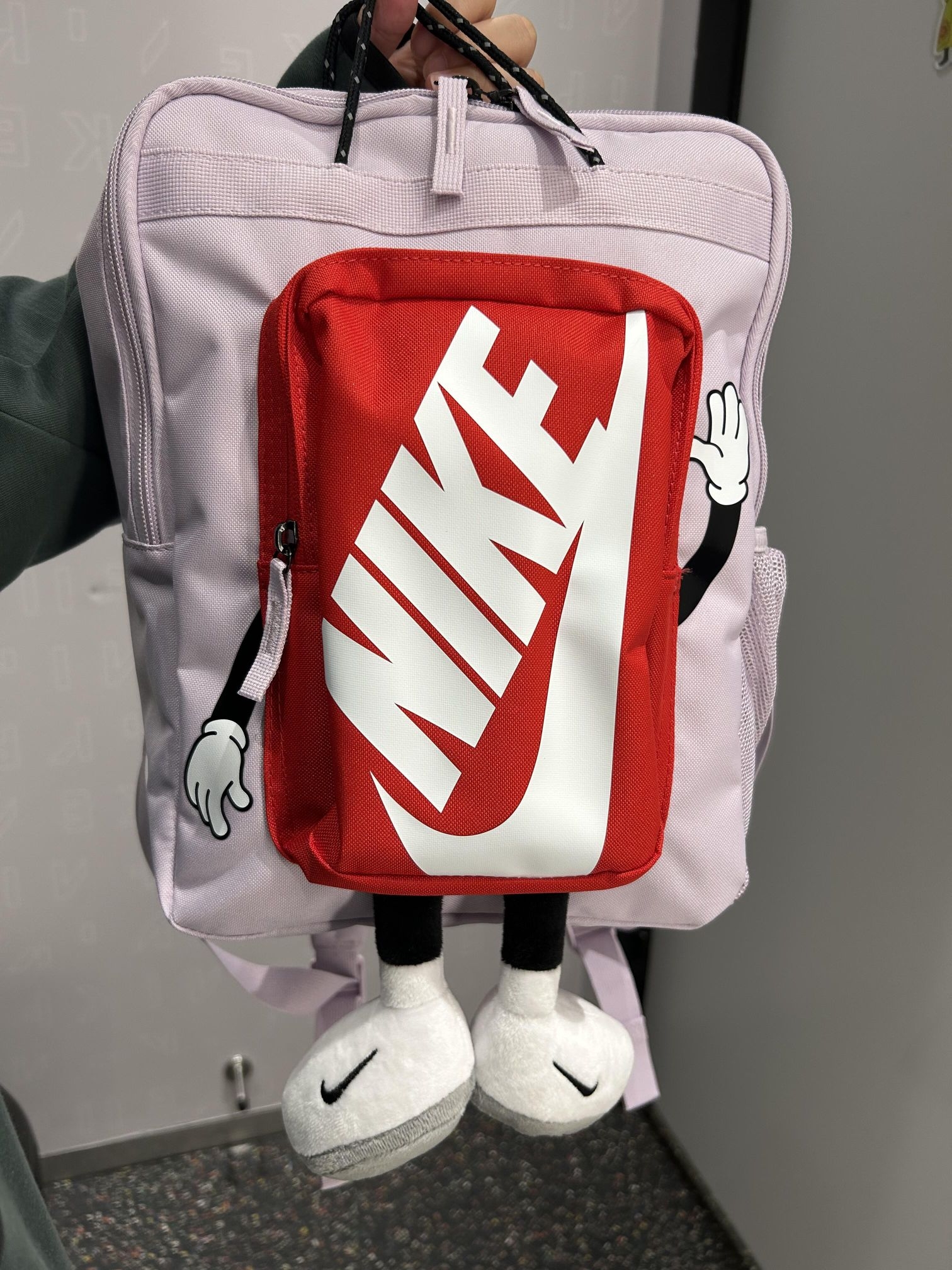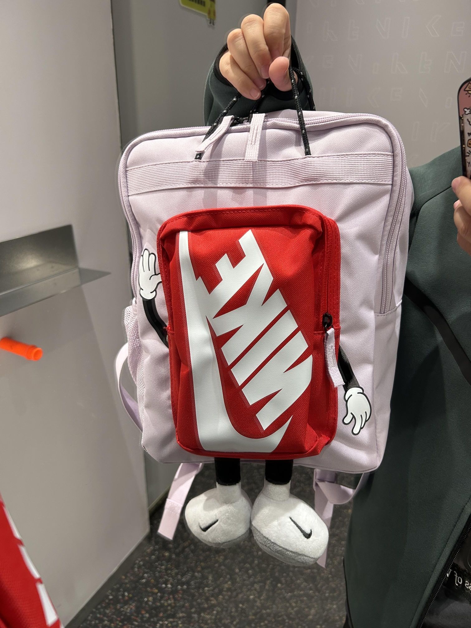 谁能拒绝一只自带萌点的背包啊! 这款淡紫色Nike背包,正面的红色口袋印着经典的白色Logo,设计师居然给它加上了一双卡通小手和小短腿。小手从两侧伸出来,仿佛在和你招手打招呼,背包下方还坠着两只毛绒绒的小脚丫,走起来一晃一晃的,可爱度直接拉满。 不仅颜值在线,实用性也完全够用。大容量主袋和前置口袋,装下书本、电脑和日常小物都没问题,侧边的网兜还能放水杯。不管是上学、通勤还是短途出游,它都能成为你穿...