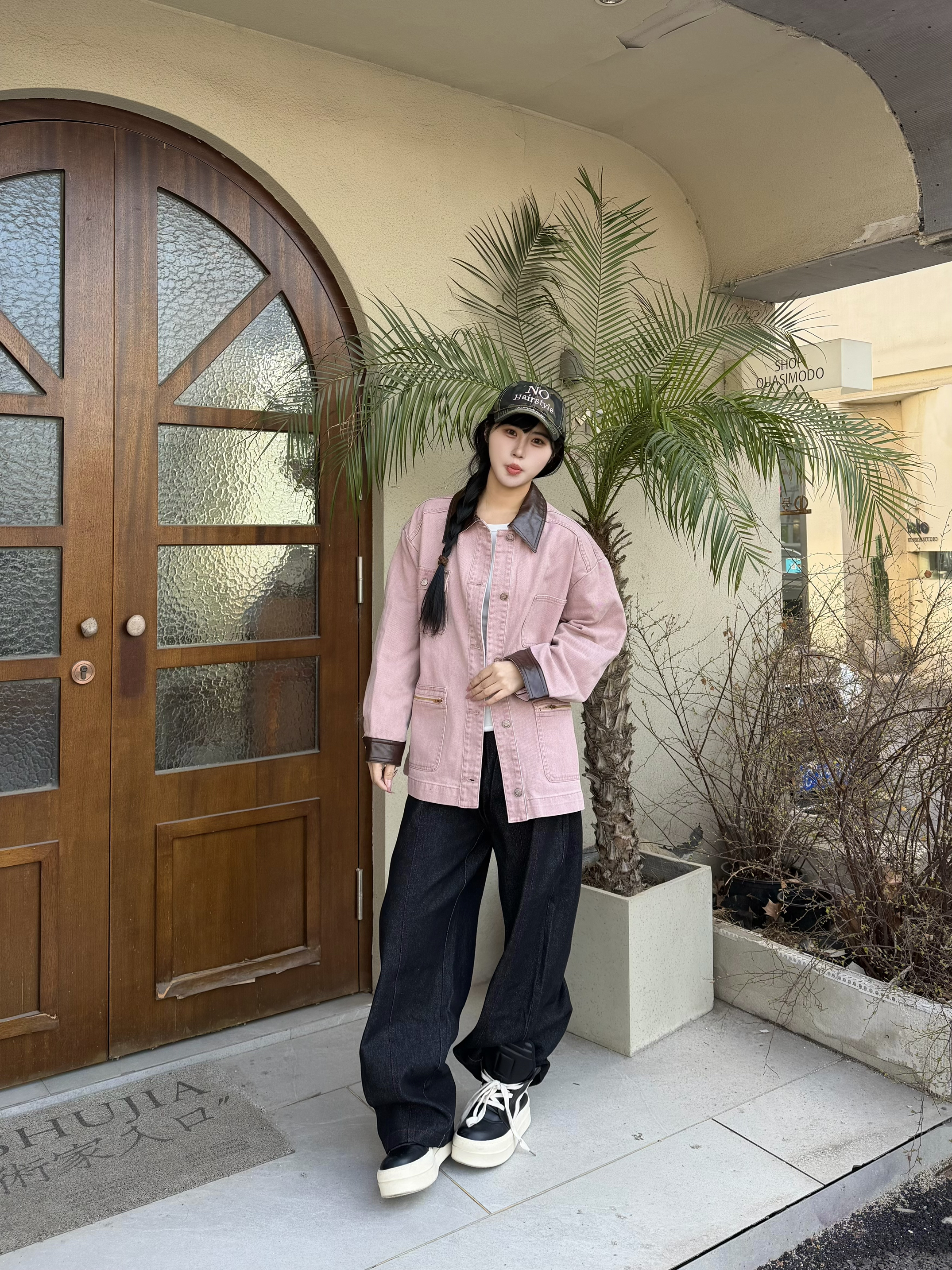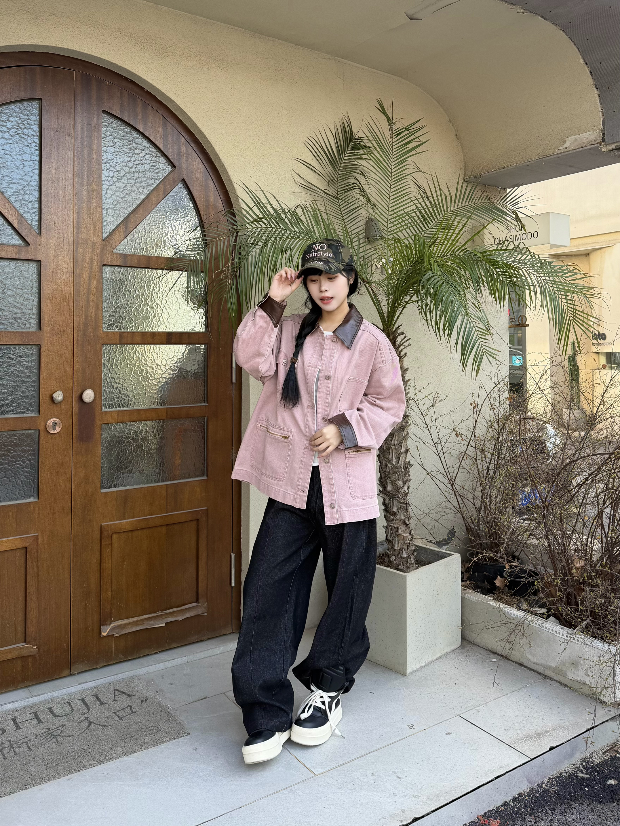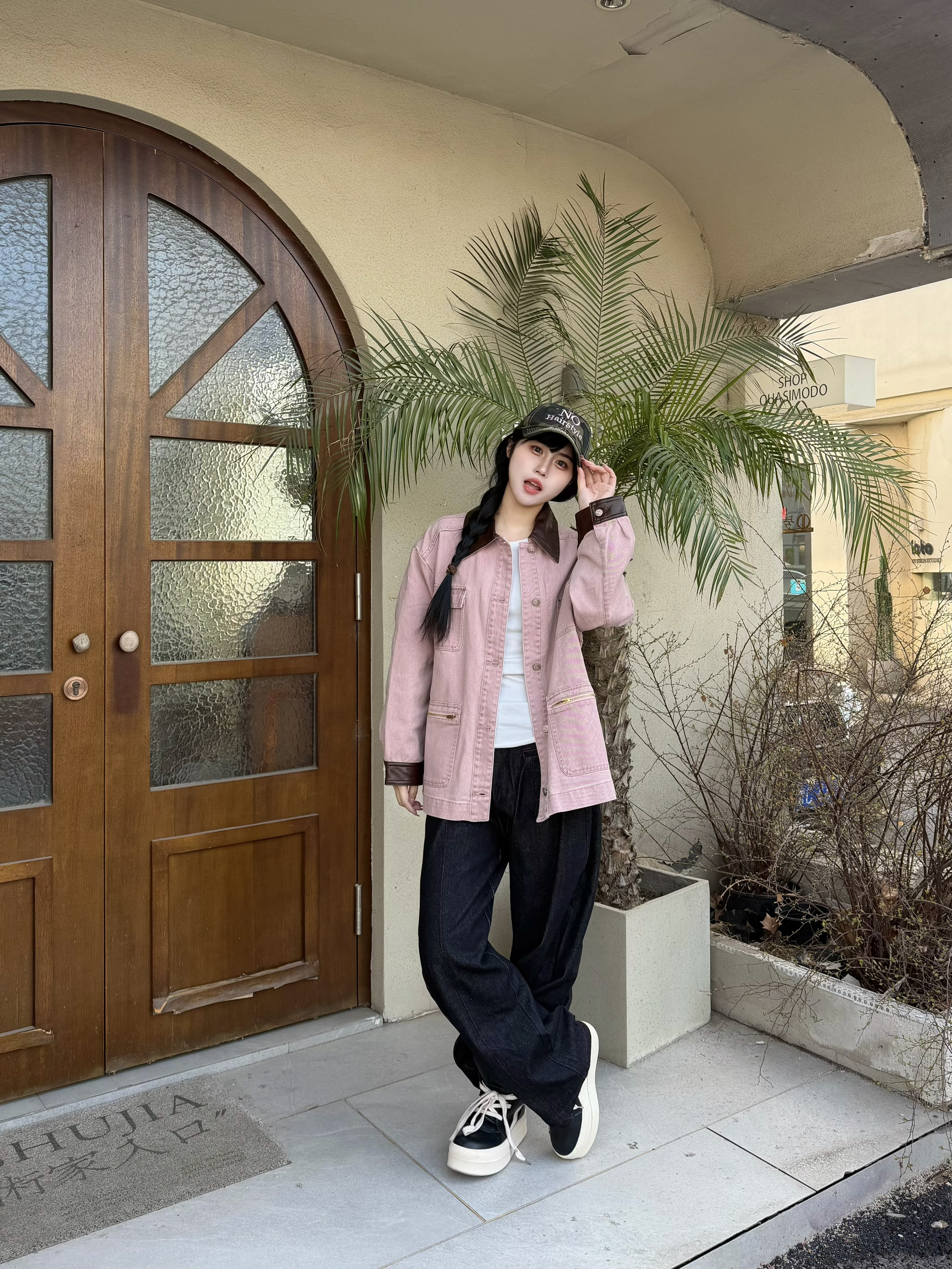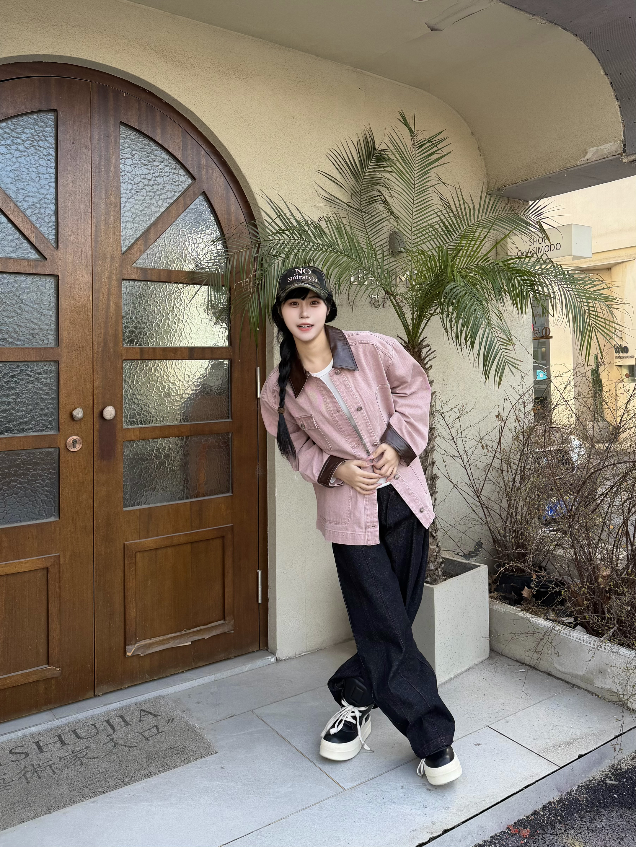 今天分享我的少女感穿搭 上衣穿了一件粉色的翻领外套 粉粉嫩嫩的颜色➕牛仔面料很高级 👖搭配黑色丹宁牛仔裤就很ok 最后带一个棒球帽🧢 春日氛围感轻松拿捏