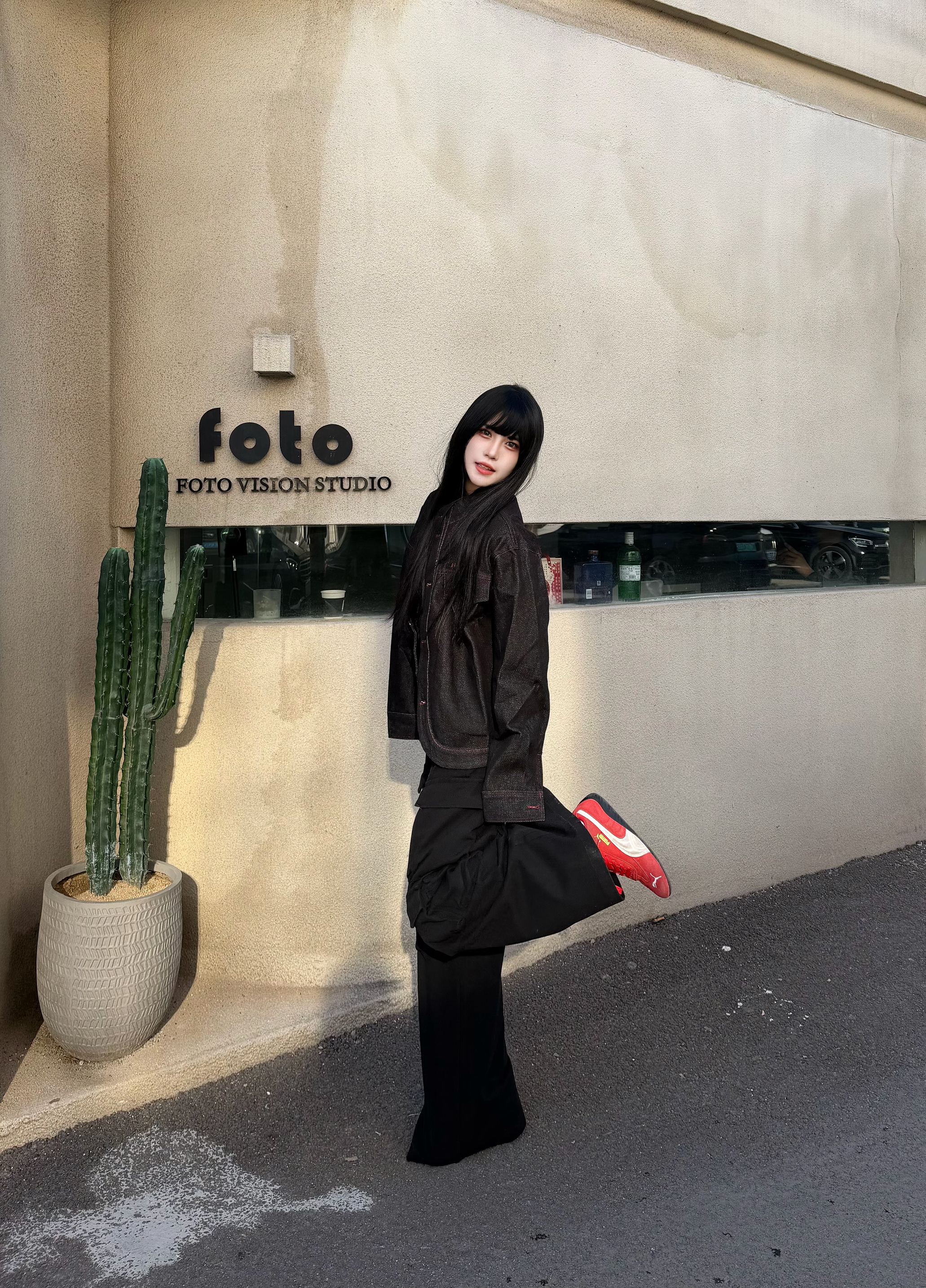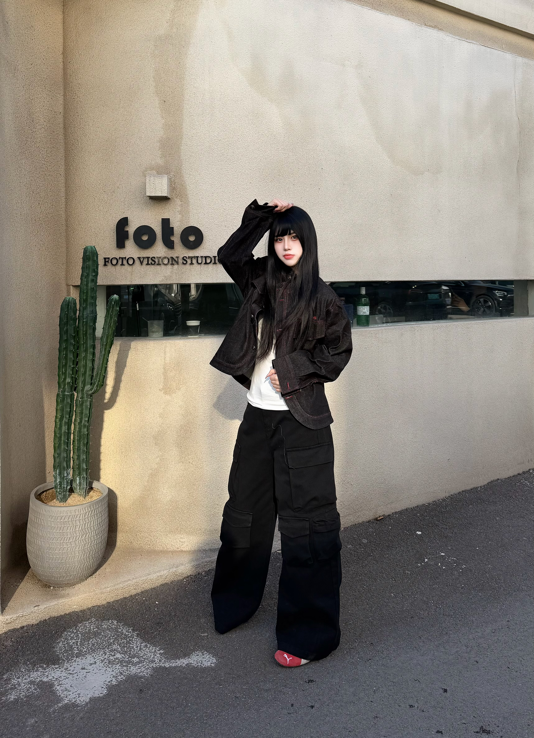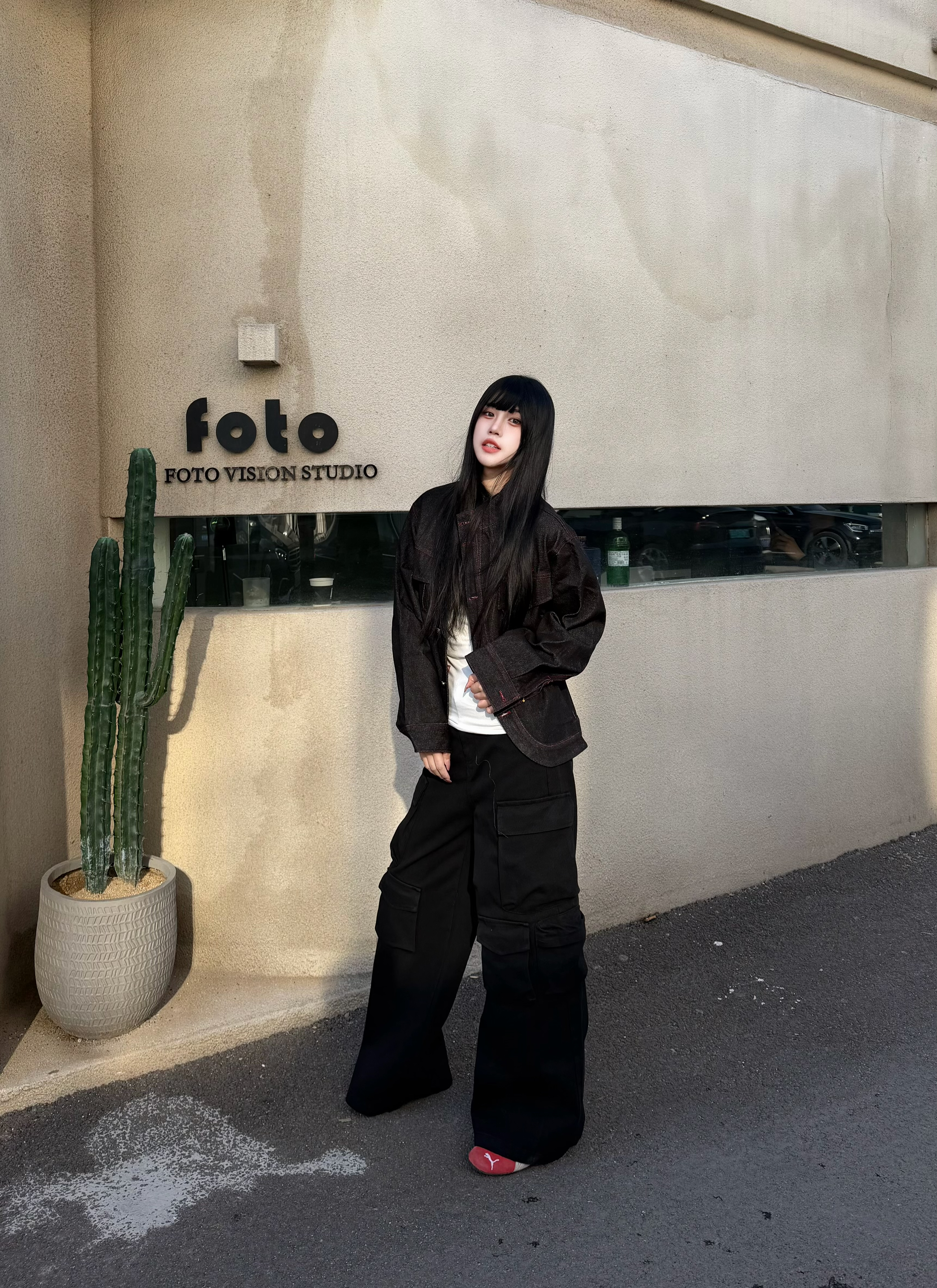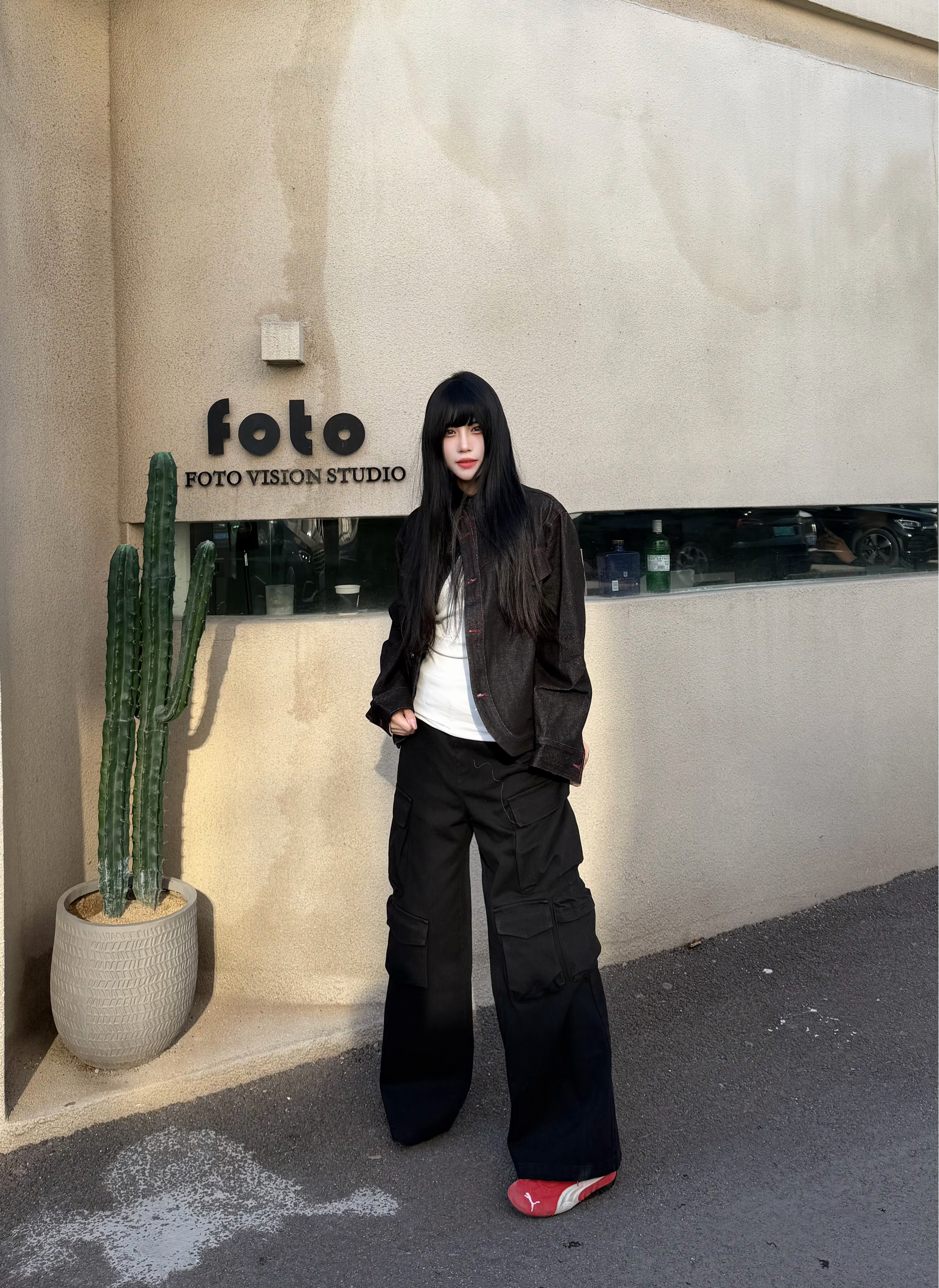 今天分享我的allblack穿搭 黑色系经典高级永不过时 👔上衣穿了黑色牛仔外套高级感满满 👖搭配的是黑色多口袋工装裤 最后穿一双红色的赛车鞋提升一下饱和度 红色搭配不仅两眼而且很有特点 春天穿赛车鞋 你学会了吗❓