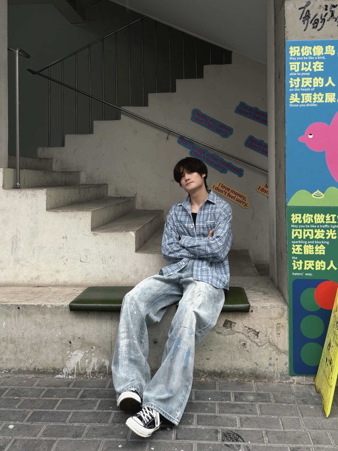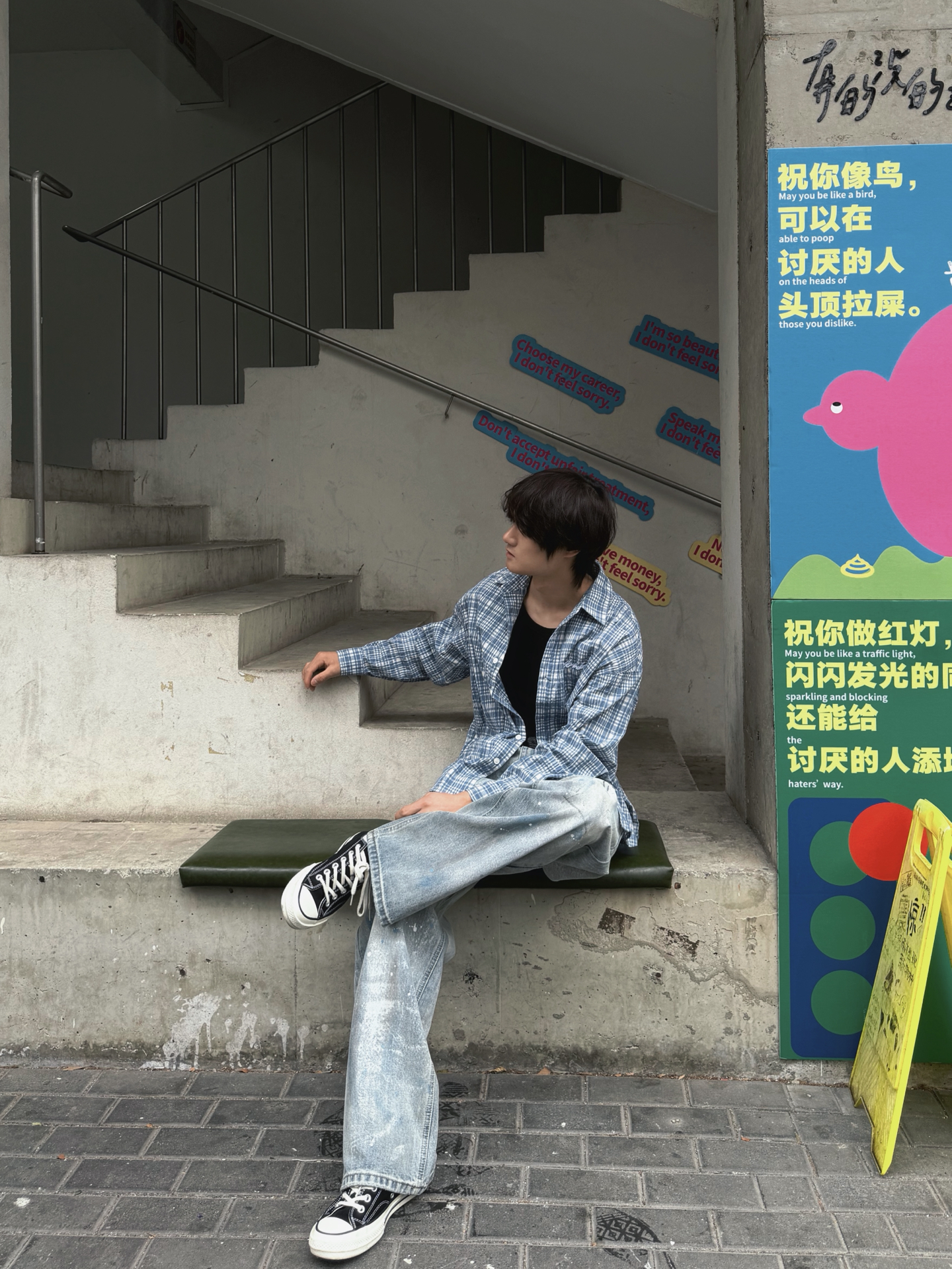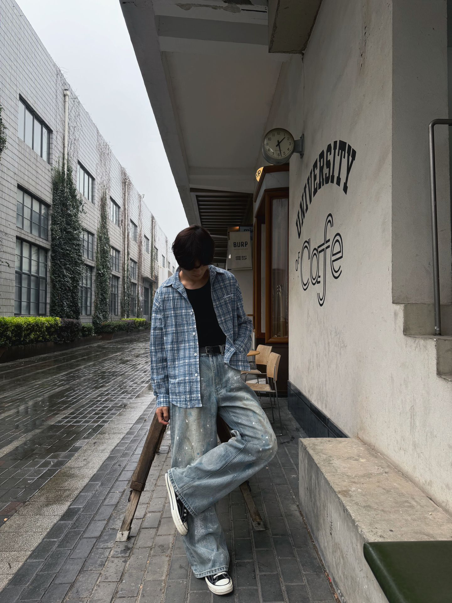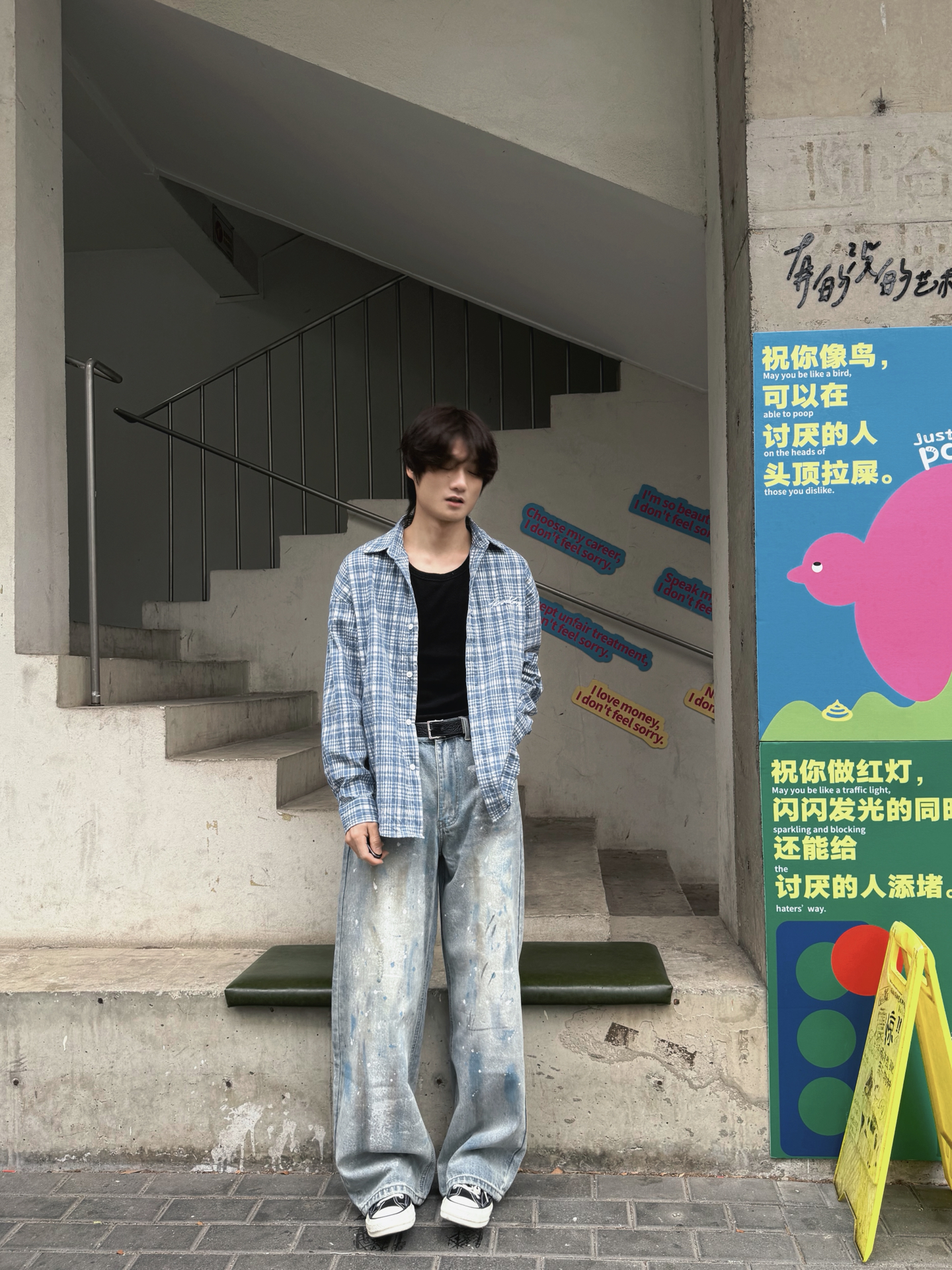 ootd | 雨天也挡不住的cityboy☔️ 蓝白格纹衬衫内搭黑T, 经典不出错的层次感✨ 搭配做旧泼墨牛仔裤, 宽松直筒版型一直都很喜欢 一点点做旧感正是潮流密码🔒 在湿漉漉的街道里,捕捉一份慵懒的松弛感。 #春日色彩预言家 #春天要把彩色穿个遍 #这条裤子我必买 #今日份穿百搭牛仔裤 #我真的超会穿