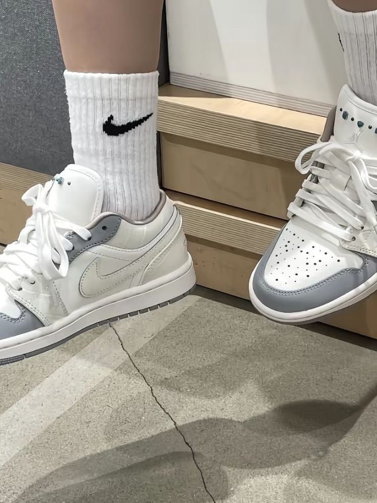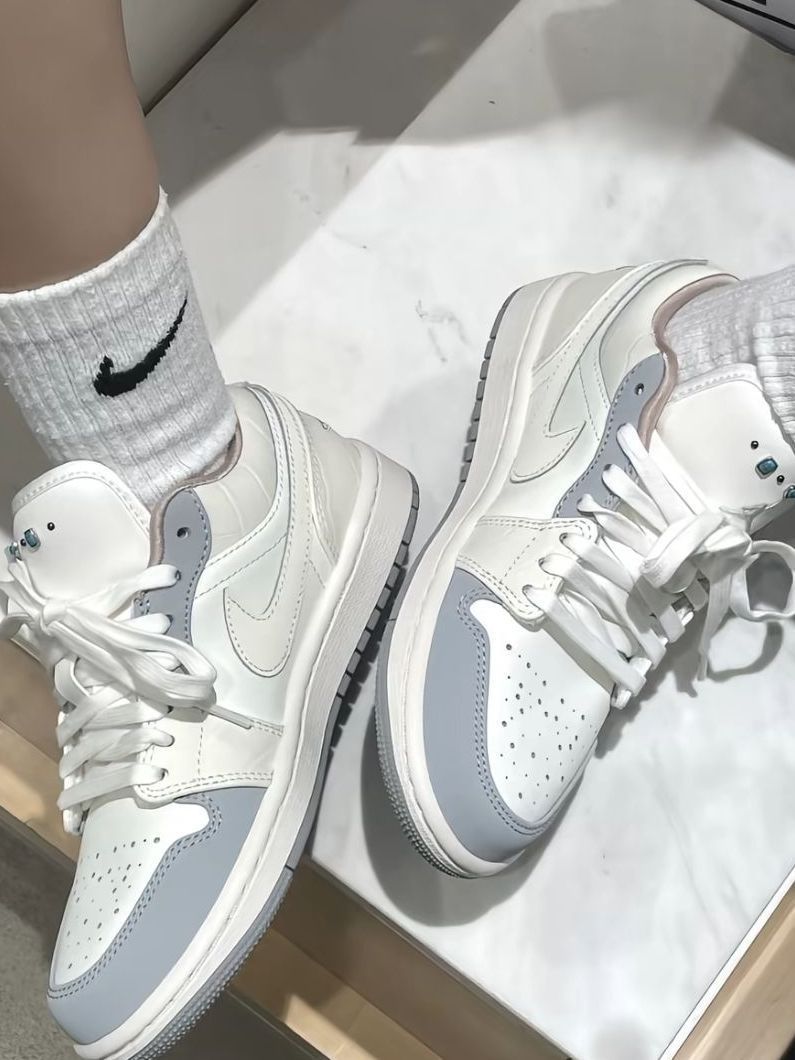 谁能拒绝这双奶fufu的AJ1 Low啊!奶白+浅灰拼色像一杯海盐奶盖,清爽又显气质,鞋侧小珍珠装饰增添精致感,温柔又减龄。经典低帮版型,脚感舒适不磨脚,不管是搭牛仔裤、百褶裙还是休闲裤,都能轻松营造出春日慵懒氛围感,通勤、约会、出游都适配!