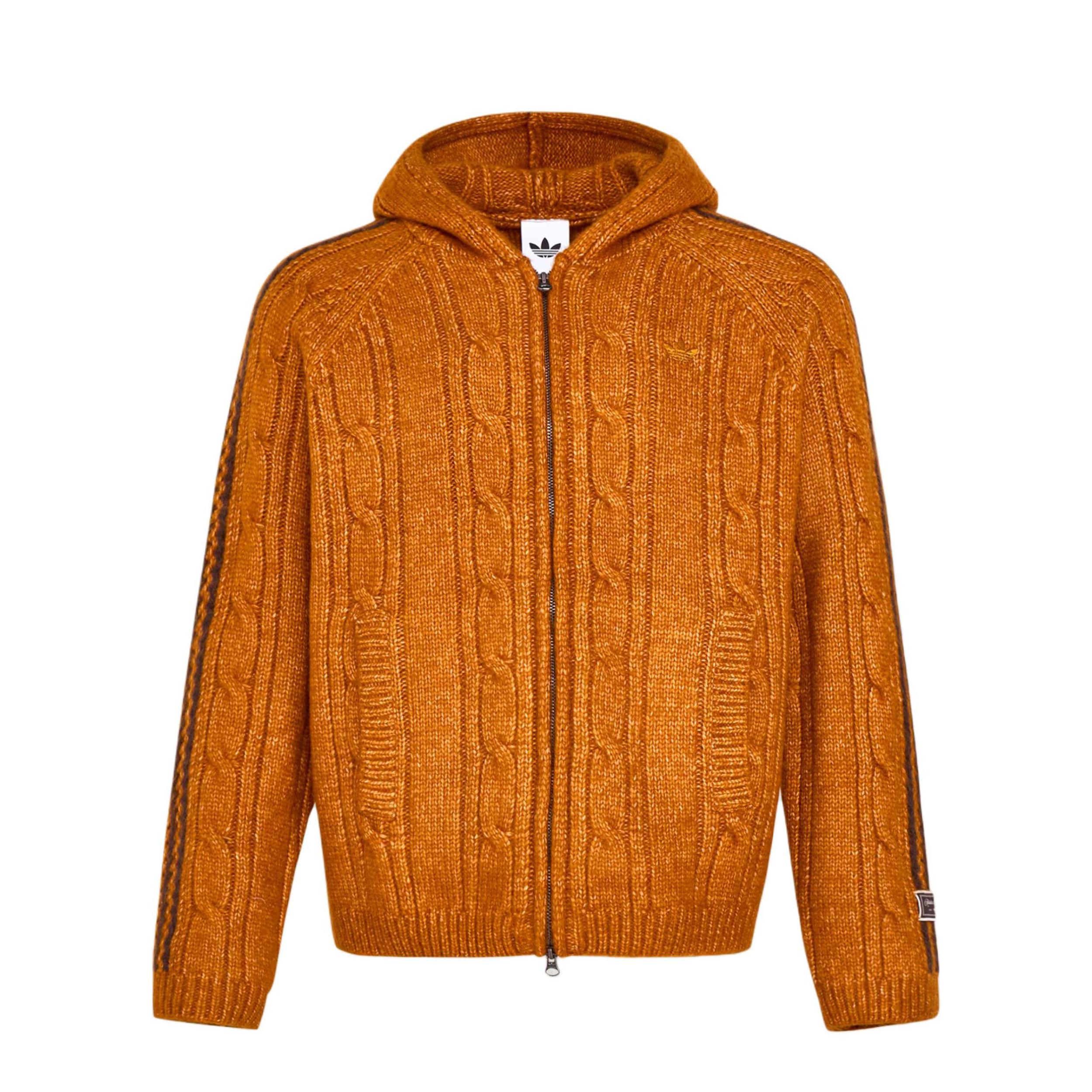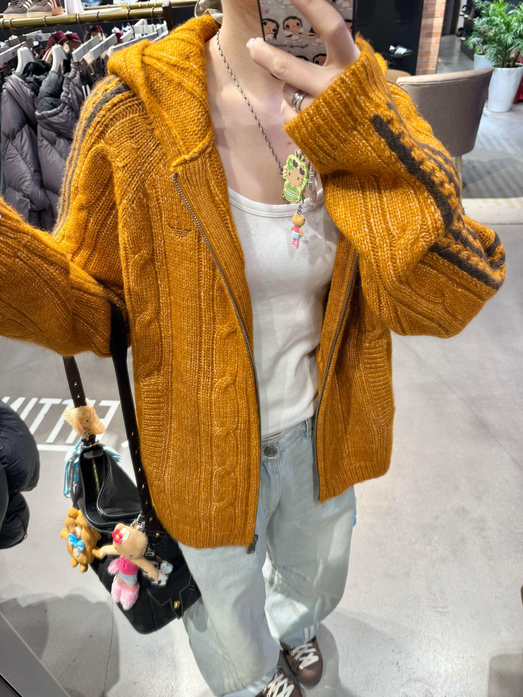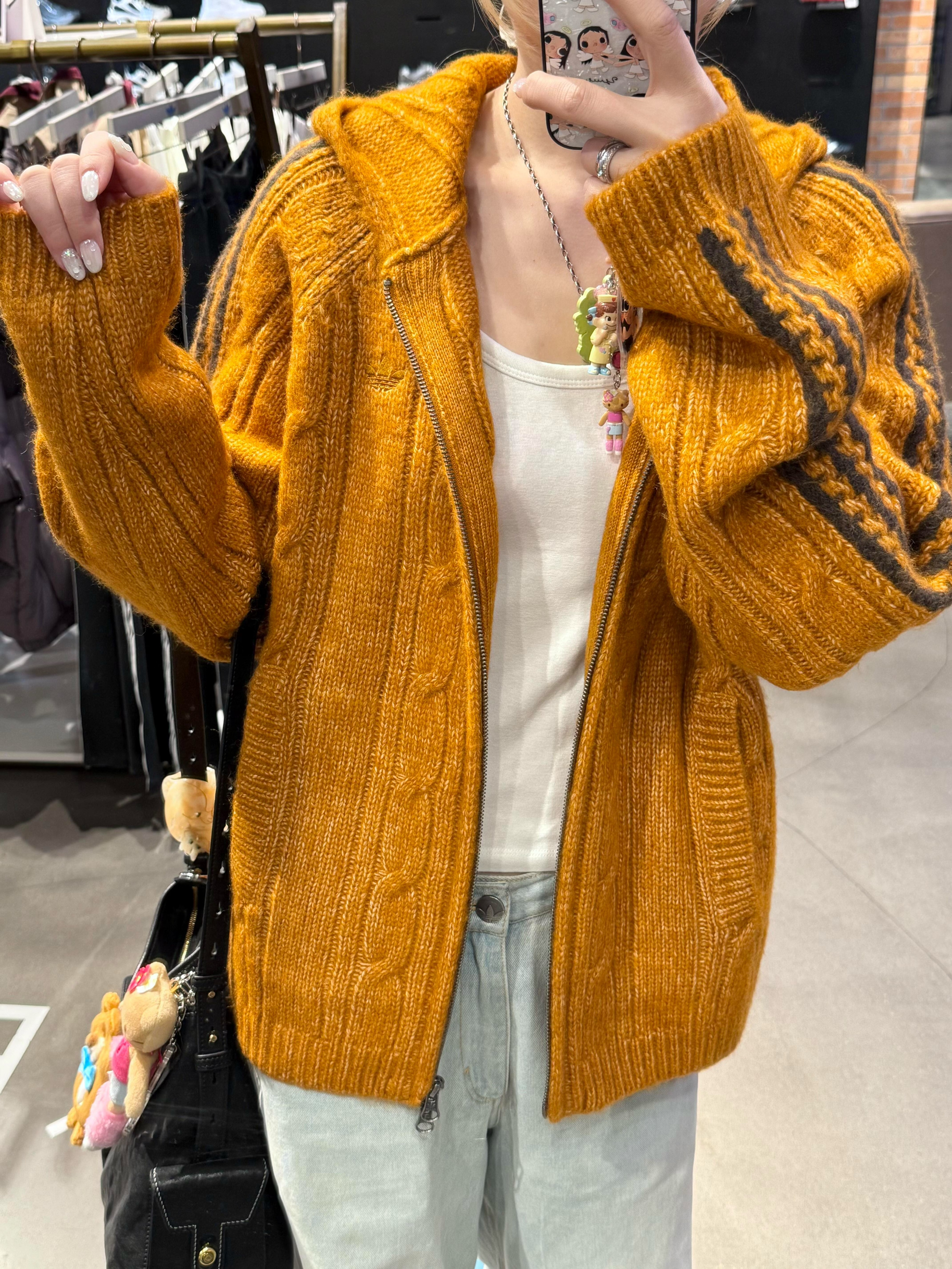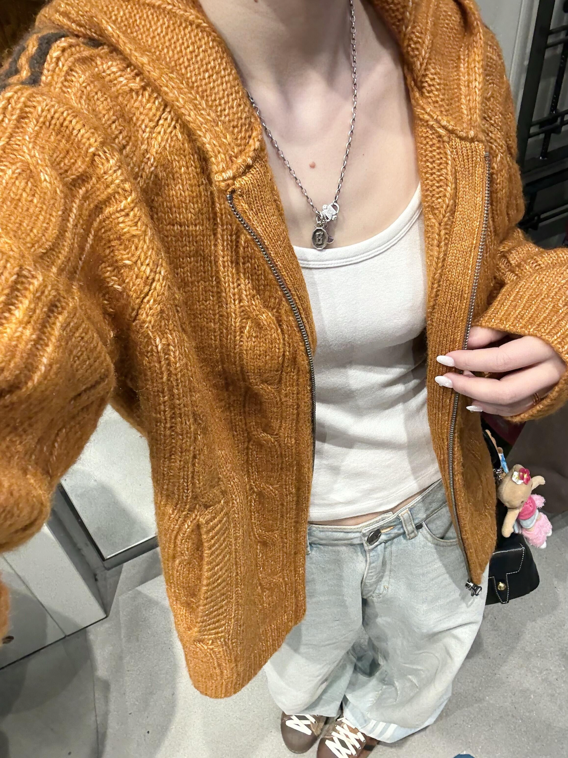 阿迪贝贝们|永远喜欢这种简简单单的穿搭~🧡 秋冬衣柜里必须有一件南瓜色🎃针织开衫! 粗麻花的纹理超有质感,软糯又耐看。 连帽设计带点甜酷感, 条纹撞色瞬间让穿搭不单调~ 宽松版型藏肉又舒服, 搭配浅色牛仔裤👖,一整个随性美式复古风。 焦糖棕衬得肤色白到发光啦~ 温柔又不挑人,get同款闭眼入不亏!
