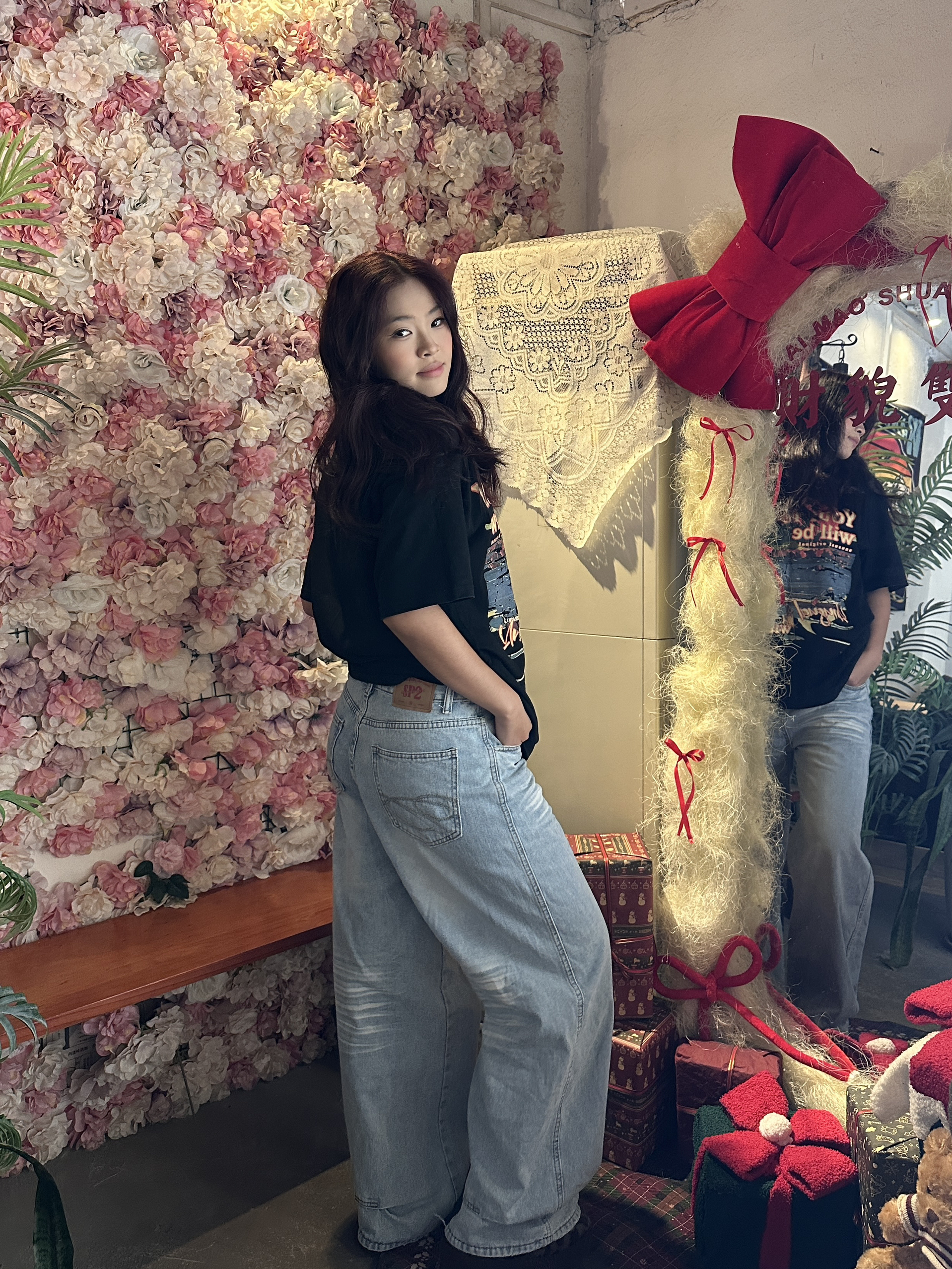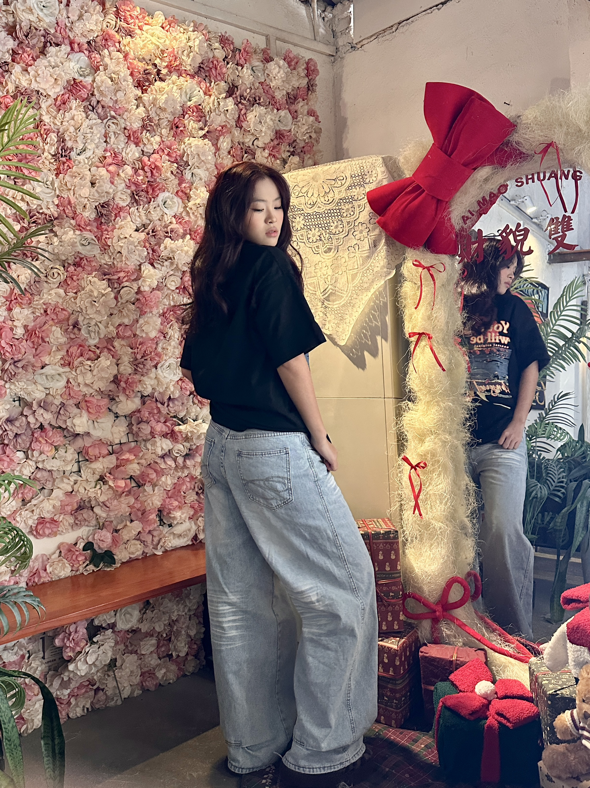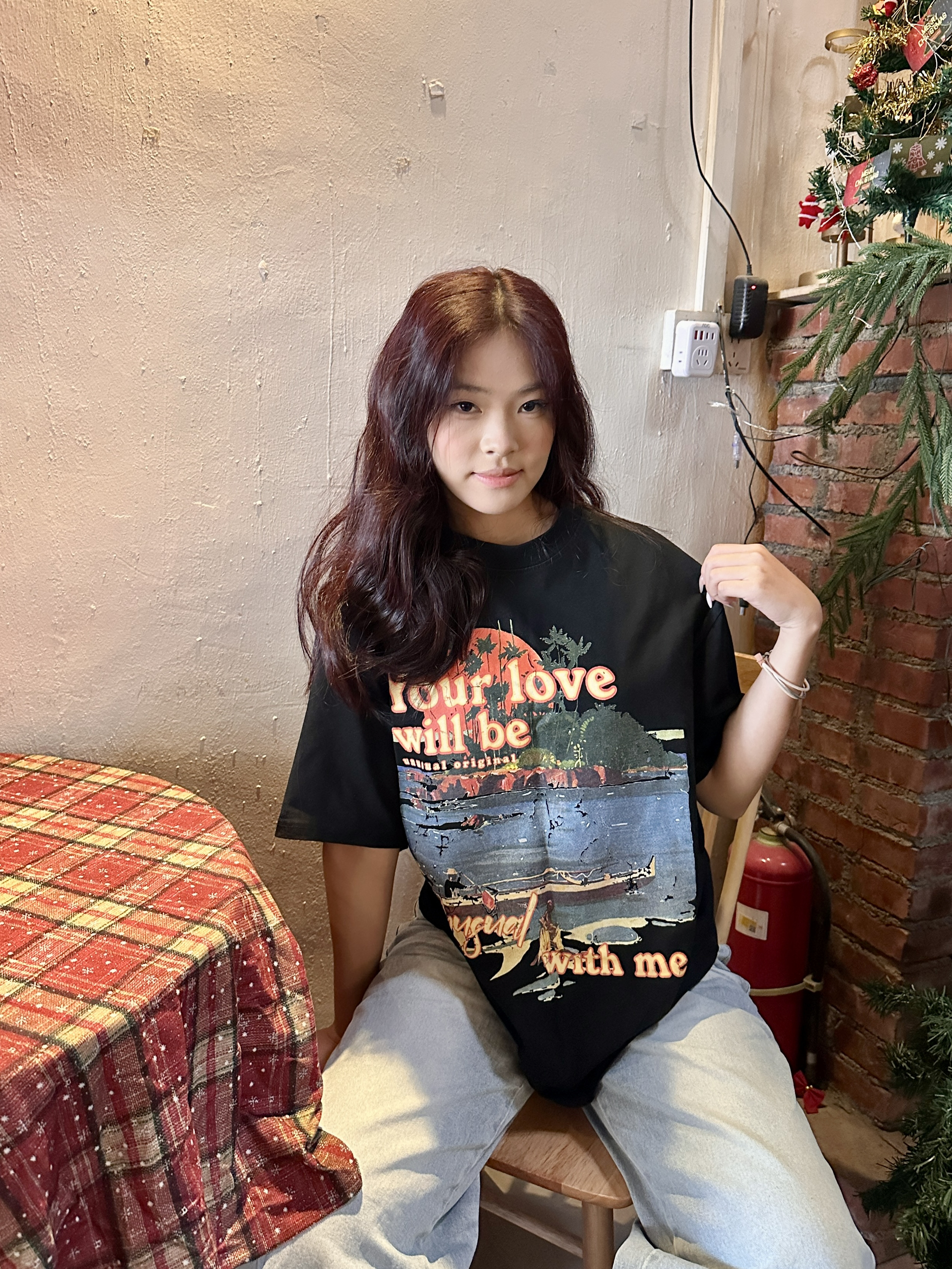 身高|体重:168cm/118斤 🧍♂️ 穿搭风格:oversized风 👔 上衣:oversized版型,宽松随性,能藏住身材小缺点。正面的风景+英文印花,自带美式复古滤镜,和圣诞场景也很适配。 • 黑色底色百搭耐脏,单穿或叠穿都好看,是四季都能穿的基础款。 👖 下装:高腰+宽松直筒版型,修饰腿型,对梨形身材很友好。浅蓝水洗色和黑色上衣形成经典配色,视觉上更清爽。 • 裤长刚好盖住...