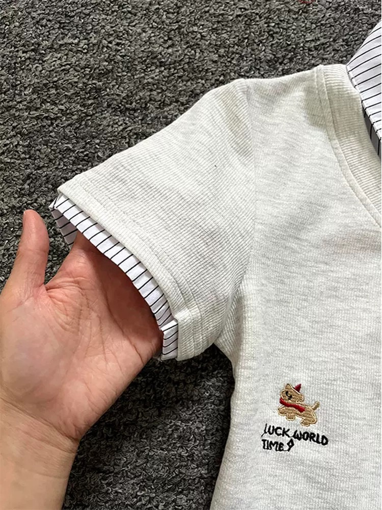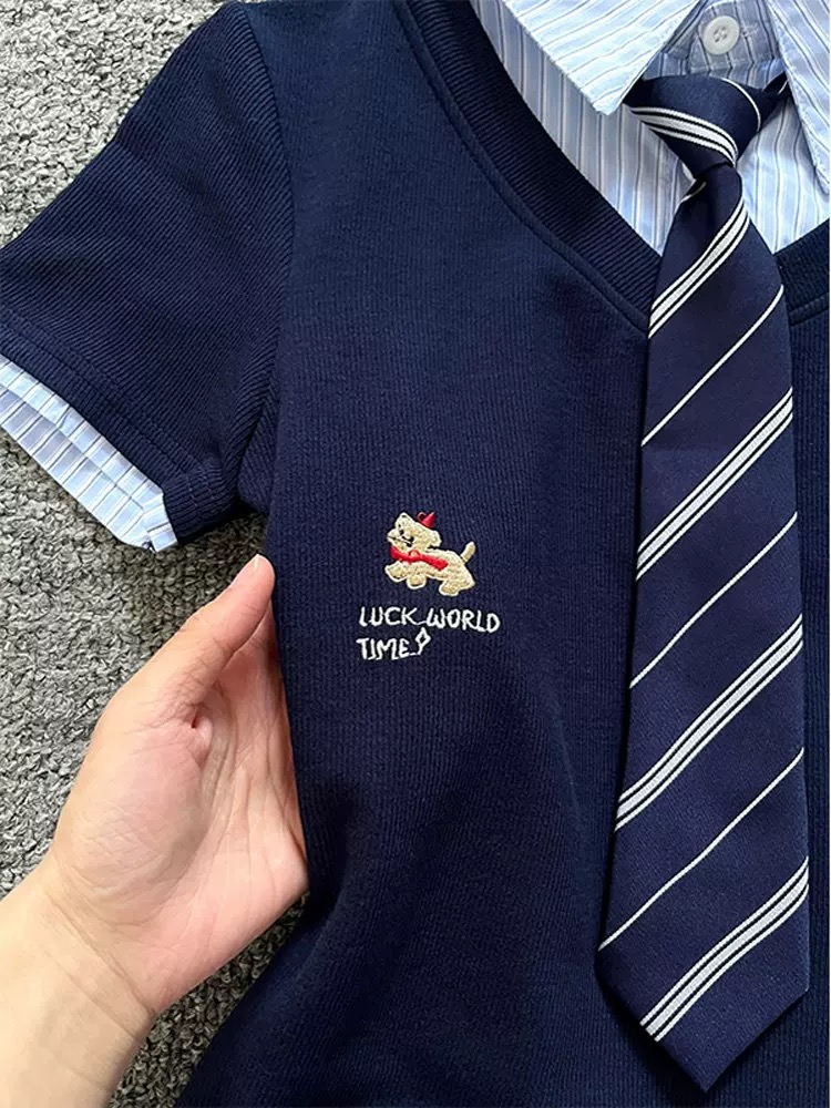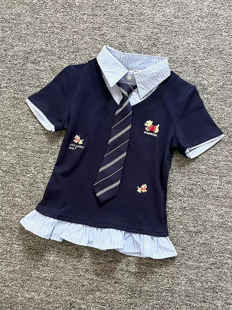 浅灰底色温柔又显白👌 自带领带的假两件短袖,简直是甜妹天菜💖 浅灰针织面料软糯亲肤,条纹翻领+藏青条纹领带,一秒get美式学院风,乖巧又时髦~
