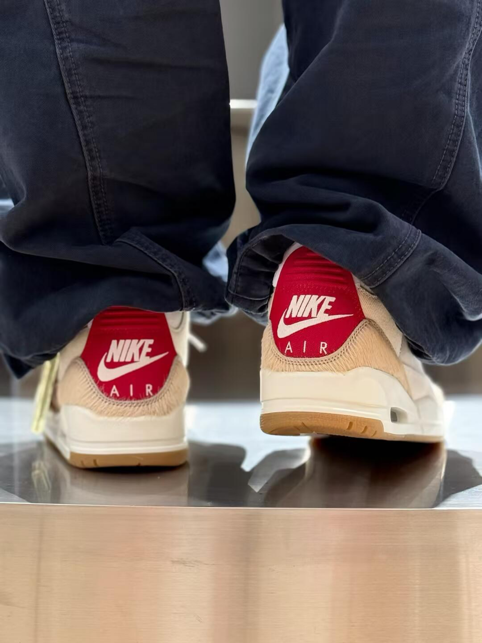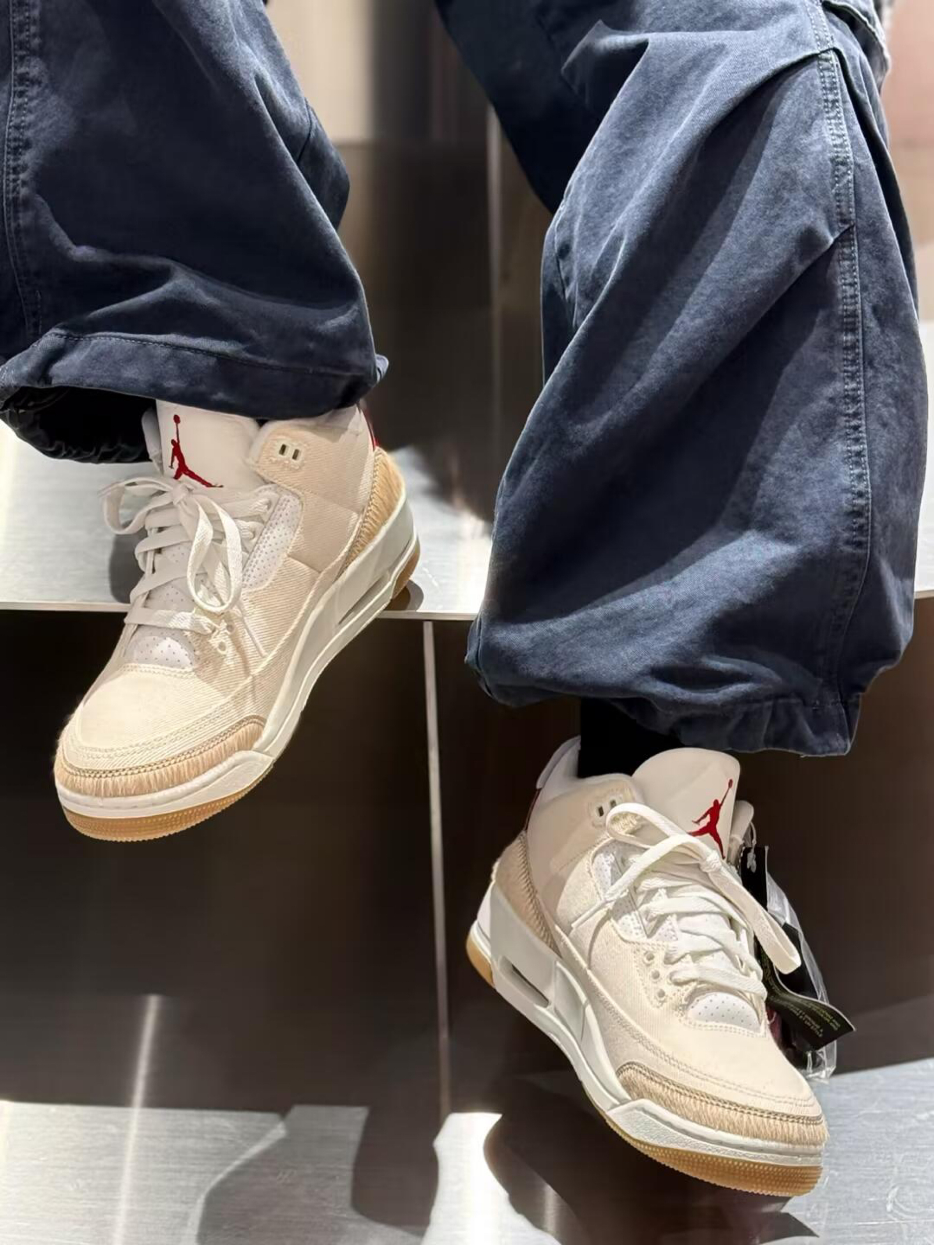 身为双厨狂喜的重磅联名,这双AJ3从里到外细节拉满。 鞋身采用Levi’s标志性米白原色丹宁布, 摸上去肌理感十足,比普通皮质更有复古故事感, 日常穿还能慢慢养出专属包浆,越穿越有味道✨。 最绝的是把经典爆裂纹,直接换成仿马毛材质, 温柔奶fufu的浅棕调,完美呼应马年主题, 高级感、氛围感、辨识度一步拉满。 复古鞋型+丹宁质感+马毛细节, 不管是配牛仔裤、工装裤还是休闲裤, 随手一套就是美式...