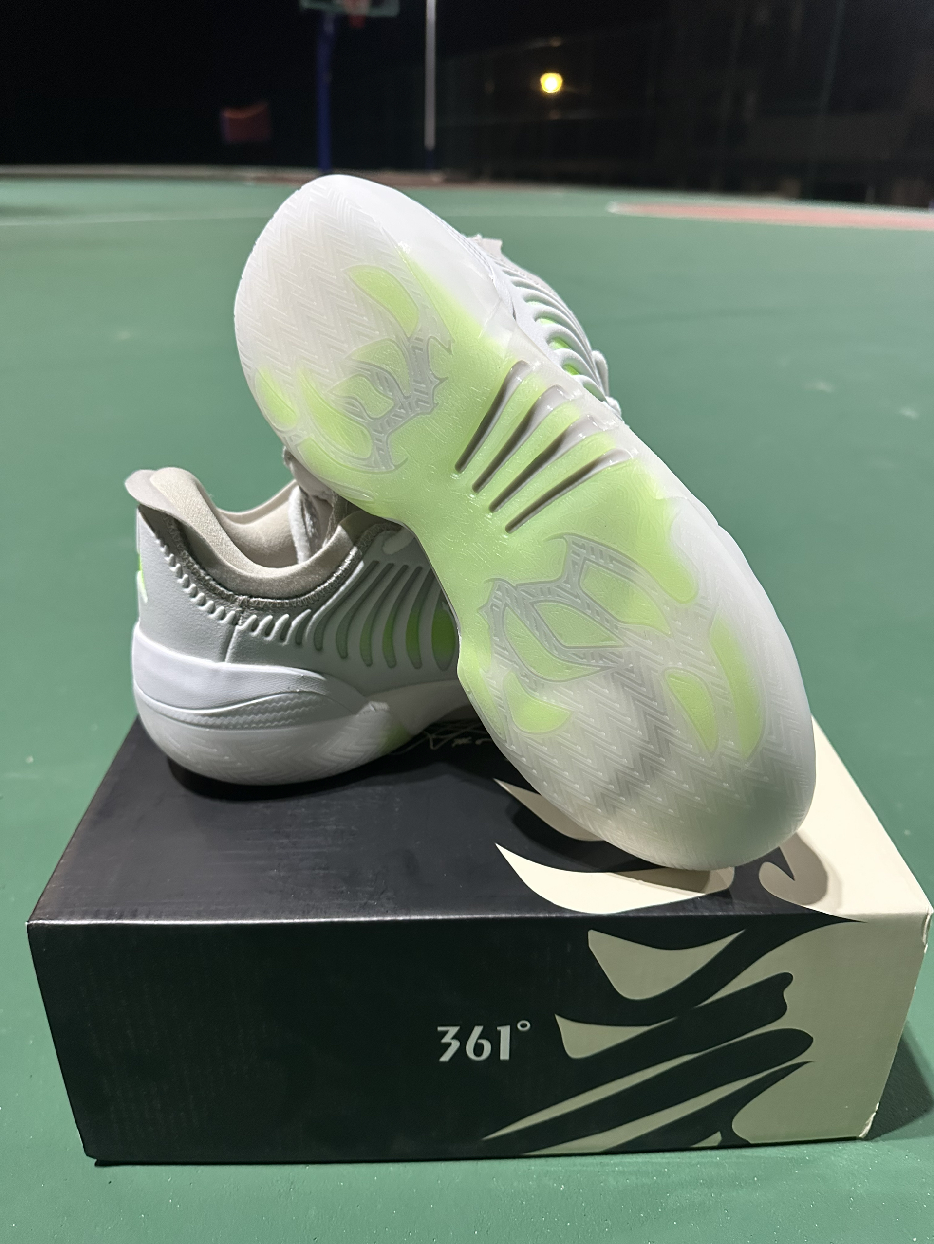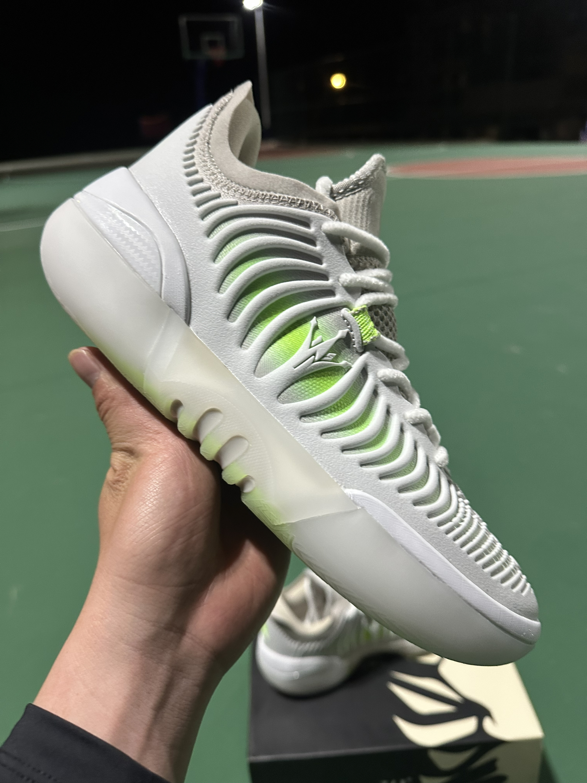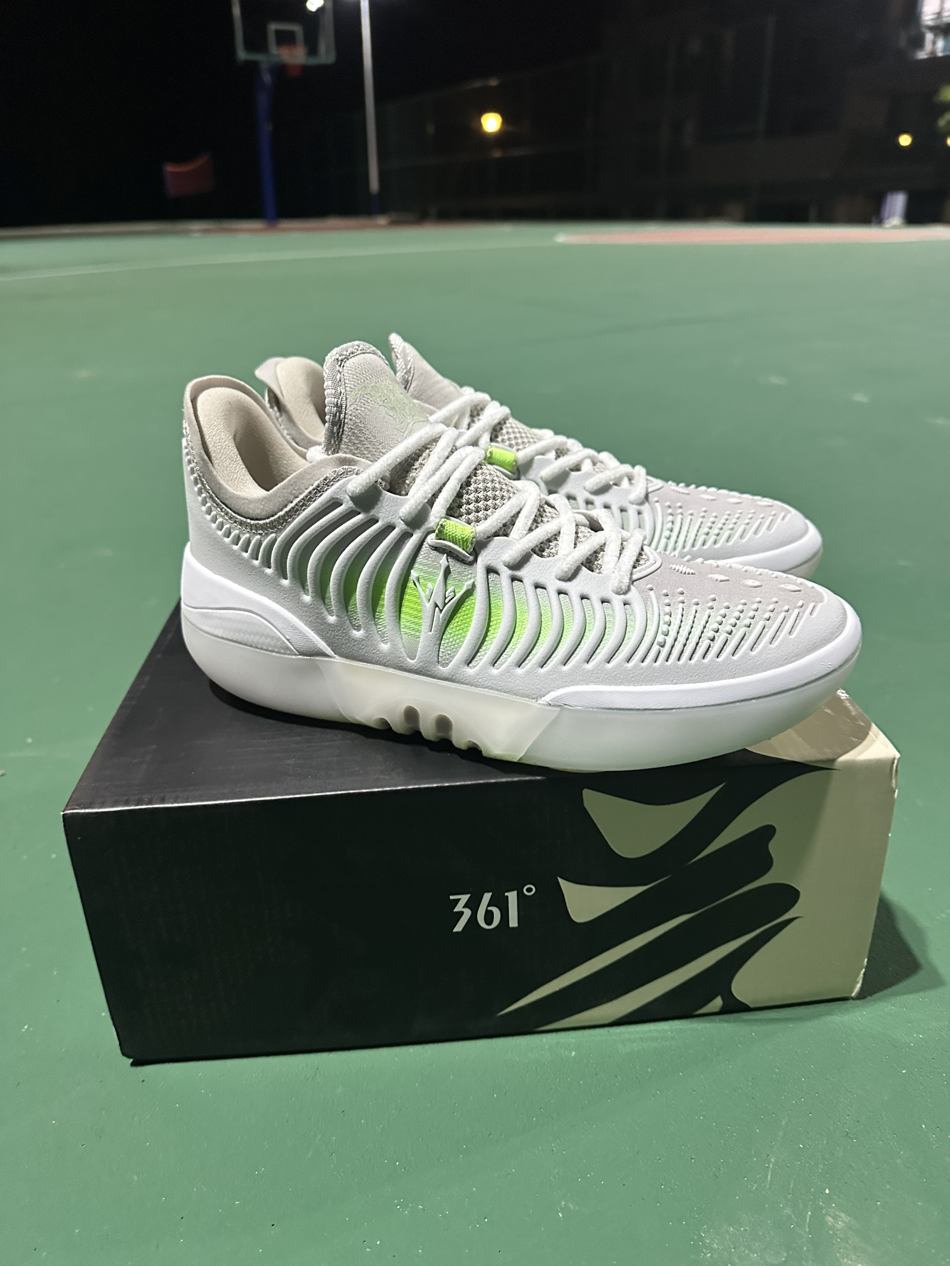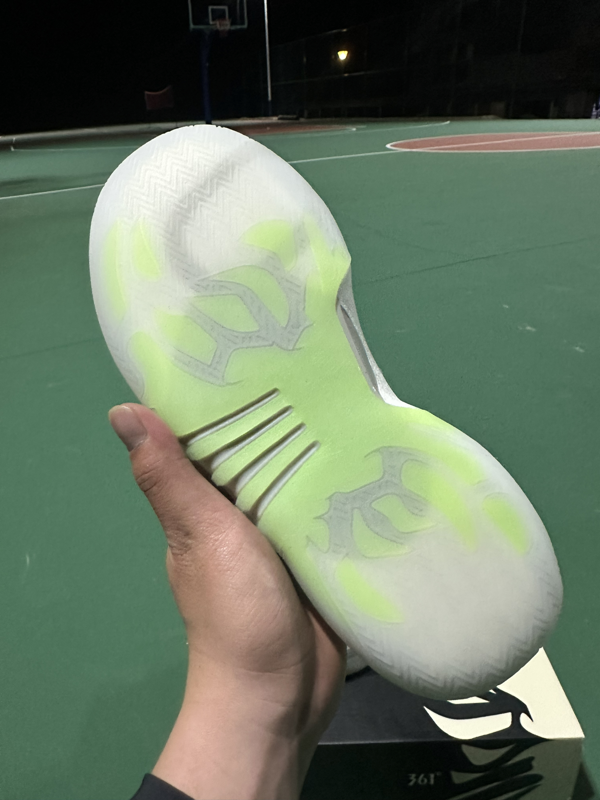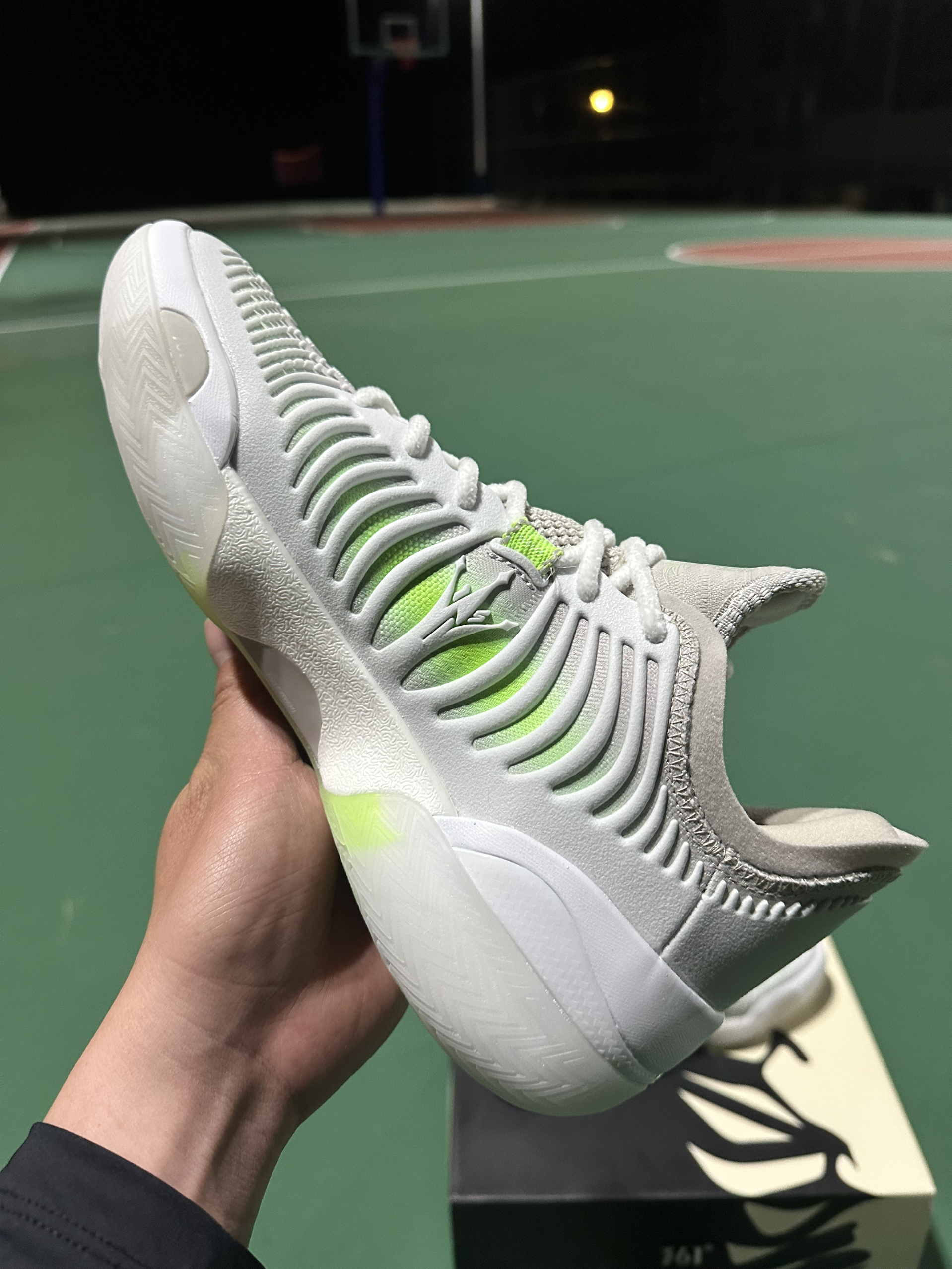 夜晚野球场拎着这双361篮球鞋上场,瞬间成了焦点。白灰色的鱼骨编织鞋面层层交错,荧光绿线条藏在纹路里,冰透大底泛着淡绿渐变,低帮鞋型勾勒出利落的线条,设计感直接拉满。上脚打3V3,中底反馈偏韧弹,突破启动蹬地特别干脆,场地感超清晰。编织鞋面贴合脚型,系紧鞋带后包裹扎实,打了一小时也没磨脚,只是大底沾灰后抓地力会稍弱。 不管是突破后卫还是休闲打球的人都能穿,大体重球友穿它缓震够吗?
