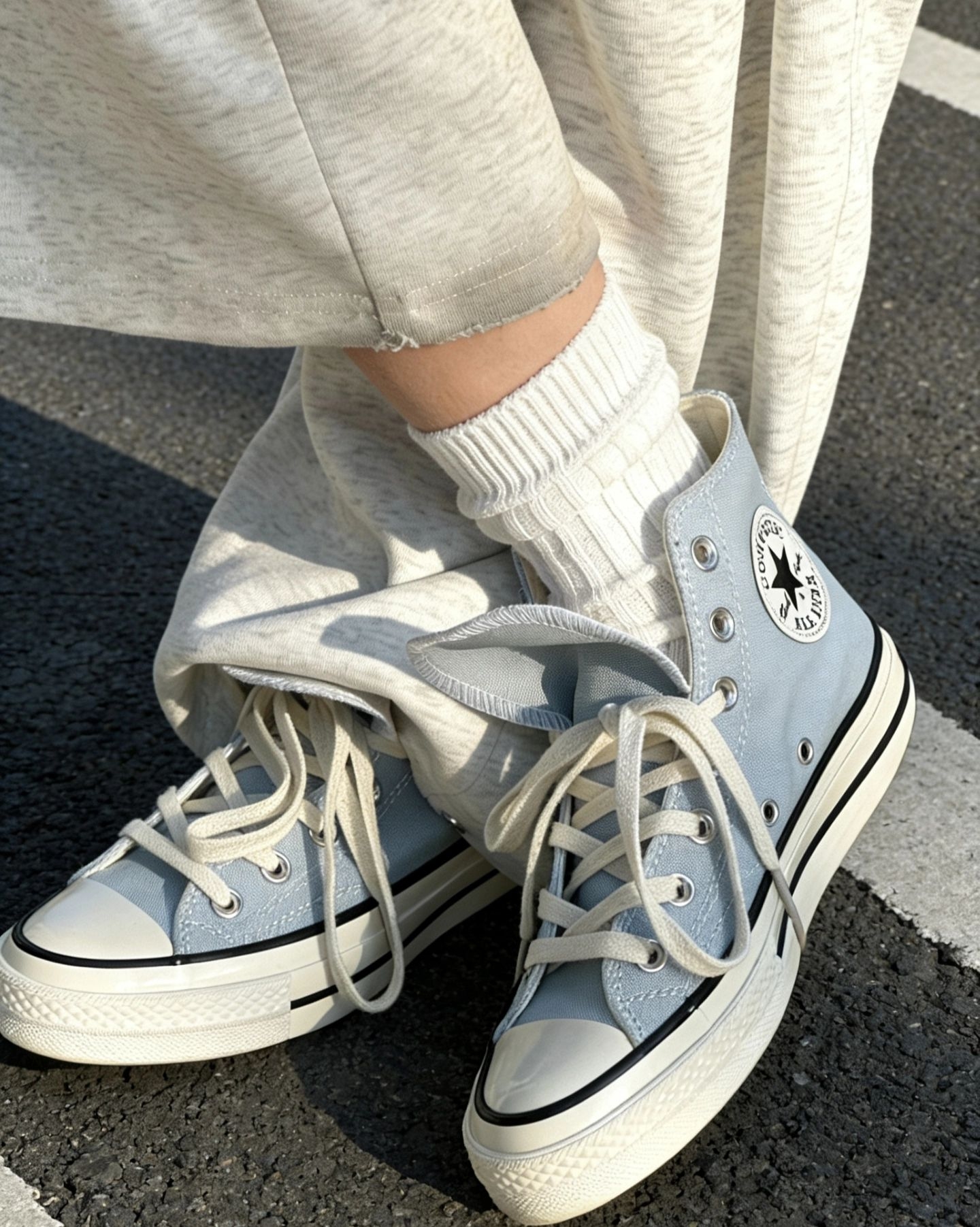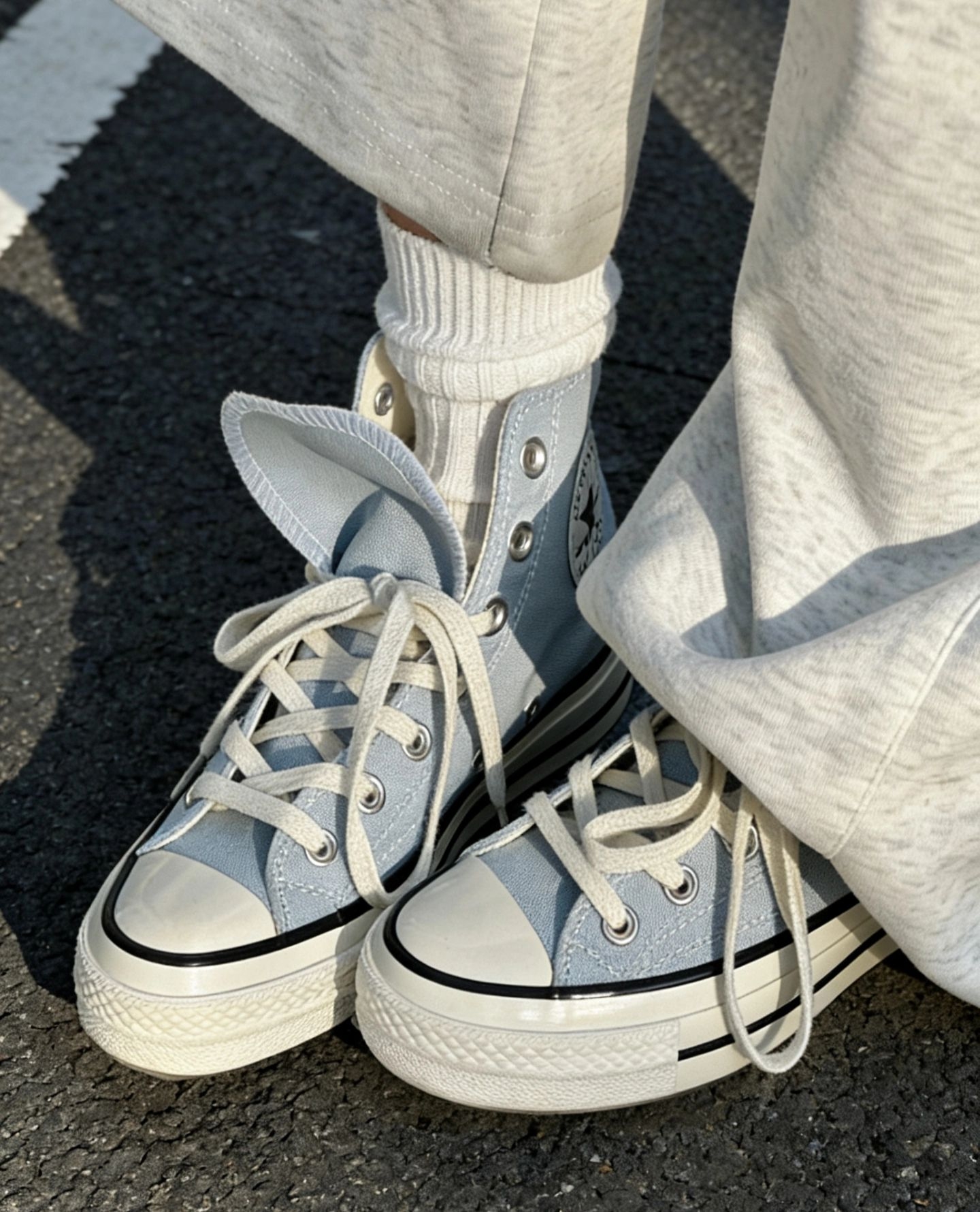 这双浅蓝匡威1970s真的很耐看,帆布材质透气,鞋型挺括,翻折鞋舌还能换种穿法。我今天搭了浅灰卫裤 和白袜子,出门散步、逛店都很舒服,走久了也不磨脚,颜色干净又显脚小,随便拍都很出片,经典百搭,鞋型正,上脚显瘦,舒服不磨脚鞋底软弹透气,走路不累,闭眼入鞋子质感超出预期,帆布厚实透气不闷脚,鞋型挺括不塌,上脚秀气显腿细。尺码标准,鞋底软硬适中,久走不磨脚、不累脚。黑白经典色太百搭,牛仔裤、裙子、休闲...