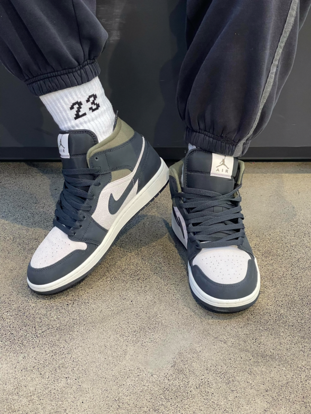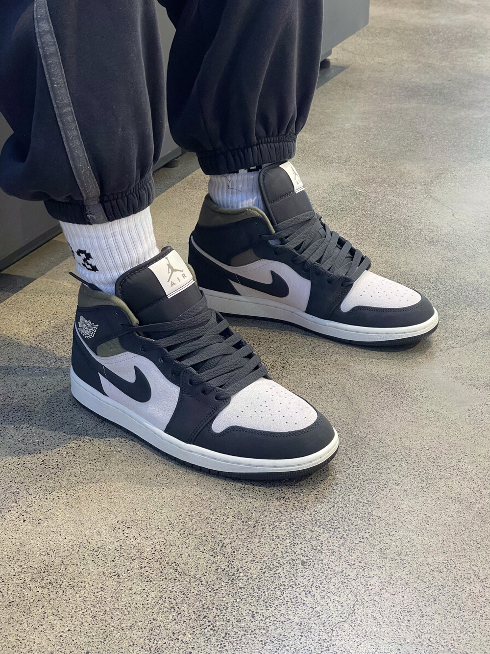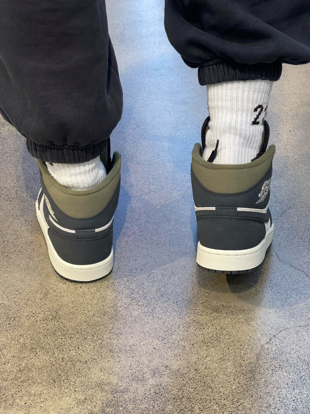 这双AJ1 Mid真的把秋冬氛围感焊在脚上了🍂 黑灰+橄榄绿的撞色搭配,自带复古工装滤镜,越看越有味道! • 鞋面拼接麂皮+皮革材质,摸起来质感拉满,低调又耐脏,日常通勤、出街都好打理 • 经典中帮版型,包裹性在线,搭配束脚裤、牛仔裤、工装裤都超适配,轻松拿捏美式复古风 • 黑白灰+橄榄绿的配色,不挑穿搭不挑人,不管是酷飒街头风还是温柔休闲风都能hold住 • 鞋底软弹适中,走路久站也不累...