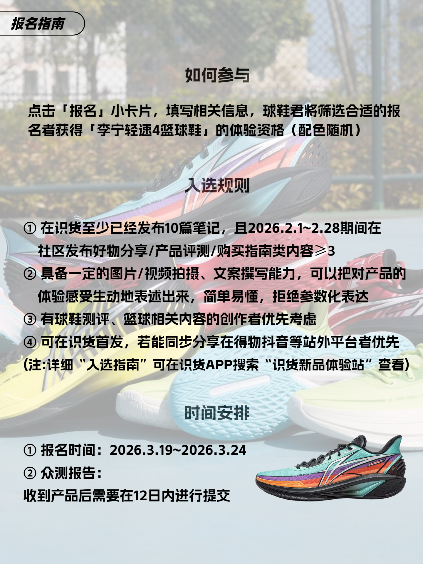 招募名额:5名 【如何参与】 点击「报名」小卡片,填写相关信息,穿搭君将筛选合适的报名者获得「李宁 轻速4 篮球鞋」的体验资格(配色随机) 【入选规则】 ① 在识货至少已经发布10篇笔记,且2026.2.1~2.28期间在社区发布好物分享/产品评测/购买指南类内容≥1 ② 具备一定的图片/视频拍摄、文案撰写能力,可以把对产品的体验感受生动地表述出来,简单易懂,拒绝参数化表达 ③ 有球鞋测评、实...