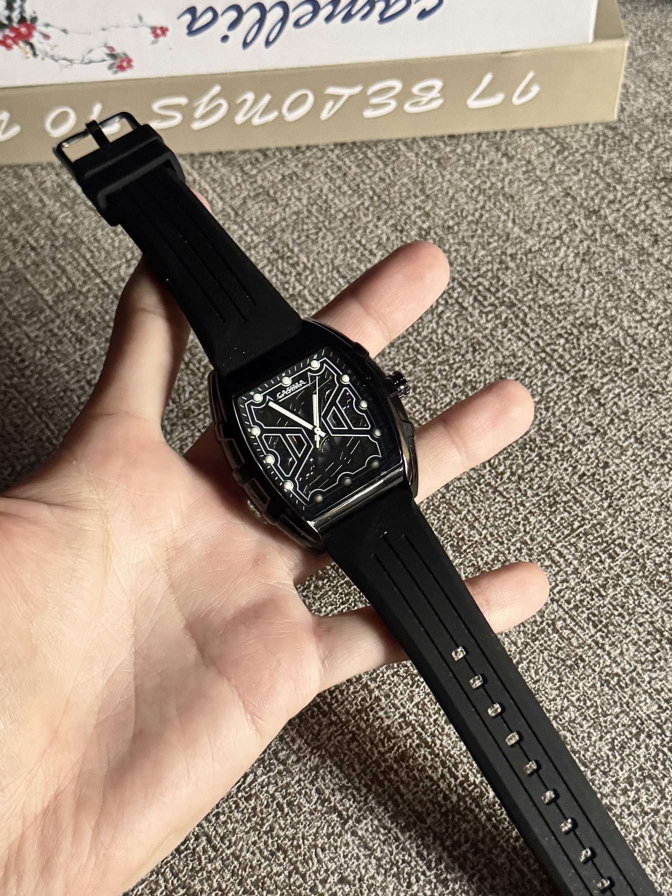 今日份硬核腕表已上线 黑白配色的表盘 再搭配上内部纹理 还蛮有机甲风的 黑胶表带贴手还不闷 挺适合学生党的!