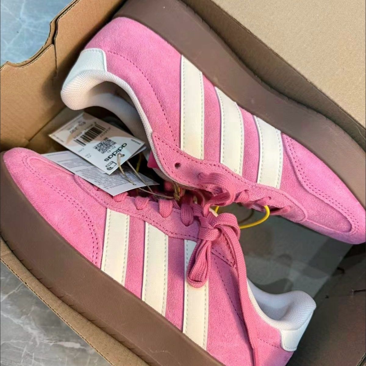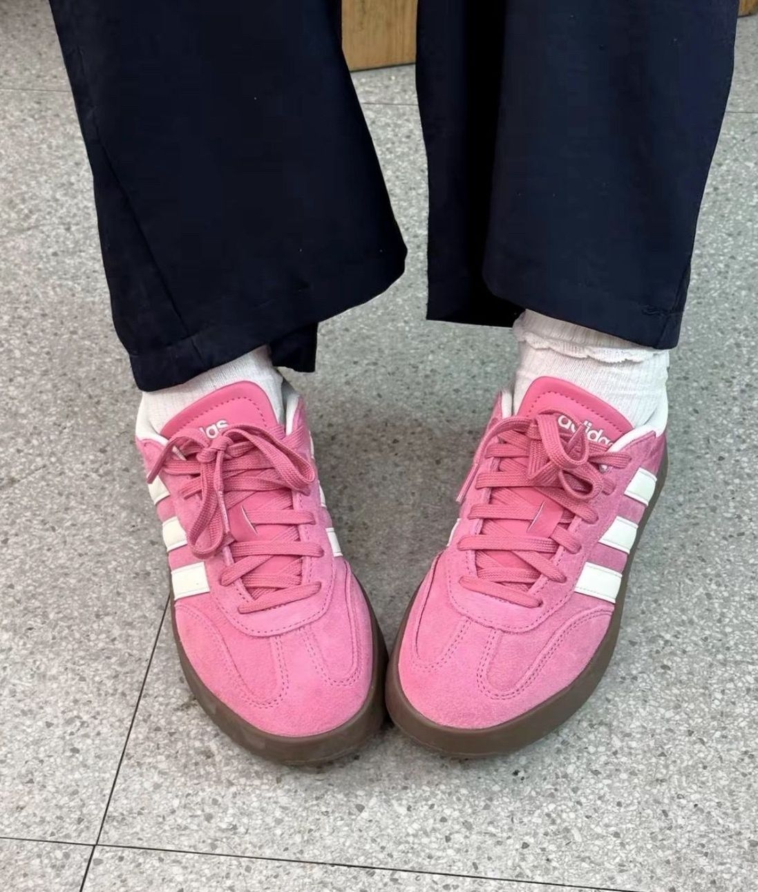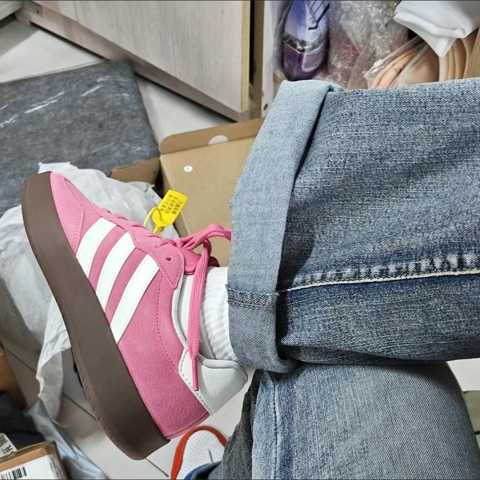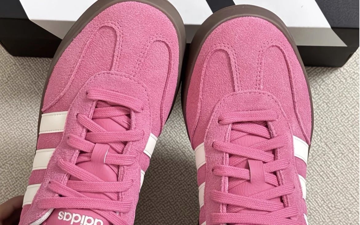 谁懂啊!这双芭比粉+生胶底的配色真的戳中少女心! 麂皮材质软乎乎的,质感拉满,摸起来就很高级 经典三条杠+T头设计,复古感直接拉满 生胶底和粉色鞋面撞色,甜而不腻,越看越耐看 厚底设计悄悄增高3-4cm,小个子狂喜! 鞋型包裹性好,走路久了也不磨脚, 日常通勤/逛街都能打 配牛仔裤、百褶裙、运动裤都好看,甜酷风随意切换 春天就该穿这种粉粉嫩嫩的鞋子!走在路上回头率超高,甜妹们闭眼冲就对了...