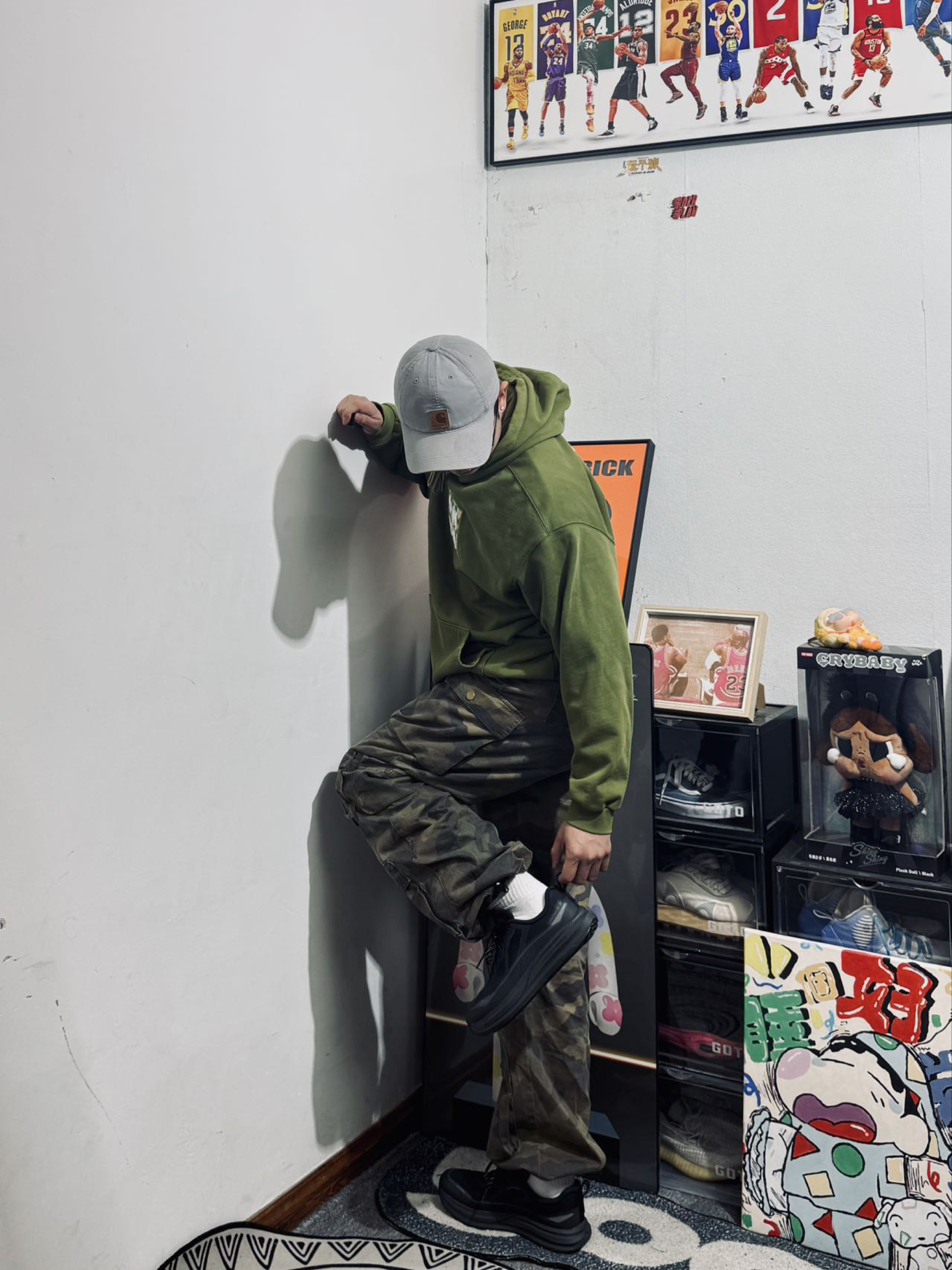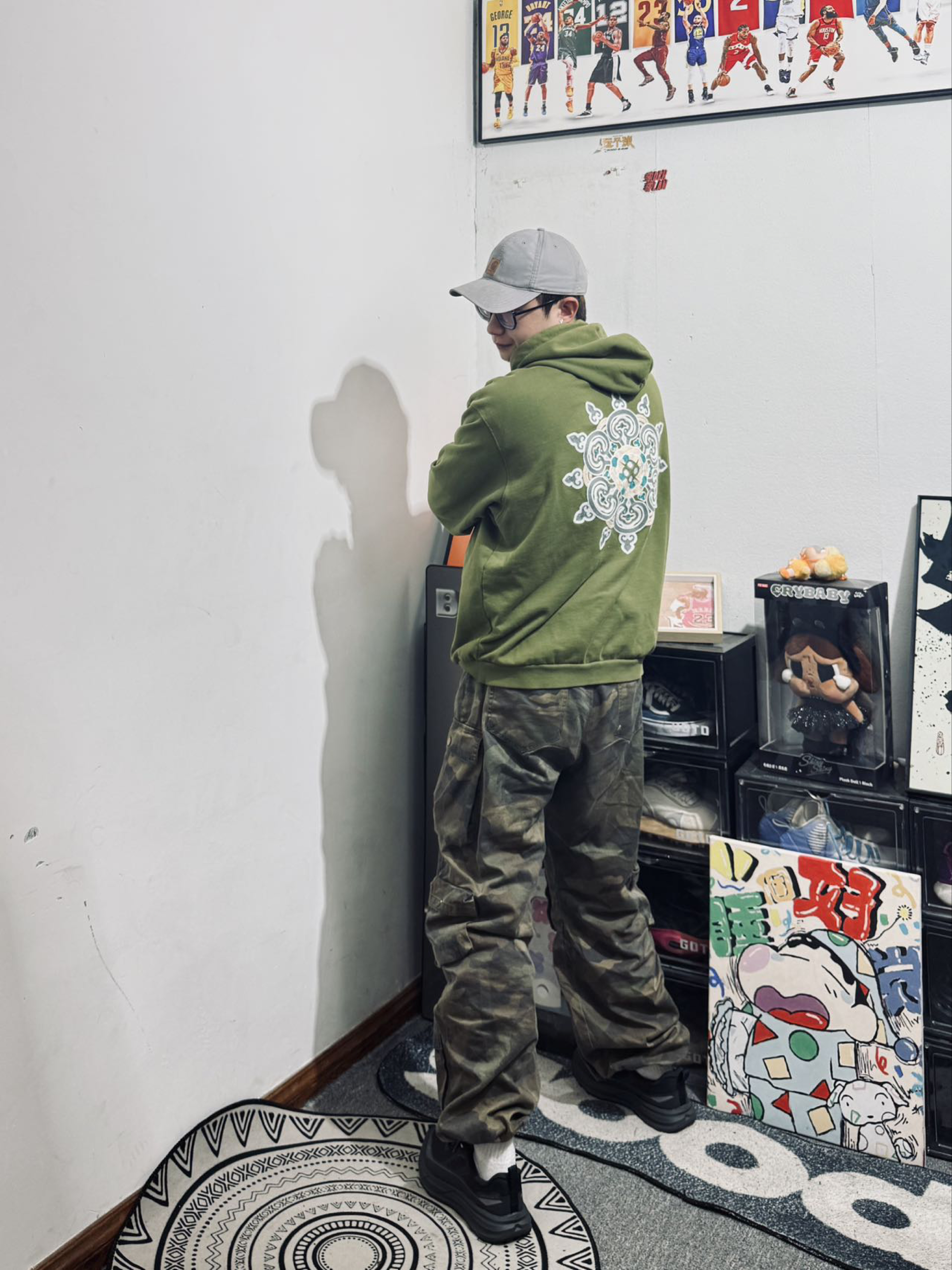 冰美式今日穿搭💦 开春又到了可以单穿卫衣的季节啦 兄弟们🌟 — 👔这件橄榄绿连帽卫衣 背后的方印纹样很有辨识度 单穿或叠穿都合适 ✨ 早晚微凉也能扛住❄️ — 👖下身搭迷彩工装裤 多口袋设计很实用 🍂 直筒裤型刚好修饰腿型做旧质感自带美式高街味儿 — 👟脚上这双黑户外鞋 减震回弹脚感很稳❤️🔥 走久了也不累 干湿路面都能抓得牢🦓 日常通勤或周末citywalk都适配🕶️ — 身高178cm 体...