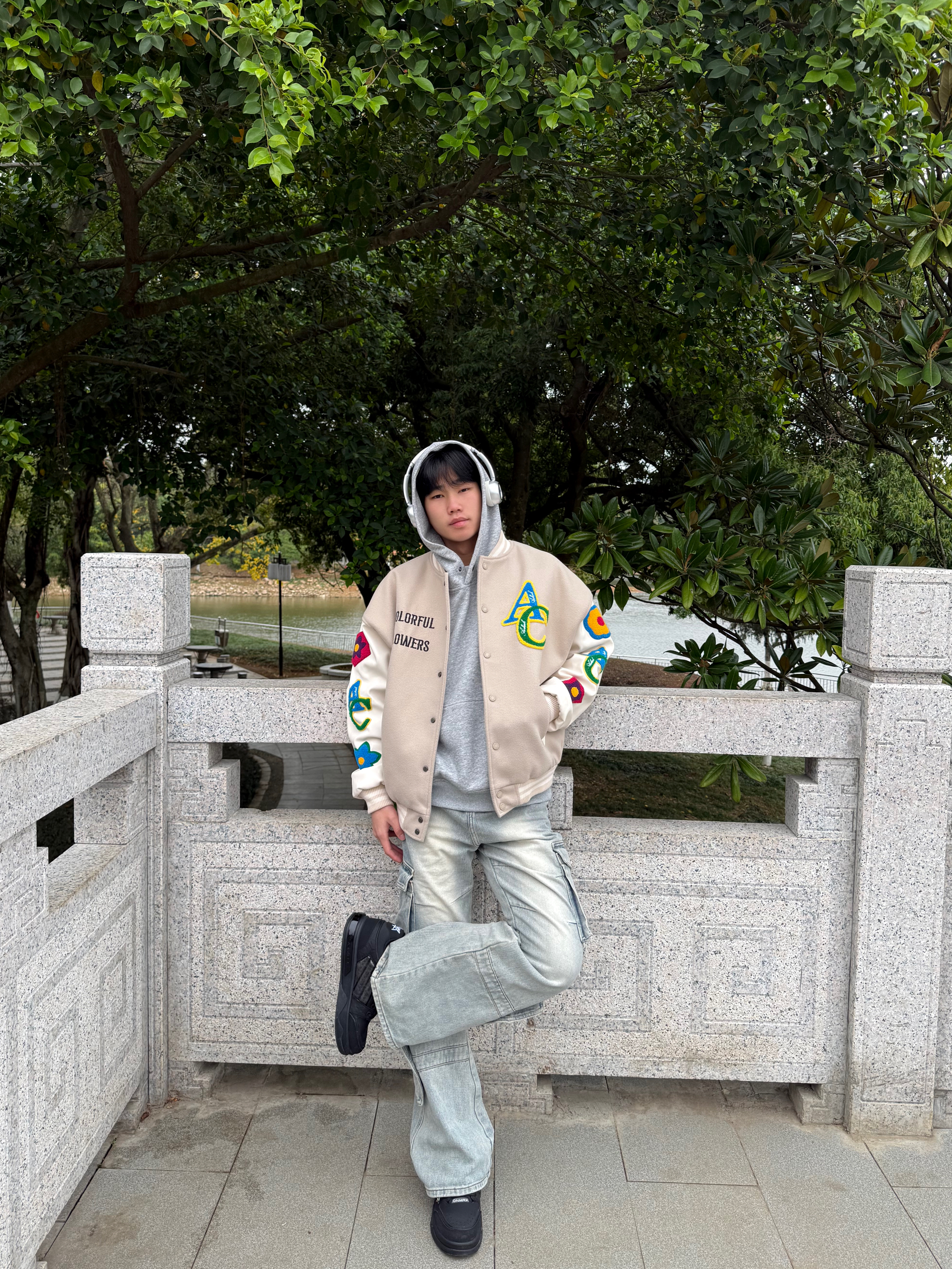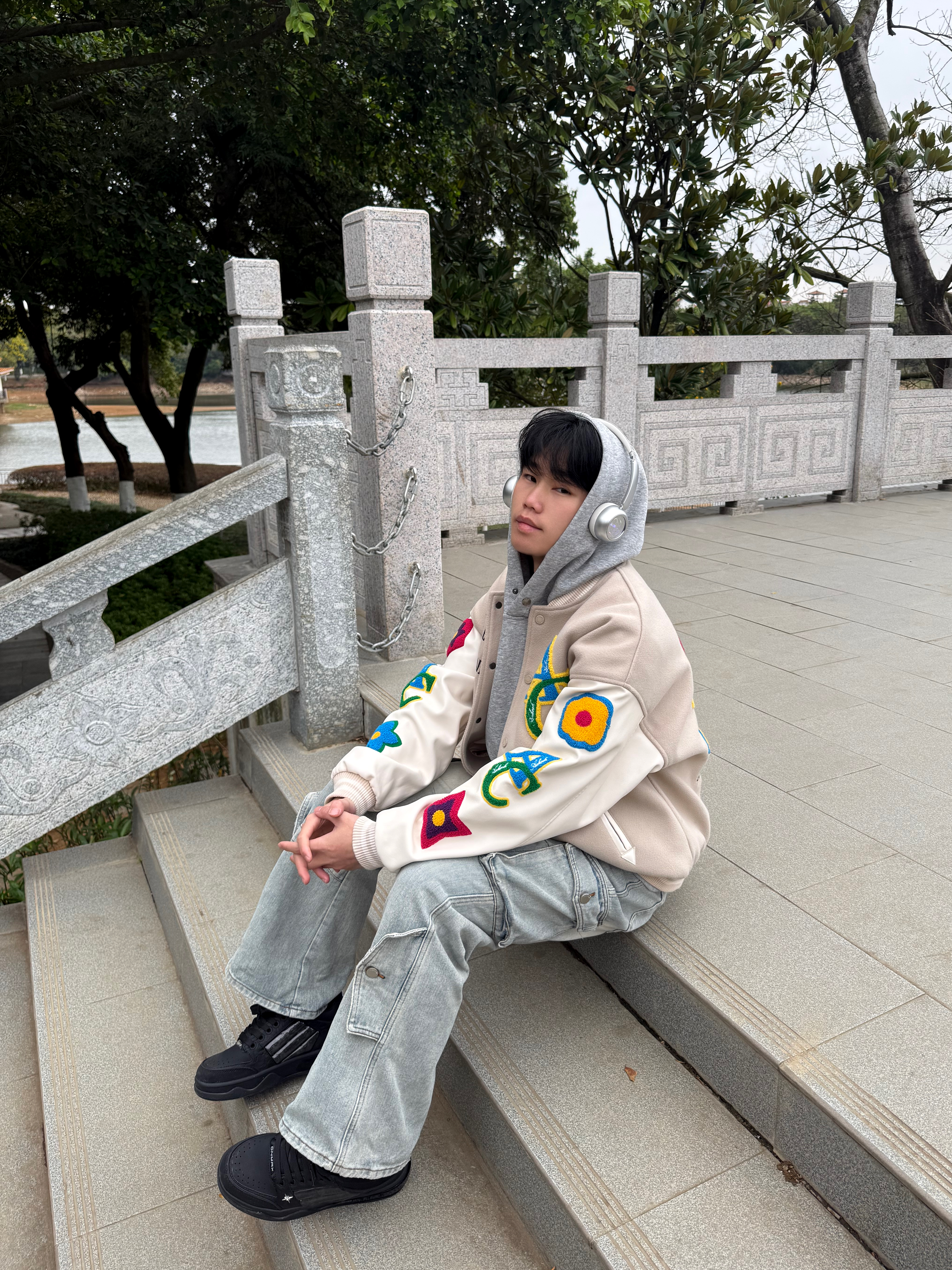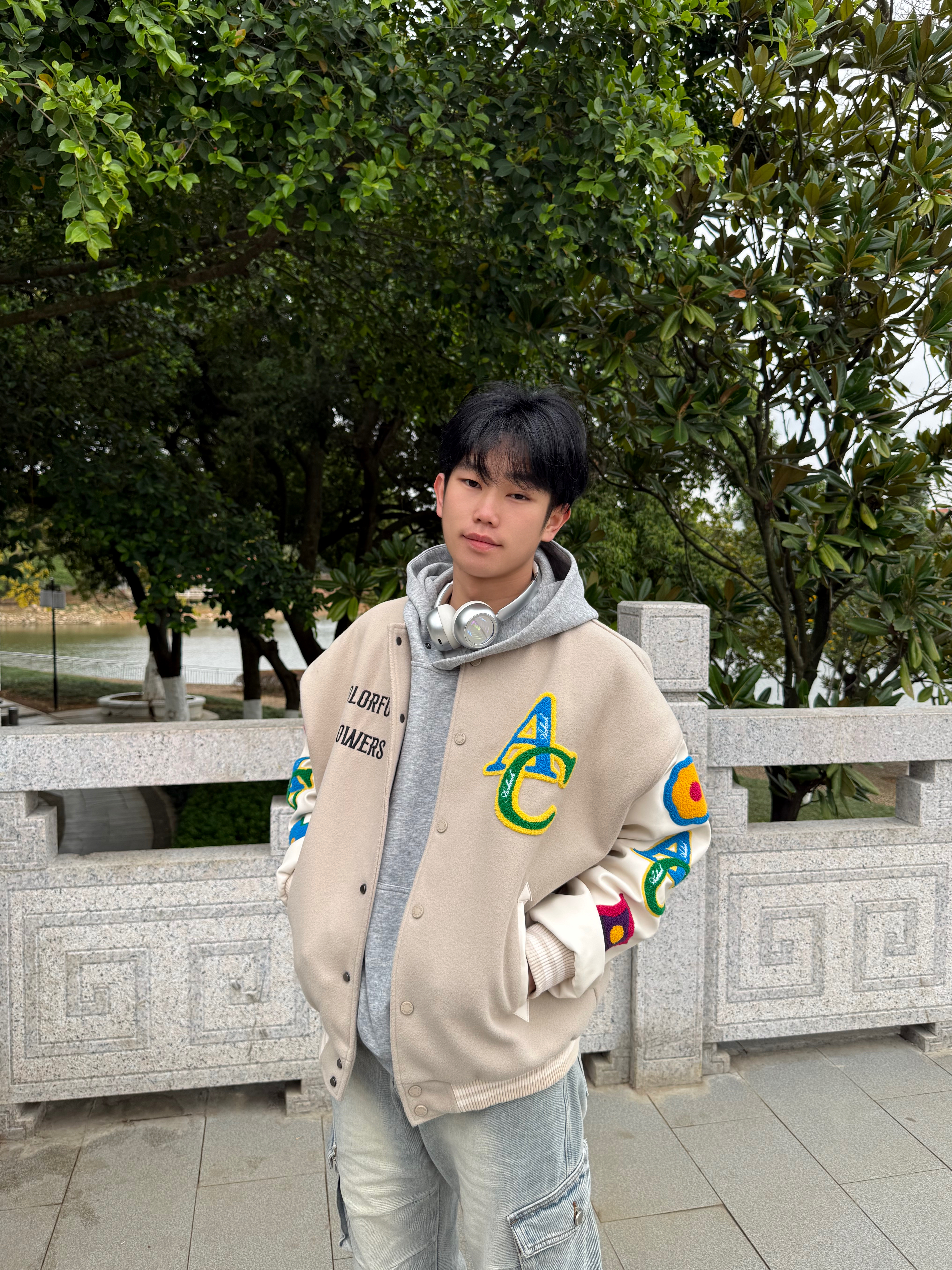 周末逛公园的随手拍 浅卡其色棒球服真的太显干净了 袖子上的彩色刺绣是点睛之笔 内搭连帽卫衣 叠穿感拉满搭配工装牛仔裤和黑鞋 舒服又自在,完全是不费力的少年感耳机一戴,谁也不爱 参考尺码173/55