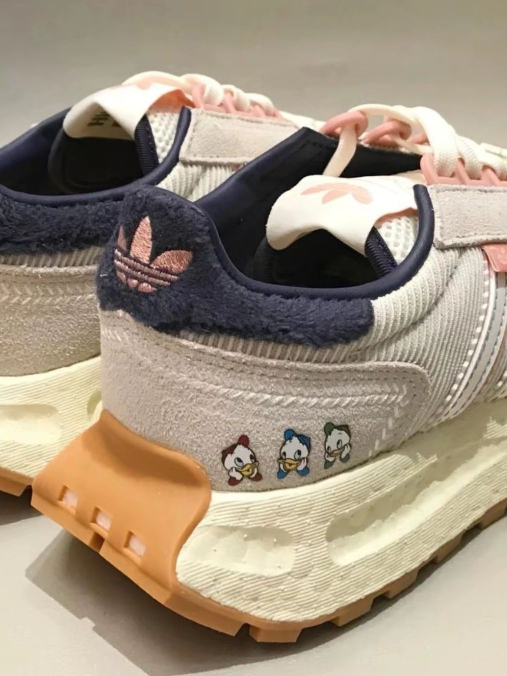 谁能拒绝这双满是唐老鸭的阿迪复古跑鞋啊! 浅粉灰配色温柔又干净,网面透气不闷脚✨ 后跟和鞋侧的唐老鸭刺绣超精致,细节控狂喜 爆米花中底脚感软弹,锯齿生胶底复古感拉满 搭配卫衣、百褶裙都超减龄,早春出门踏青太合适啦~