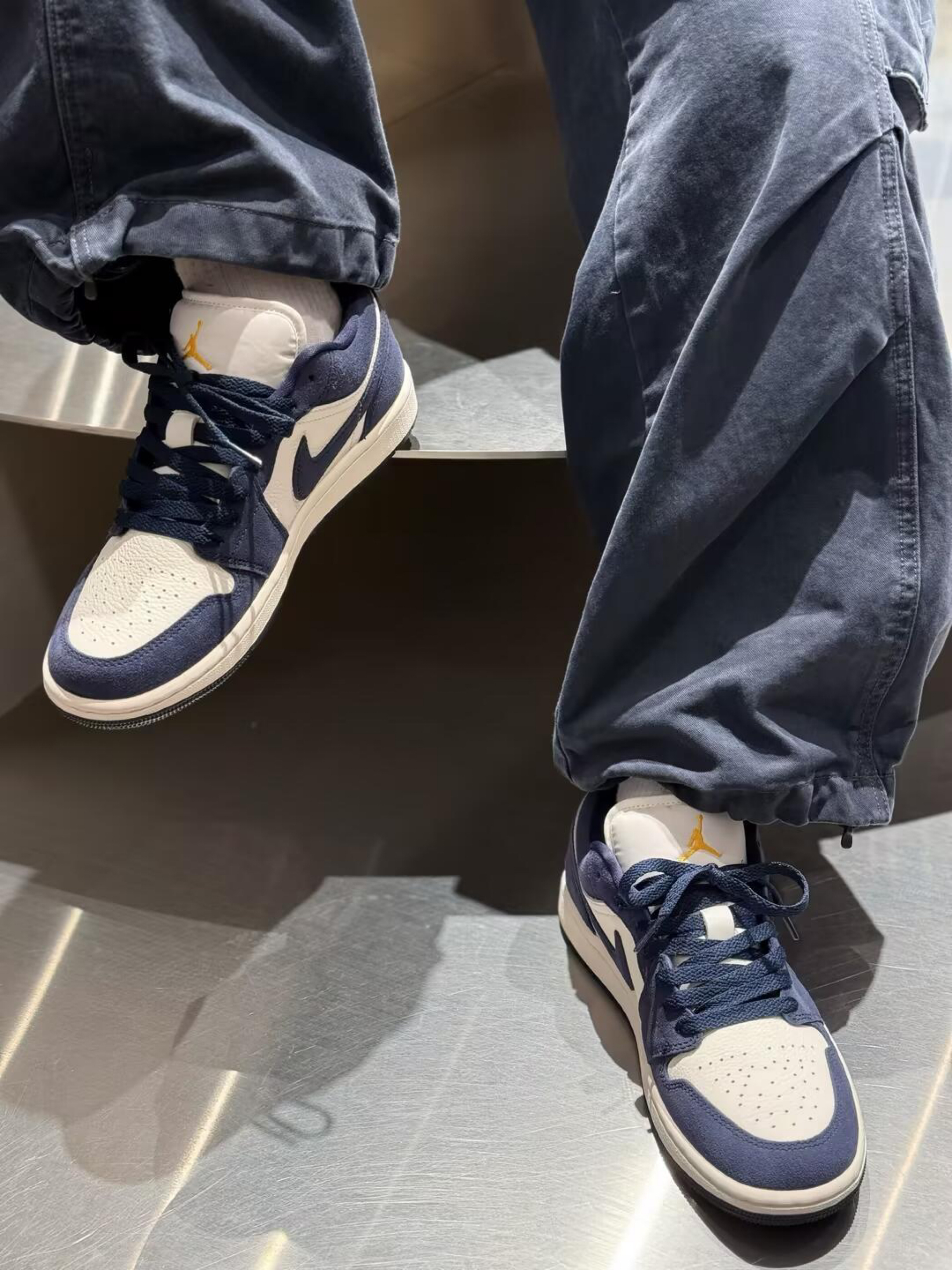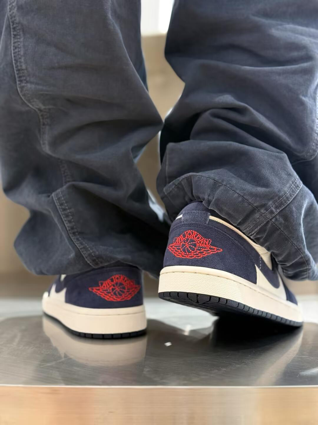 海军蓝AJ1颜值也太顶了❗️❗️ 高级海军蓝×米白经典撞色,自带复古滤镜, 鞋型利落又耐看,百搭不挑人。 配宽松牛仔裤随性复古,搭束脚运动裤街头感拉满💯 细节耐看、上脚有型,日常穿低调又有格调, 怎么拍都出片~