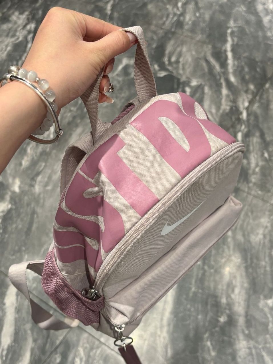 浅粉底色搭配玫字母印花,温柔又元气,白色Swoosh Logo经典耐看,前置口袋+侧网兜收纳方便,“JUST DO IT”挂饰点缀细节,轻便小巧,日常通勤、出游或搭配穿搭都超合适。