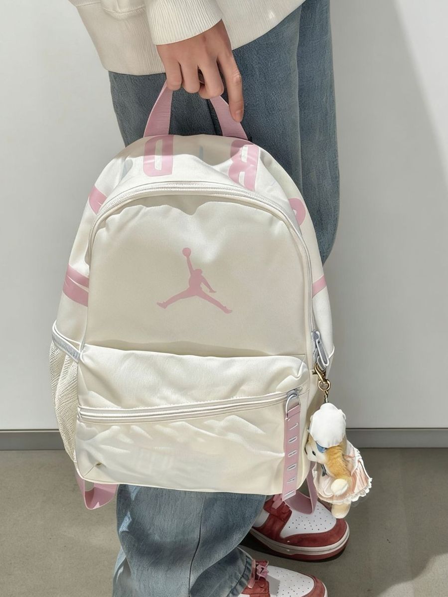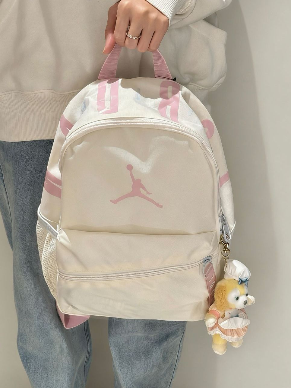奶白底色搭配樱花粉飞人Logo与字母印花,温柔又浪漫,前置口袋+侧网兜收纳实用,浅灰肩带舒适不压肩,挂饰点缀更显可爱,日常通勤、上学或出游都适配,自带春日甜妹氛围感。