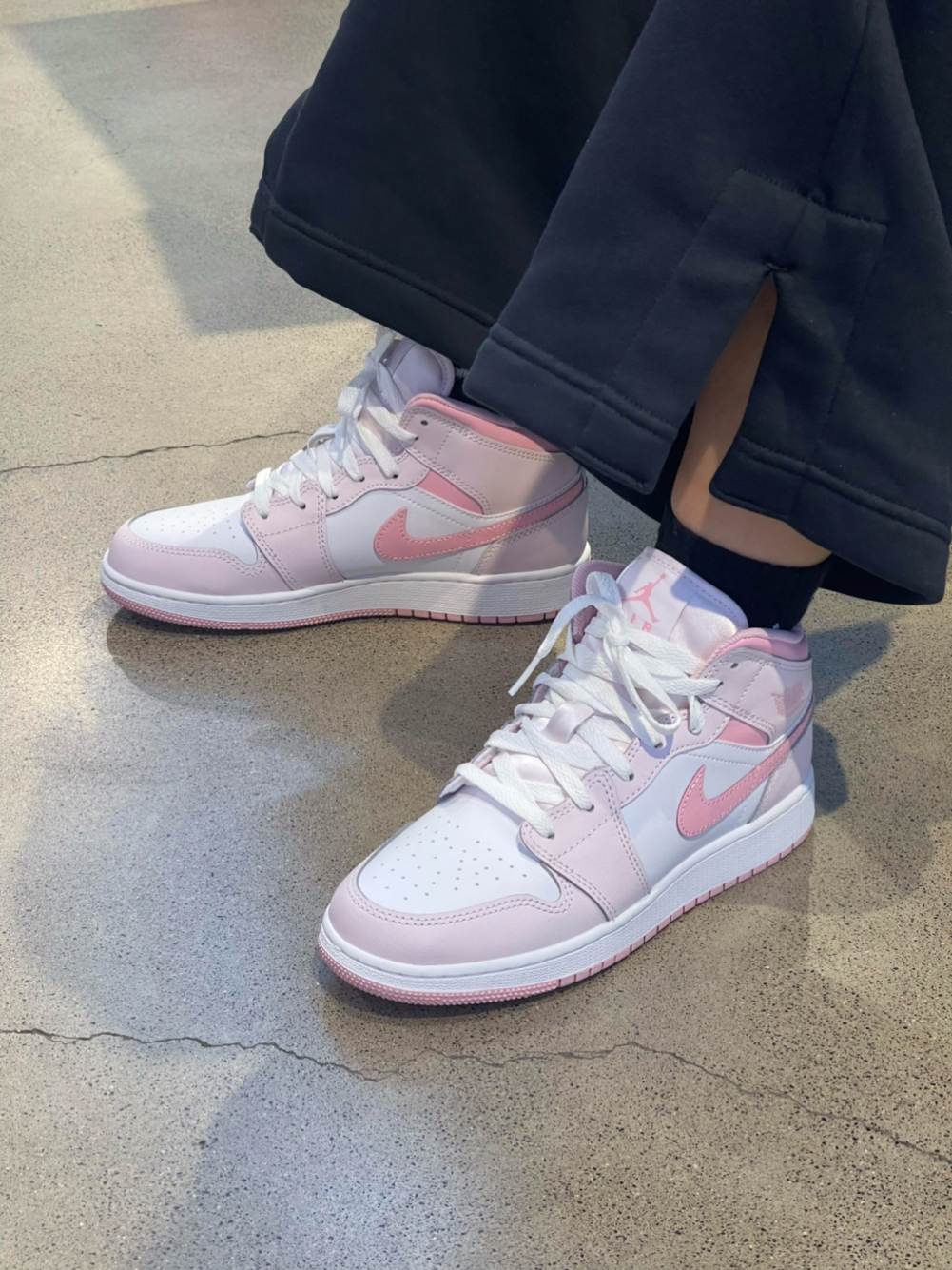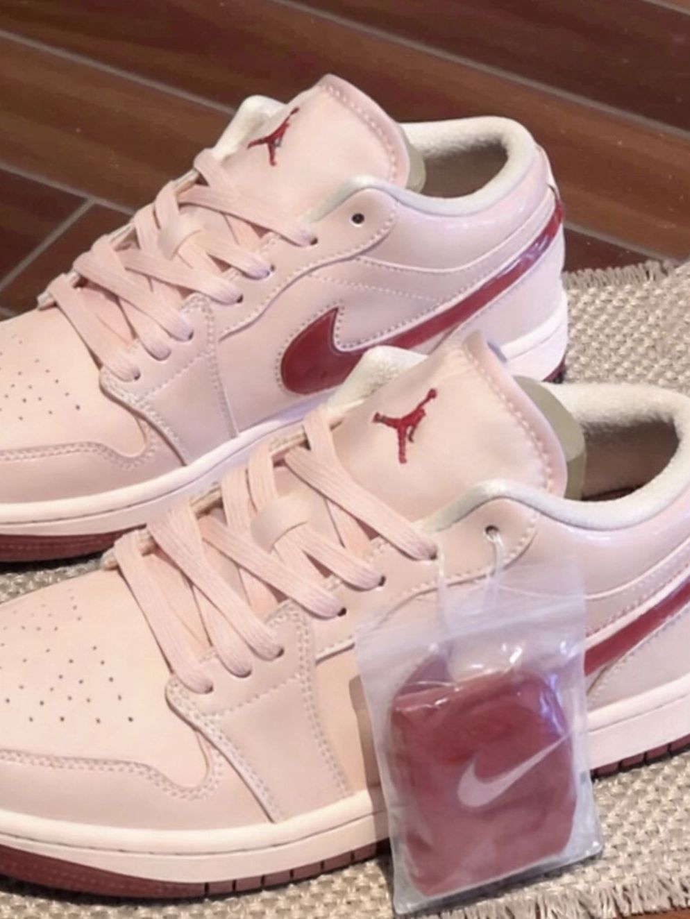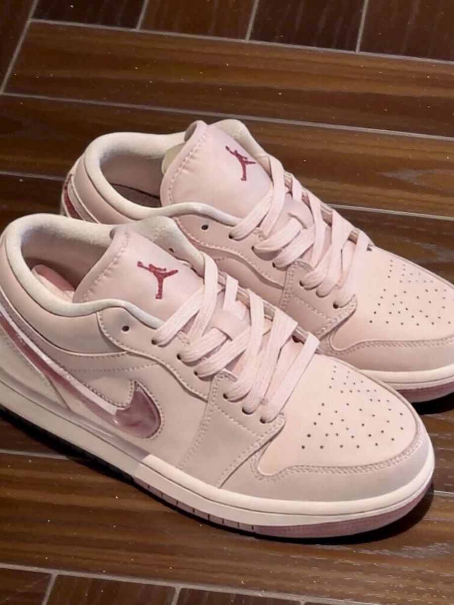 淡粉漆皮鞋面搭配酒红Swoosh与外底,温柔又精致,鞋舌飞人Logo刺绣细节拉满,低帮版型修饰脚踝,搭配百褶裙或牛仔裤,春日甜妹氛围感直接拉满,约会、出街都超合适。