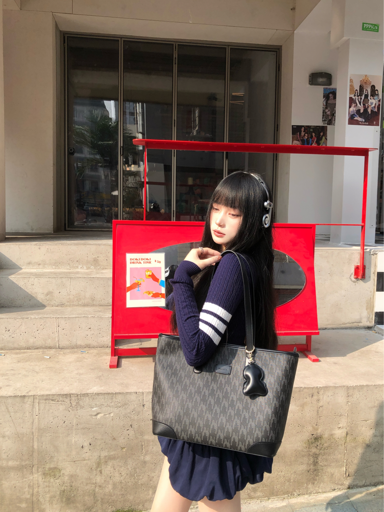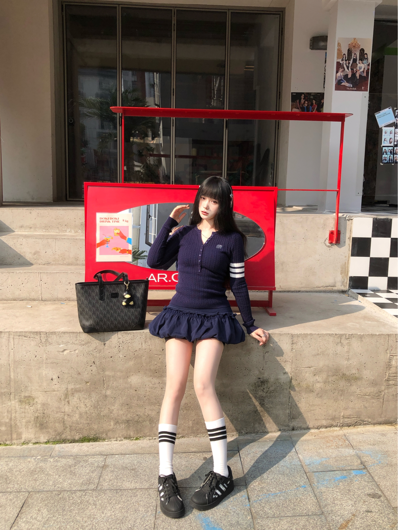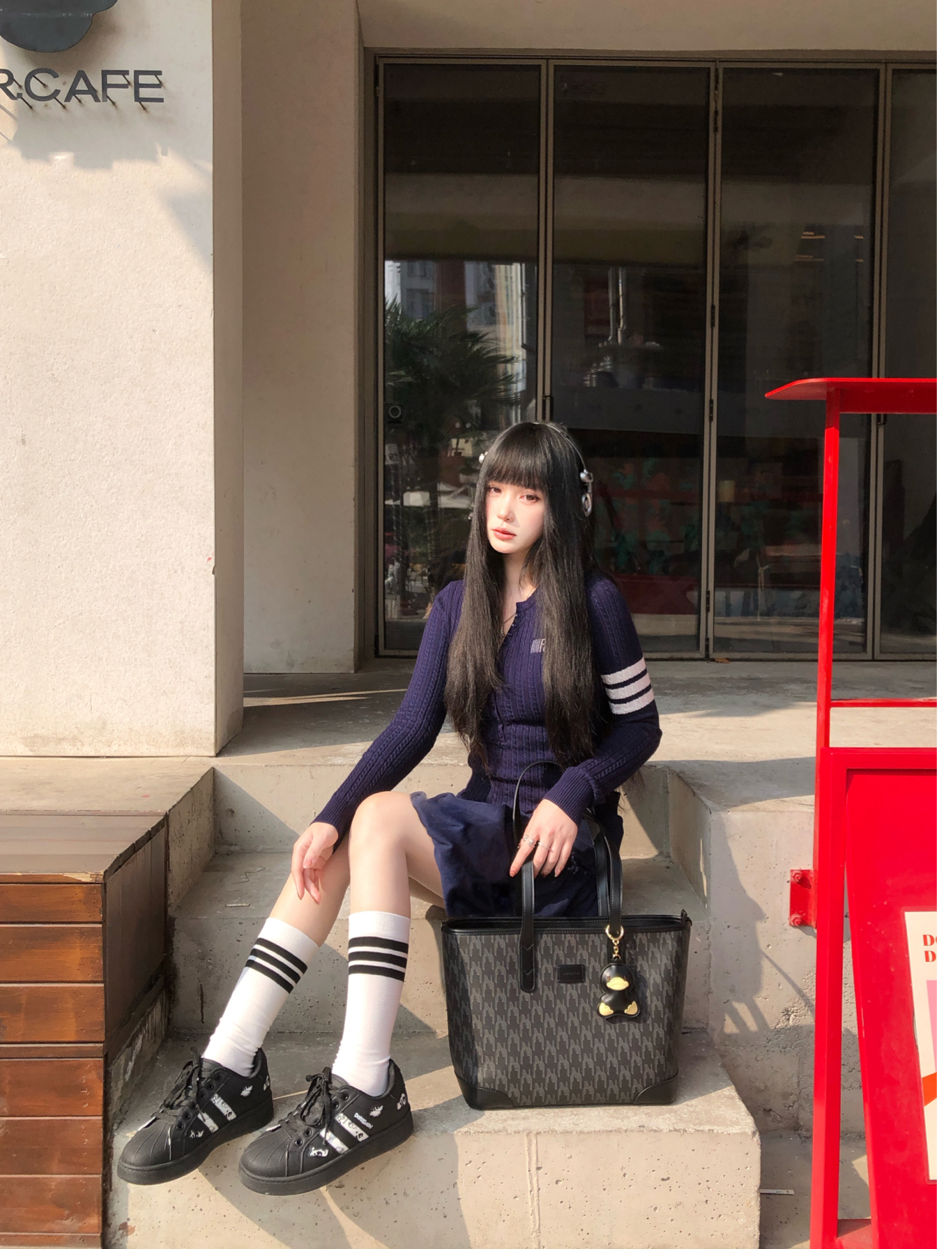 出街户外搭配一套春日辣妹穿搭🔅 修身藏蓝色针织衫搭同色系短裙好显瘦 搭配哆啦A梦贝壳头黑板鞋👟 上脚舒适轻便 日常也很百搭~ 包包搭配的 NUCELLE纽芝兰 鸭鸭托特包👜 容量很大日常通勤出街背它都ok 黑色也比较百搭 春日这么搭好时髦
