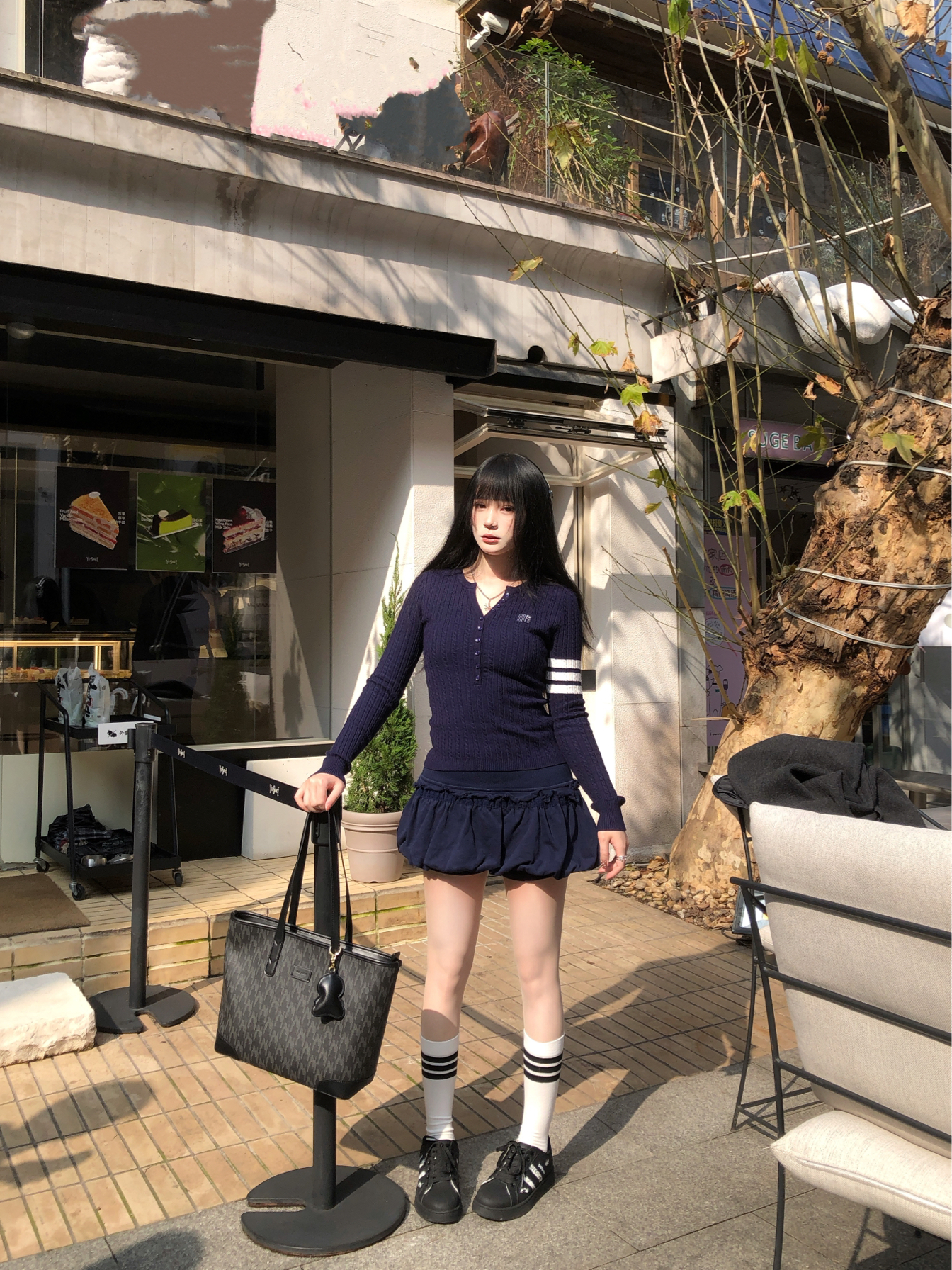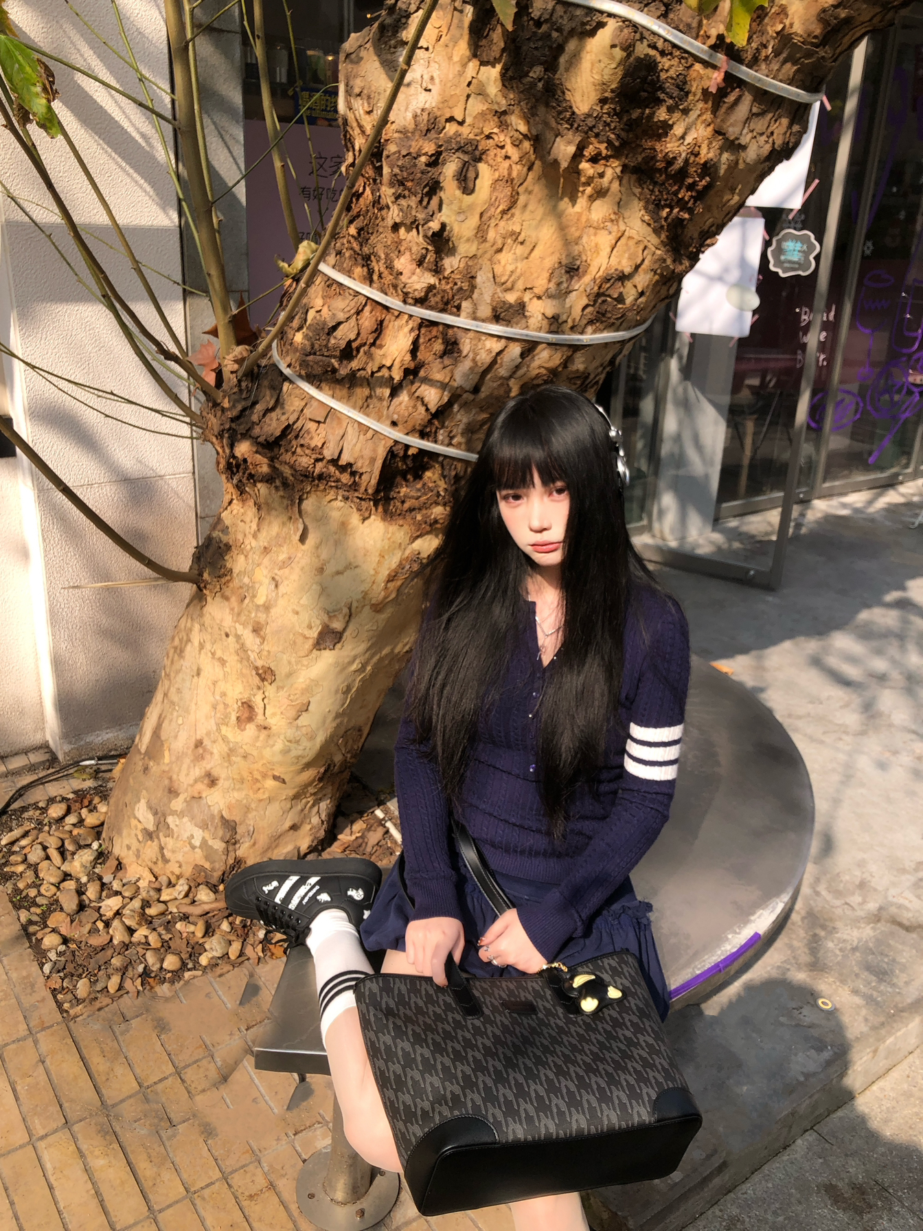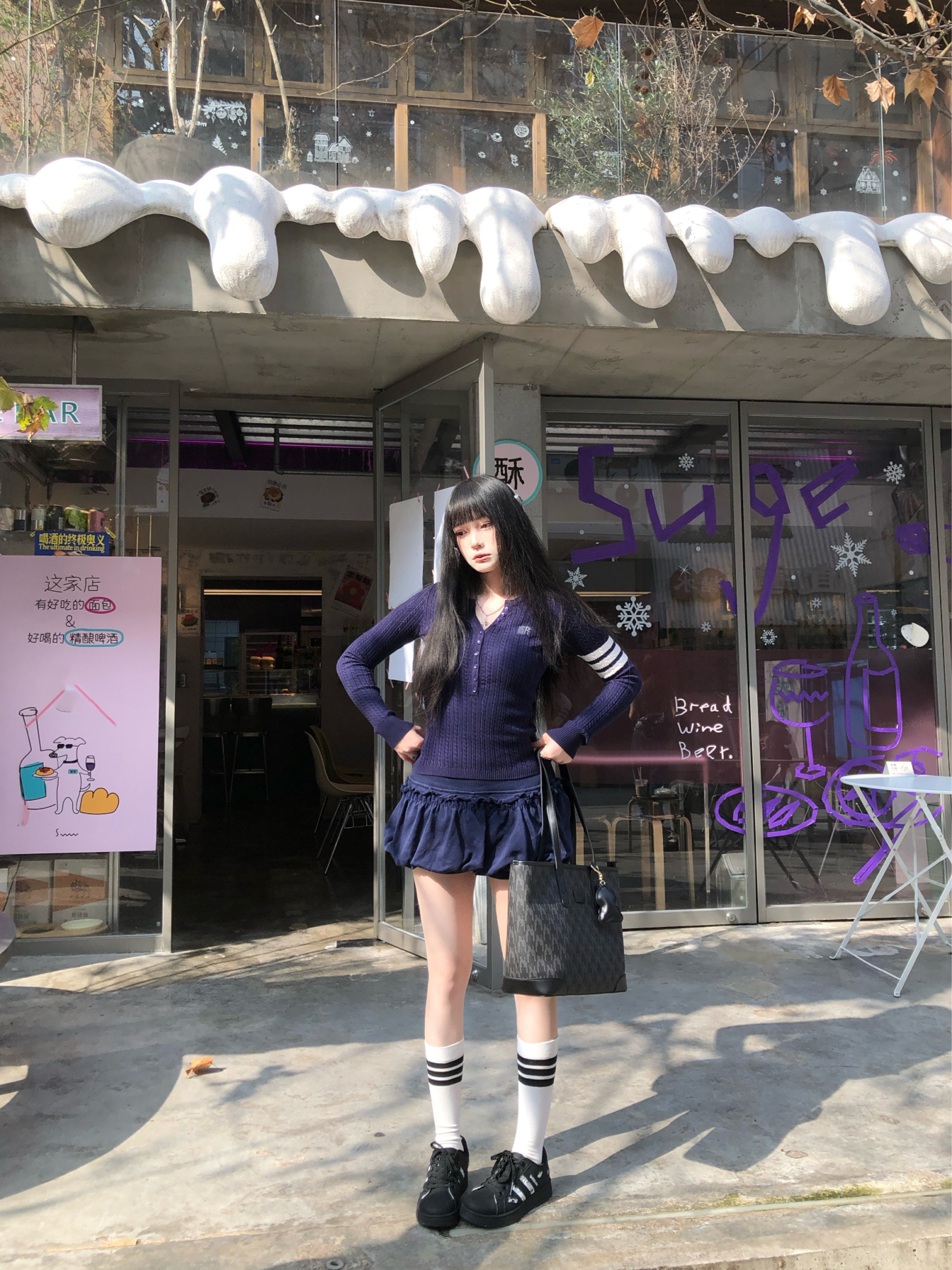 出街户外搭配一套春日辣妹穿搭🔅 修身藏蓝色针织衫搭同色系短裙好显瘦 搭配哆啦A梦贝壳头黑板鞋👟 上脚舒适轻便 日常也很百搭~ 包包搭配的 NUCELLE纽芝兰 鸭鸭托特包👜 容量很大日常通勤出街背它都ok 黑色也比较百搭 春日这么搭好时髦