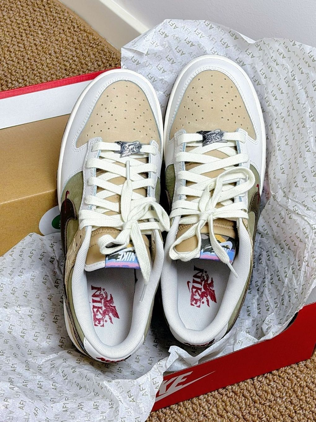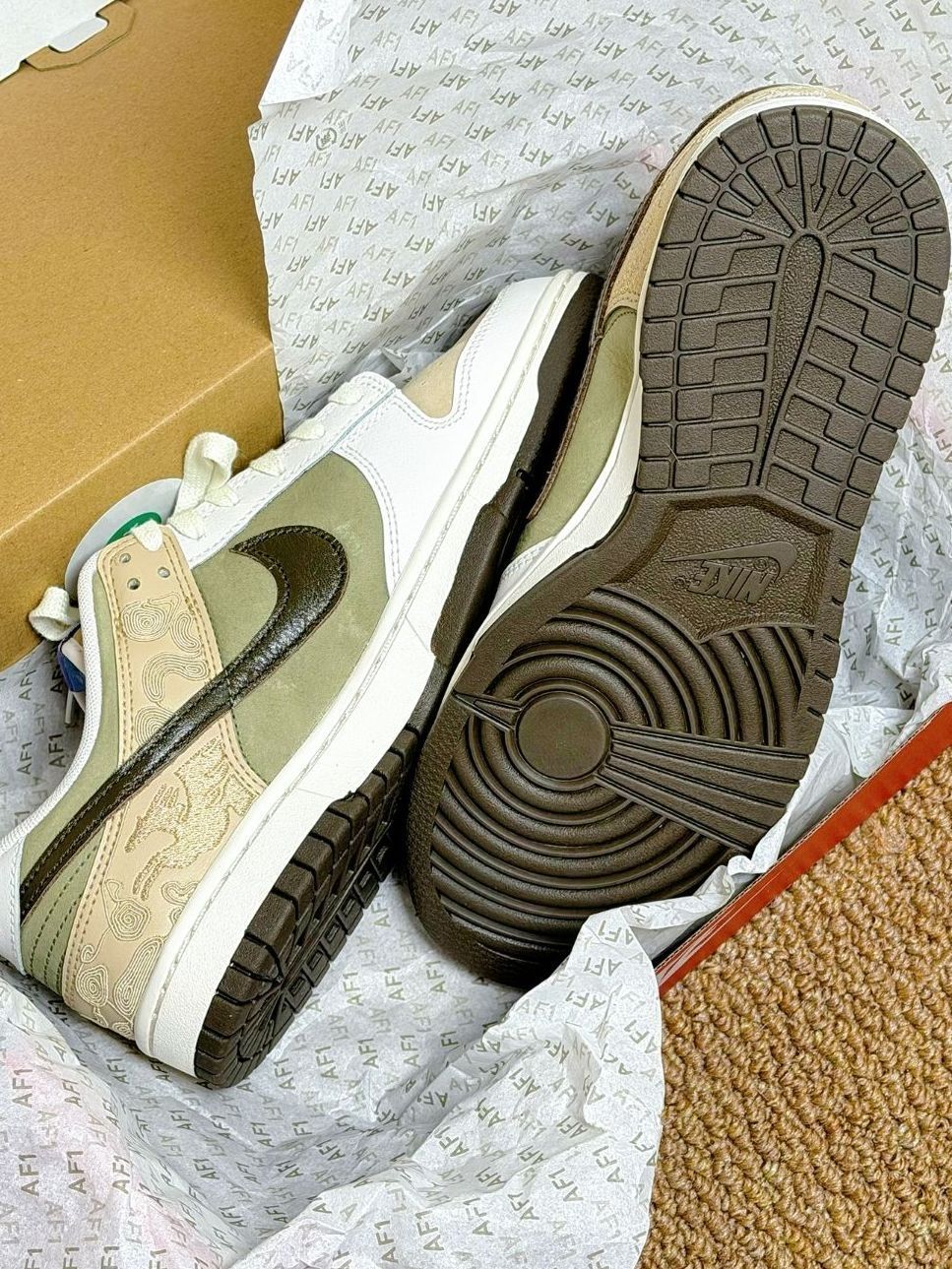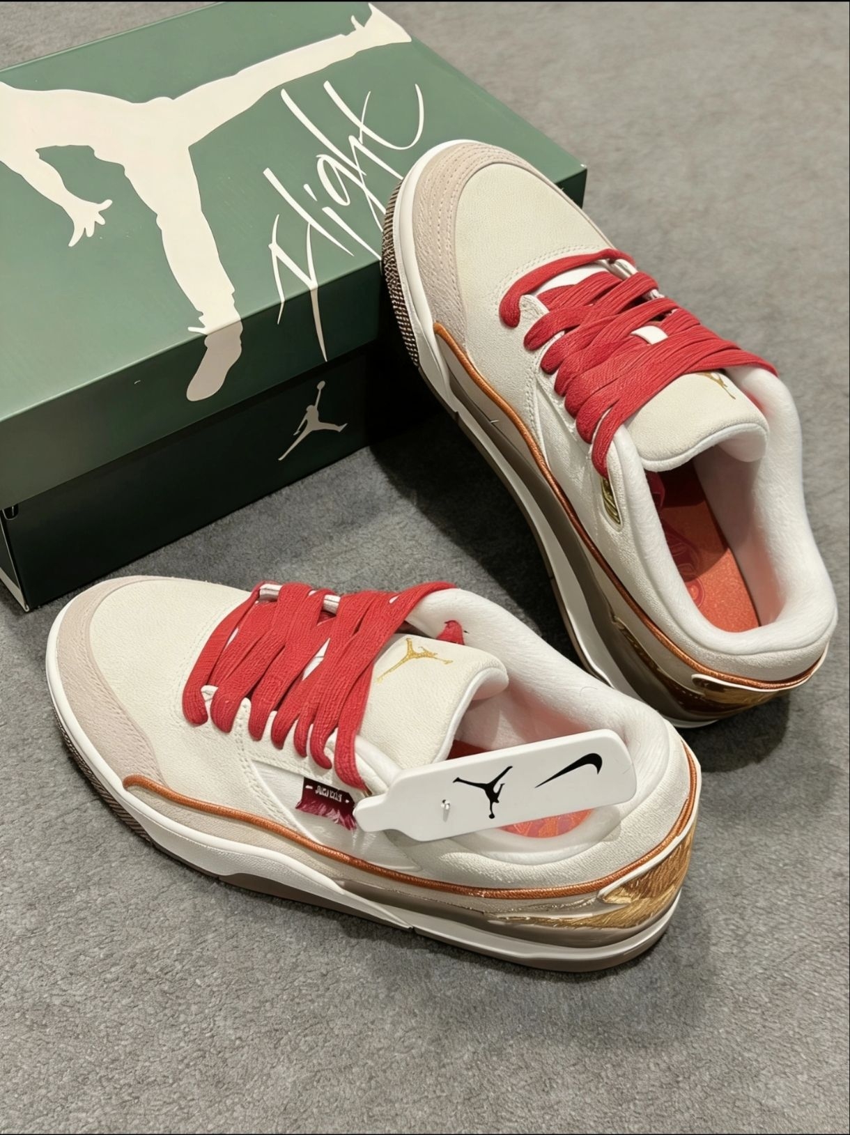 橄榄绿拼接米白麂皮,后跟红色NIKE刺绣精致吸睛,鞋侧金色祥云与瑞兽刺绣工艺感拉满,多彩鞋舌标签增添细节亮点,搭配国风服饰或牛仔单品,复古国潮氛围感直接拉满,日常出街、穿搭都超合适。