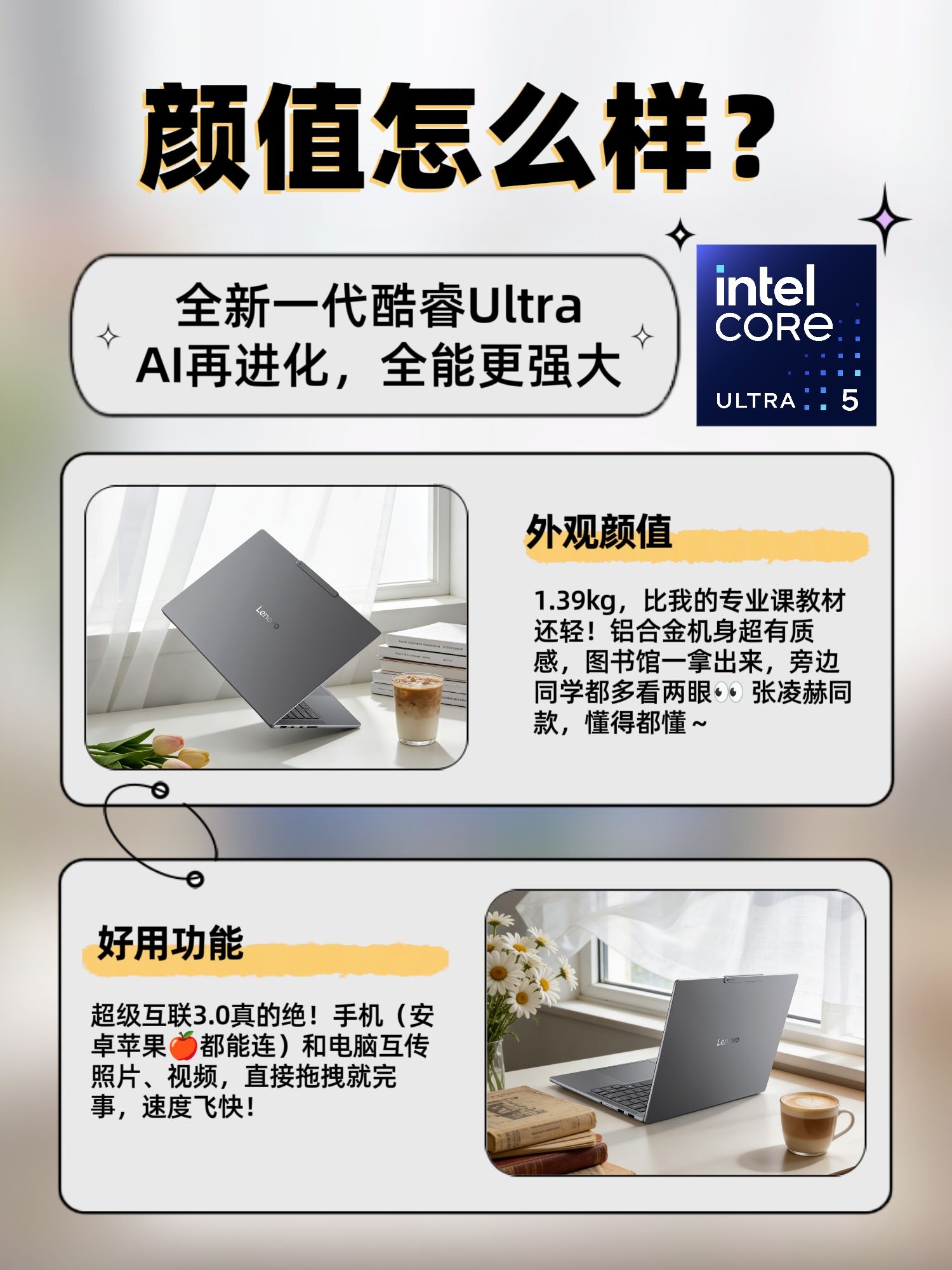 准备入手笔记本电脑的姐妹看过来!快开学了,准备用压岁钱入一台新的笔记本电脑,做了不少功课,入了这台联想小新Pro 14 GT AI元启版,用了一周,🙋🏻♀️简单给大家分享下我的使用体验: ✨ 颜值轻薄没话说 1.39kg,比我的专业课教材还轻!铝合金机身超有质感,图书馆一拿出来,旁边同学都多看两眼👀 张凌赫同款,懂得都懂~ 💿性能确实强 搭载英特尔® 酷睿™ Ultra 5 处理器 22...