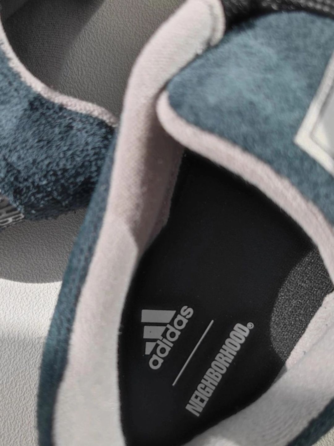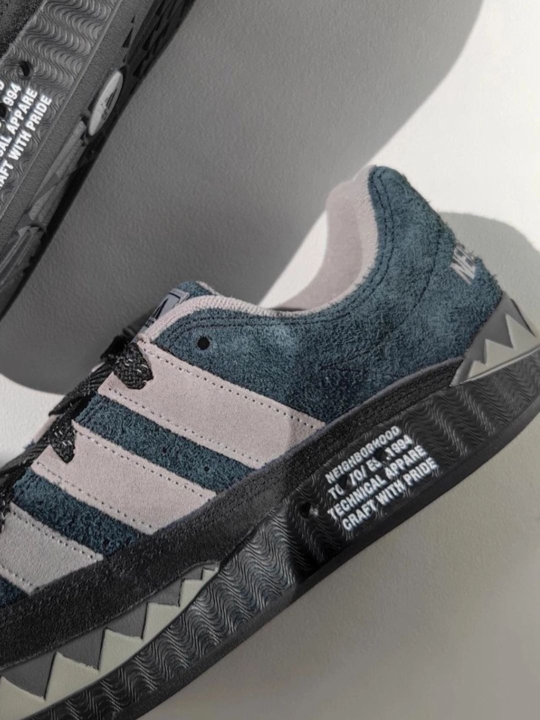 和闺蜜逛文创园✨,穿灰色oversize卫衣+黑色束脚裤,踩这双AdidasxNBHD鲨鱼面包鞋。鞋身海军蓝混青黑调,织物皮革拼接,后跟和中底都有NBHD标识😎。走一下午脚不酸,鞋底软而有支撑。闺蜜说搭这身超酷,问我在哪入的🤩。 Tips:尺码正常,宽脚也能穿~织物脏了用软毛刷+中性洗涤剂,皮革用湿布擦🧼。 互动:你们觉得这双搭卫衣还是牛仔夹克更绝?评论区聊聊呀~