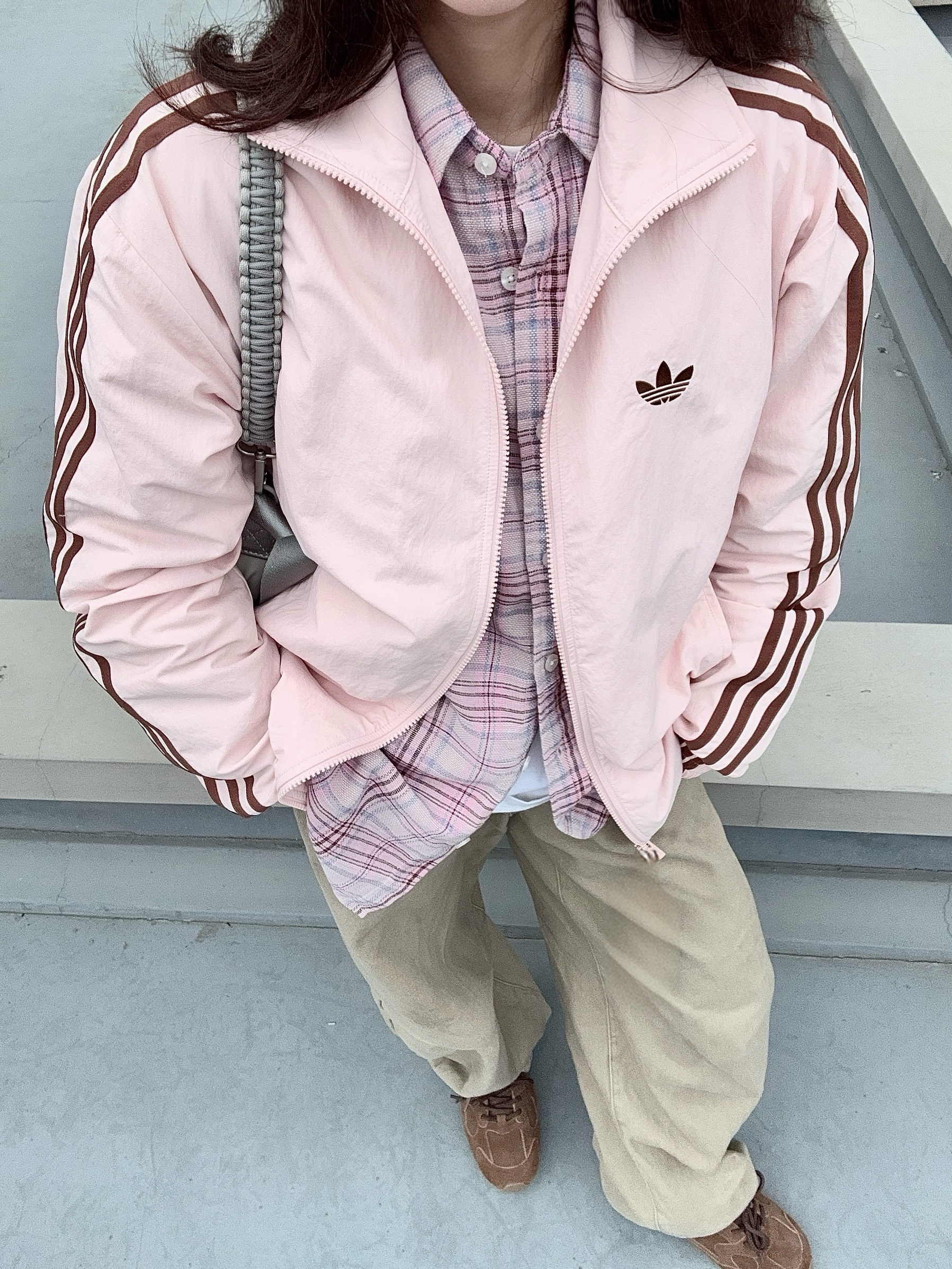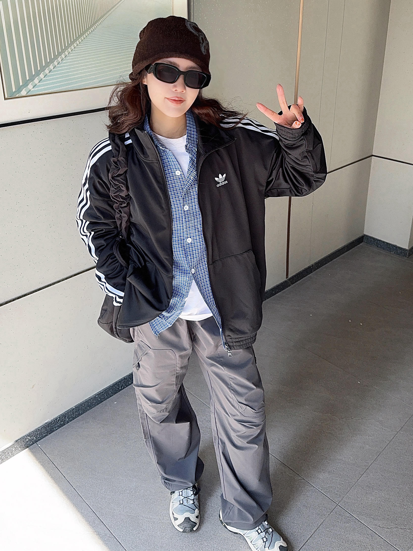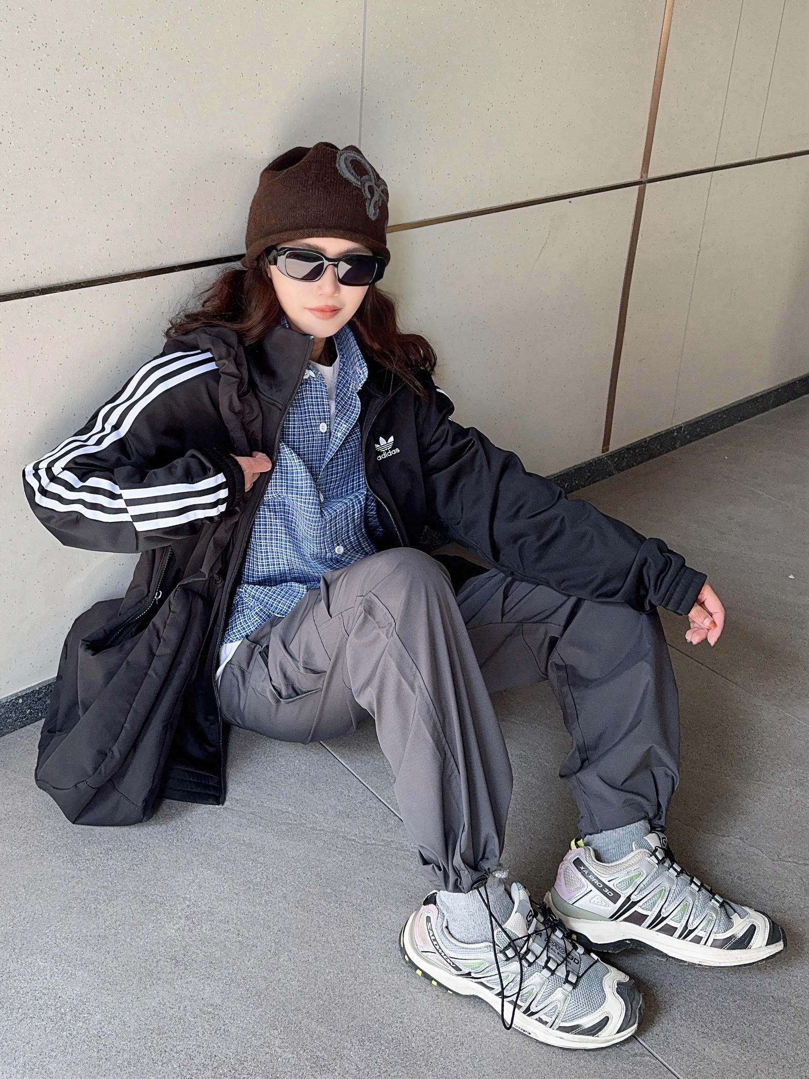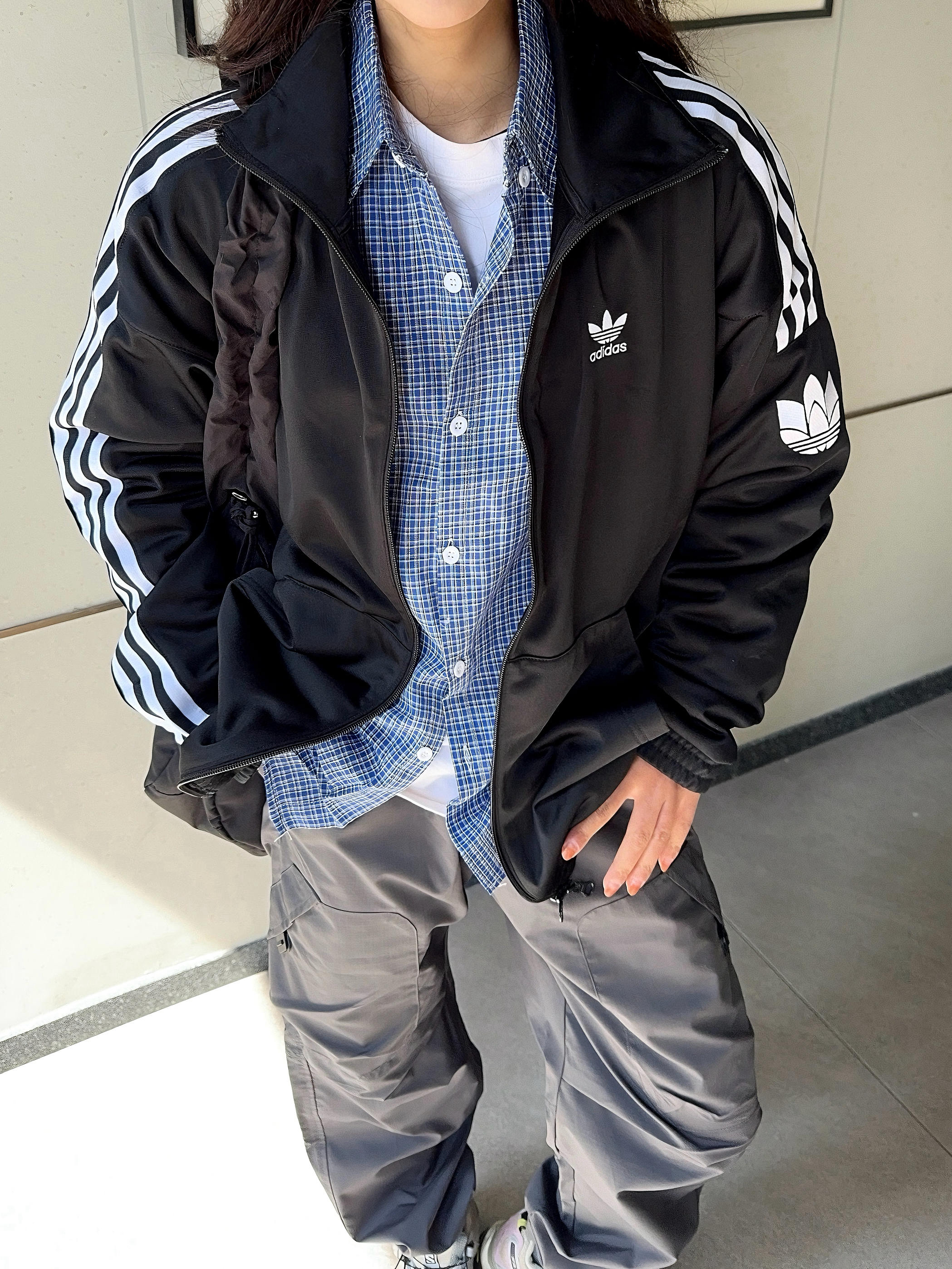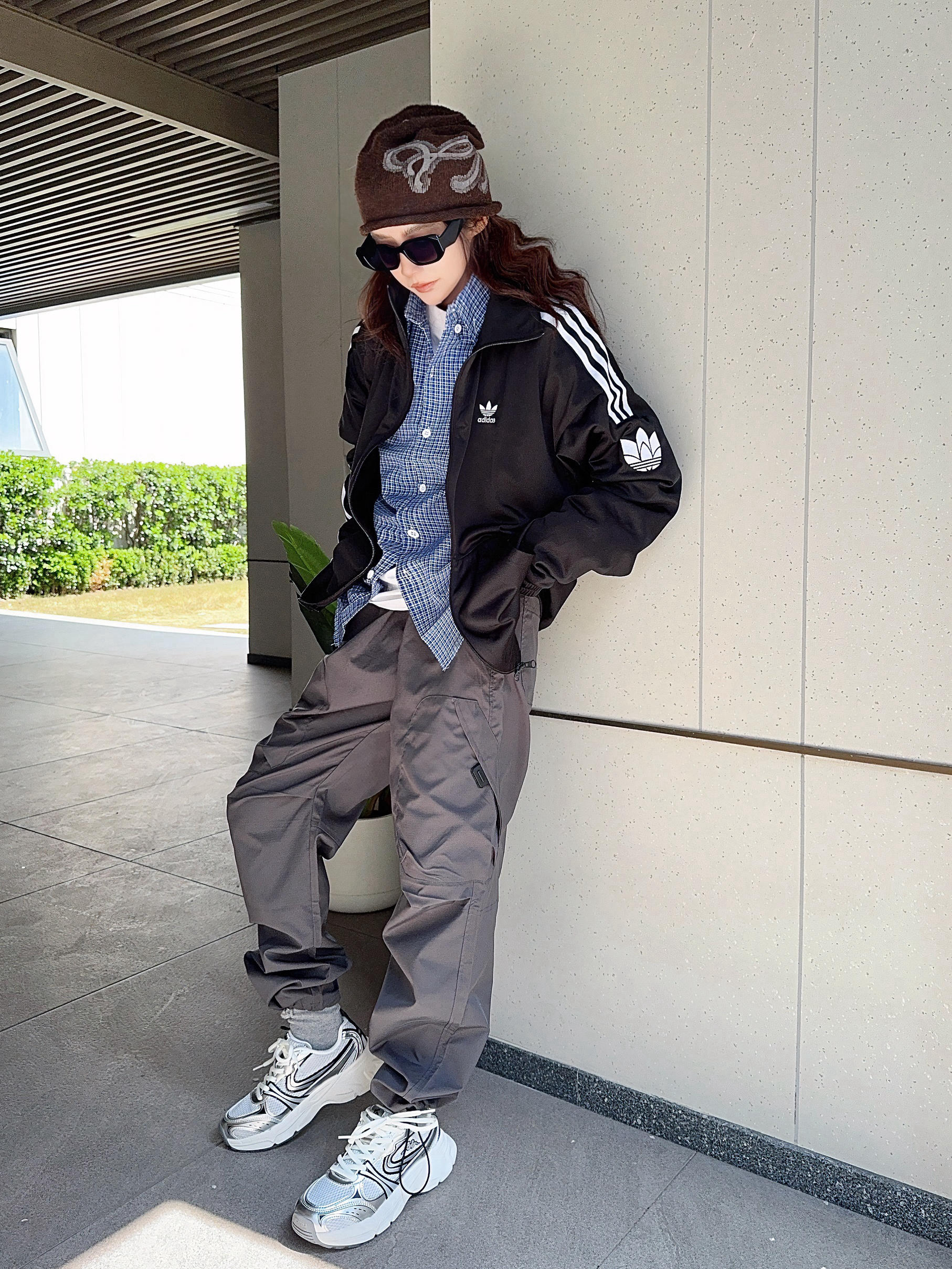 春天当然要穿阿迪夹克啦! 黑色夹克叠穿蓝色格子衬衫, 再穿一双跑鞋, 妥妥的时髦复古休闲范儿, 男女生穿都很酷呢!