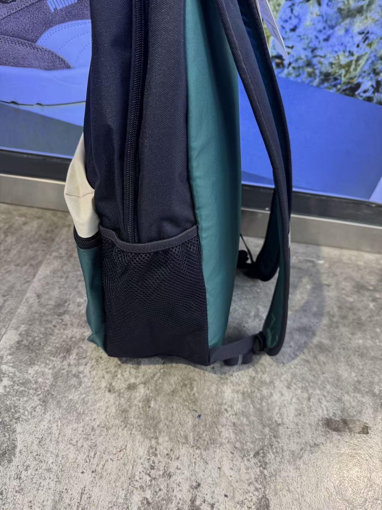 🎒PUMA拼色双肩包,型号091175,采用海军蓝、红色、绿色拼接设计,搭配白色Logo,简约又活力满满✨。防水面料,日常通勤或户外都OK,小雨天也不怕。容量适中,能装下13寸笔记本和日常用品,背带加厚+透气背垫,久背也舒适。拉链是绿宝石色,