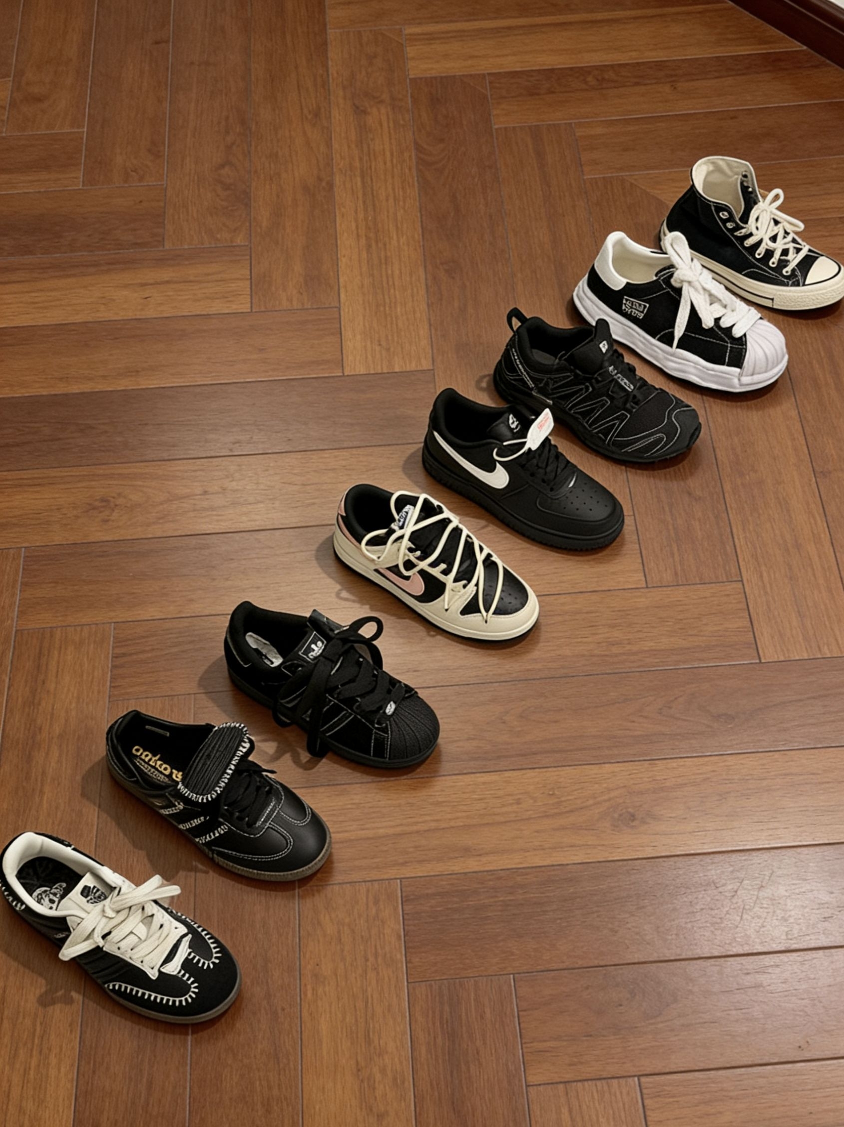 终于凑齐这波宝藏鞋款,虽然颜色单调但每双都踩在我的审美上!黑白配色身为经典中的经典,不管搭牛仔裤、卫裤还是休闲裤都可以轻松拿捏氛围感,出门搭配不费心 但通过长时间的穿着明显可以感觉到,这几双鞋子在设计上都偏向与瘦脚与低脚背,所以脚宽脚胖的朋友们要拍大一码,在脚感方面这几双鞋子确确实实不如运动鞋,不过因为是薄底款所以也不能要求在多,毕竟颜值在那摆着呢嘛。 不管是经典德训款还是魔术贴板...