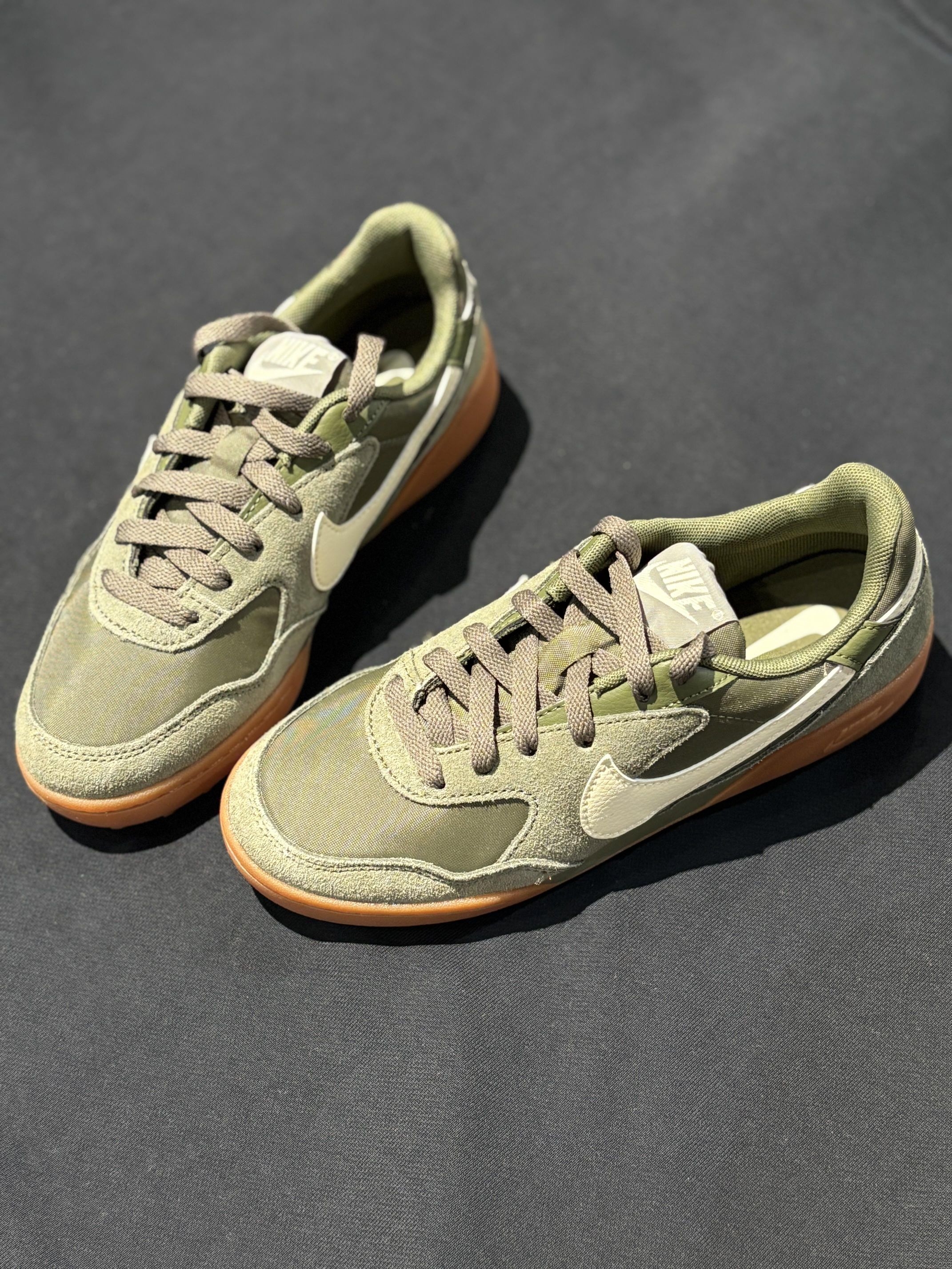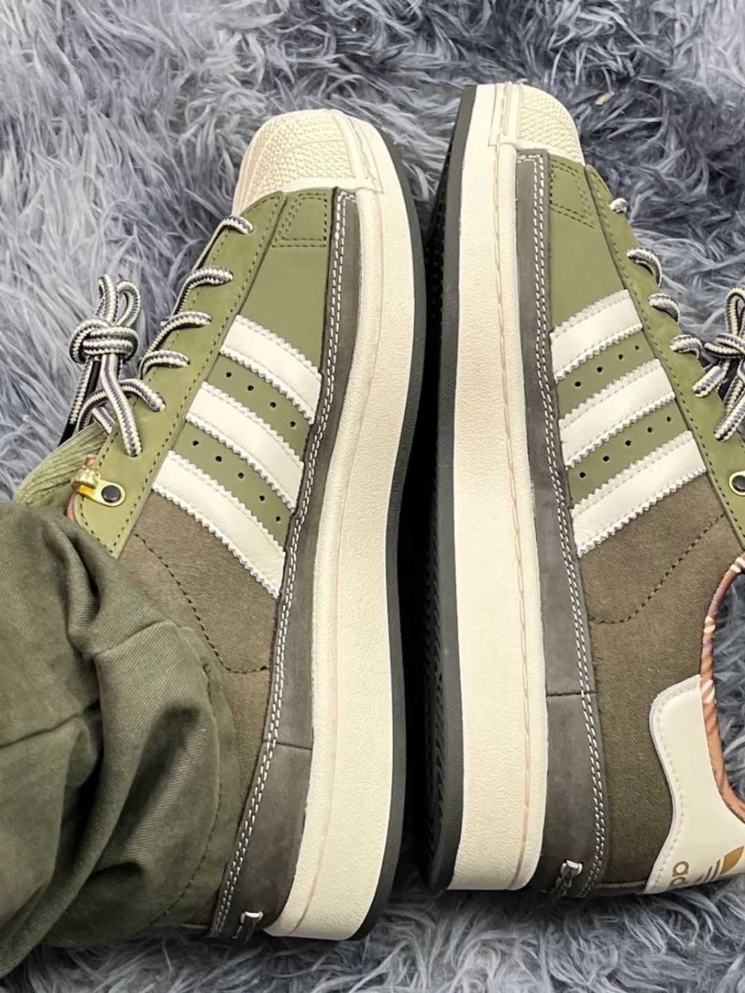 谁能拒绝这双自带滤镜的adidas贝壳头! 橄榄绿+深棕拼接,像把秋日森林穿在脚上,厚底设计悄悄增高3cm,小个子狂喜✨ 编织鞋带+金属鞋眼,细节拉满,配工装裤、牛仔裤都超有美式复古那味儿,走在街上回头率直接拉满! 做旧米白底自带年代感,麂皮+帆布材质质感在线,秋冬穿保暖又百搭,简直是鞋控的本命款!