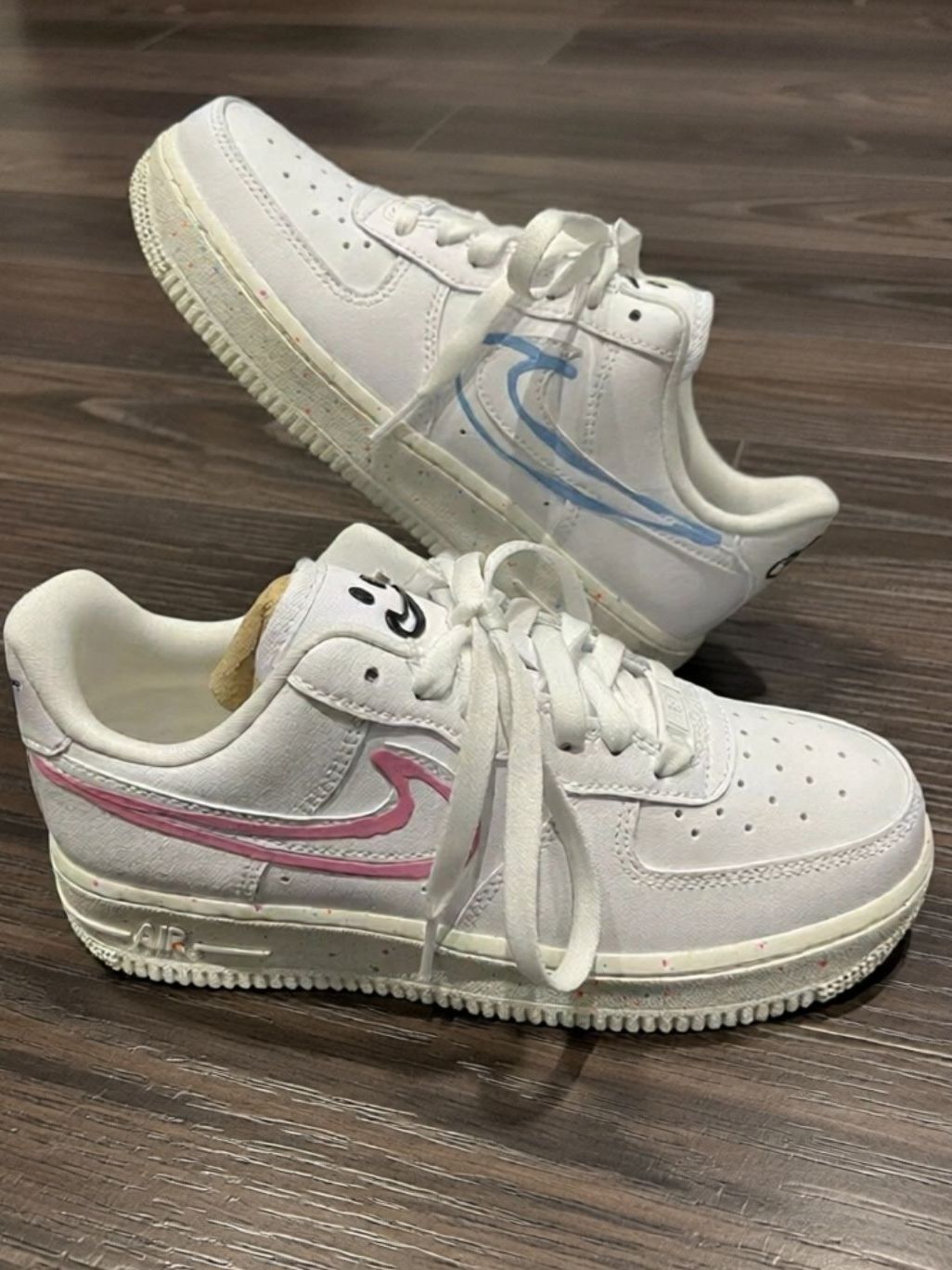 谁懂啊!这双定制款AF1也太会了! 纯白鞋面+粉蓝鸳鸯涂鸦勾,像把春日樱花与晴空踩在脚下✨ 环保彩点中底自带复古滤镜,细节拉满,完全不撞款! 鸳鸯设计超吸睛,浅蓝温柔,玫粉甜酷,一双鞋解锁两种风格~ 配牛仔裤是元气少女,搭裙子就是温柔学姐,春天穿它出门,回头率直接拉满!
