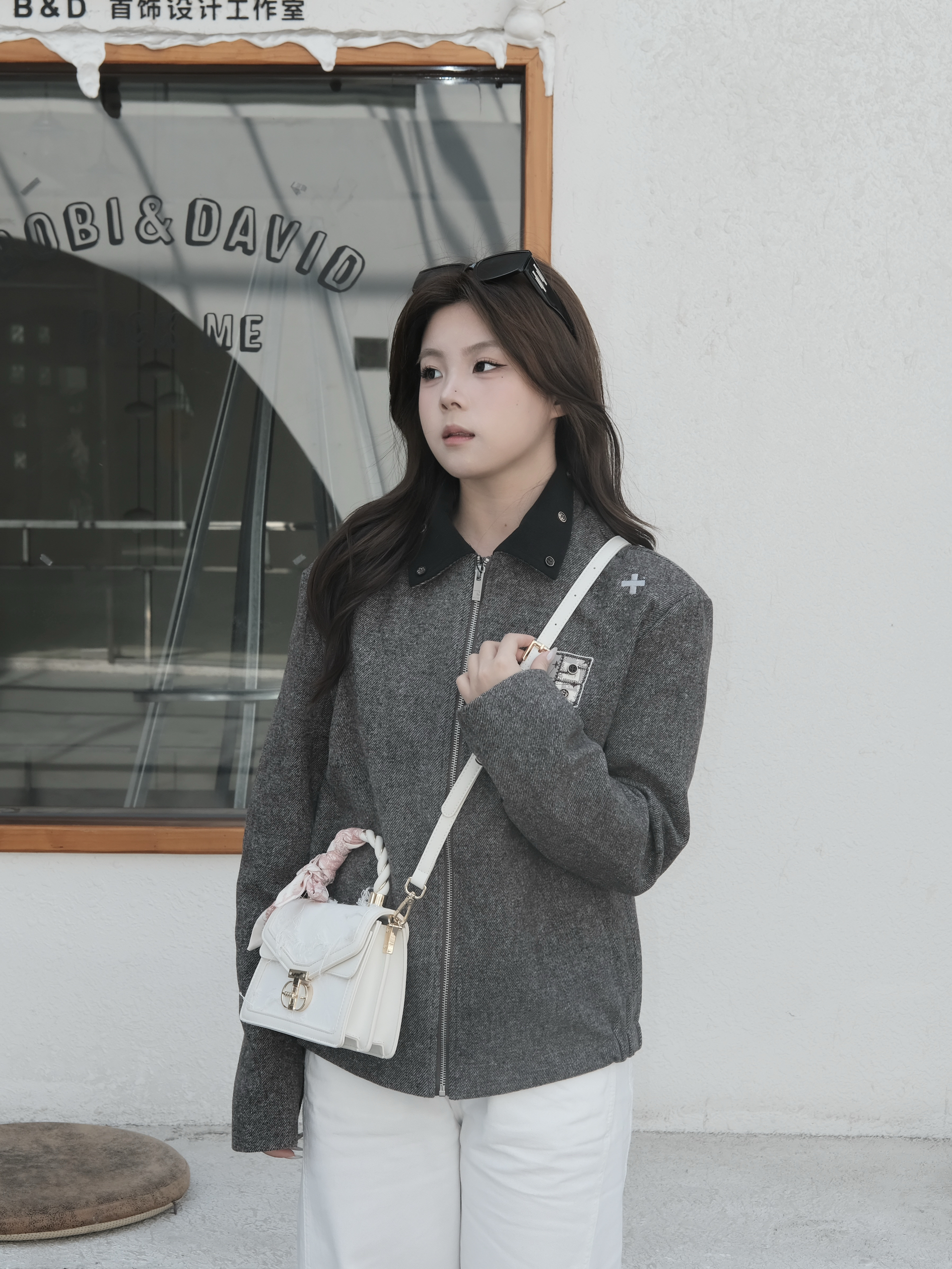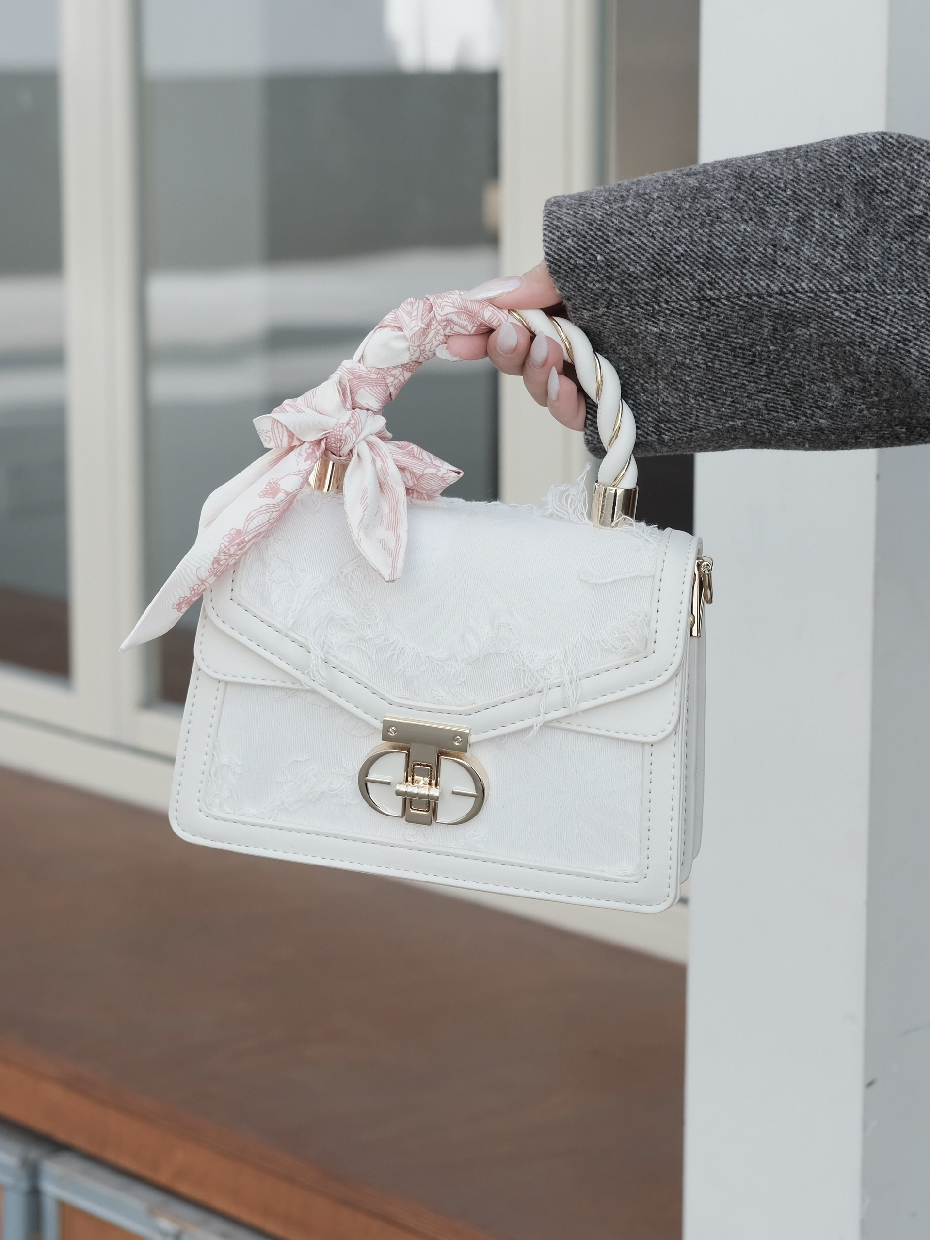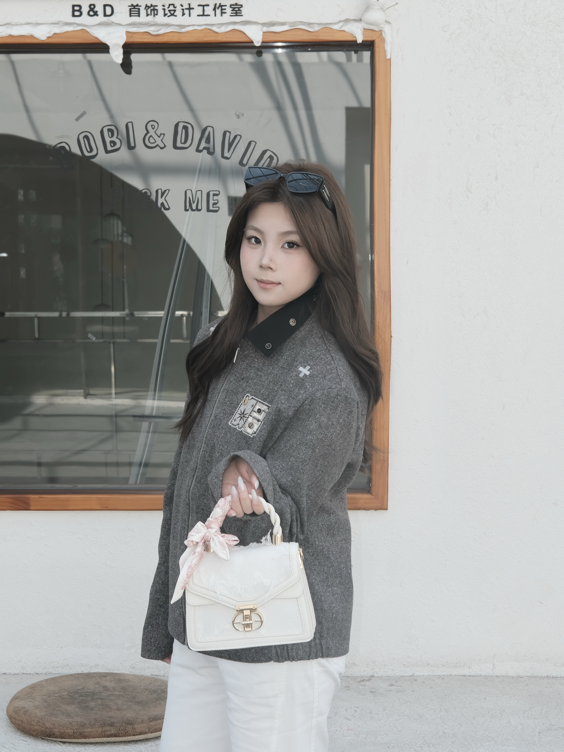 深灰夹克搭牛仔 手提白色凯莉包 解锁开春甜酷穿搭 给包包👜搭配了一条丝巾 有种精致的国风感 可以手提也可以单肩斜挎 容量日常出门也足够