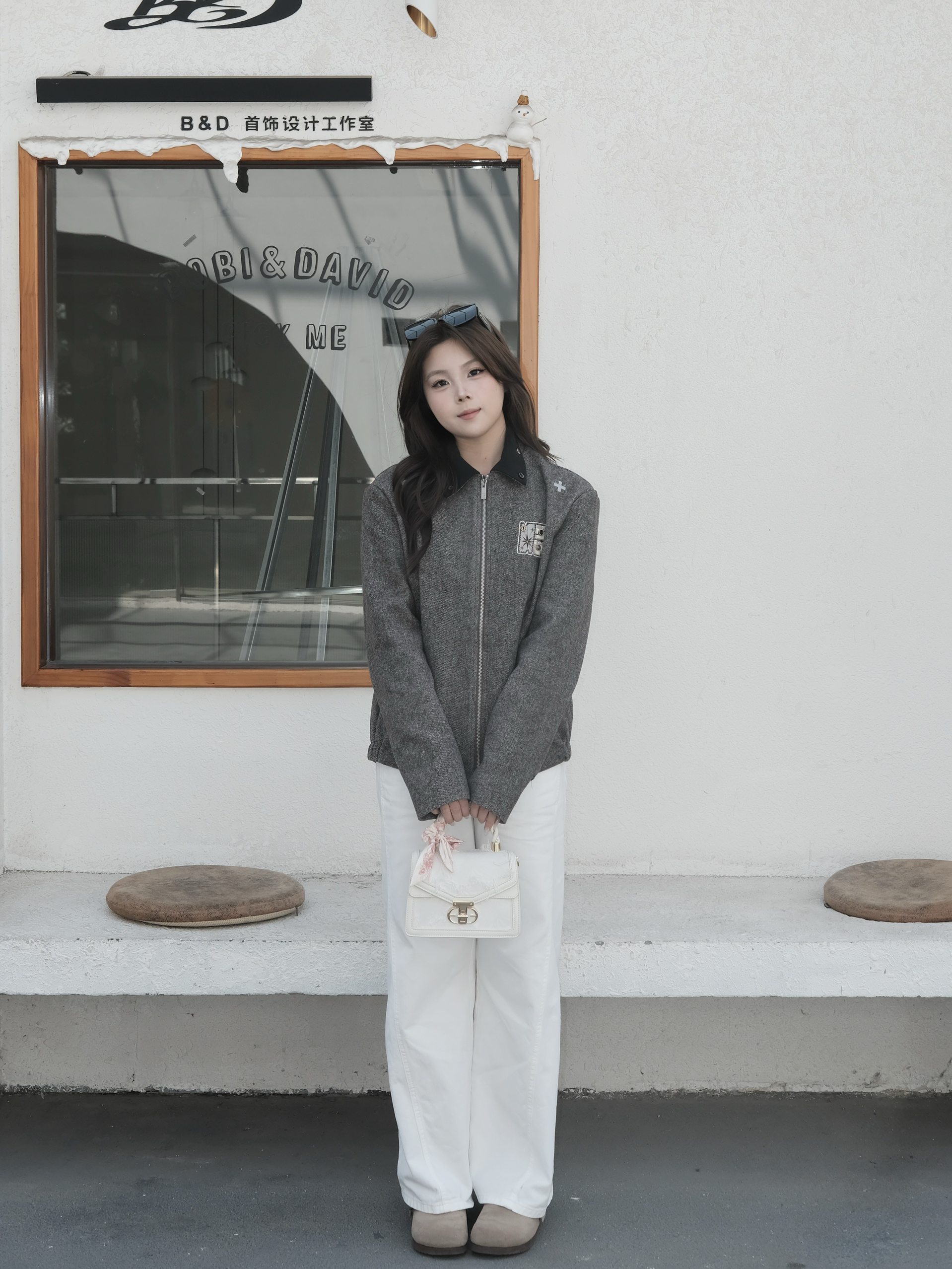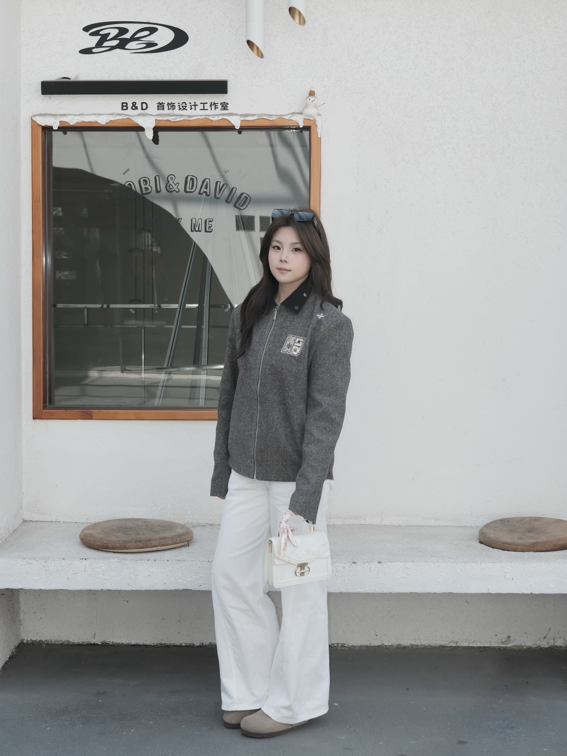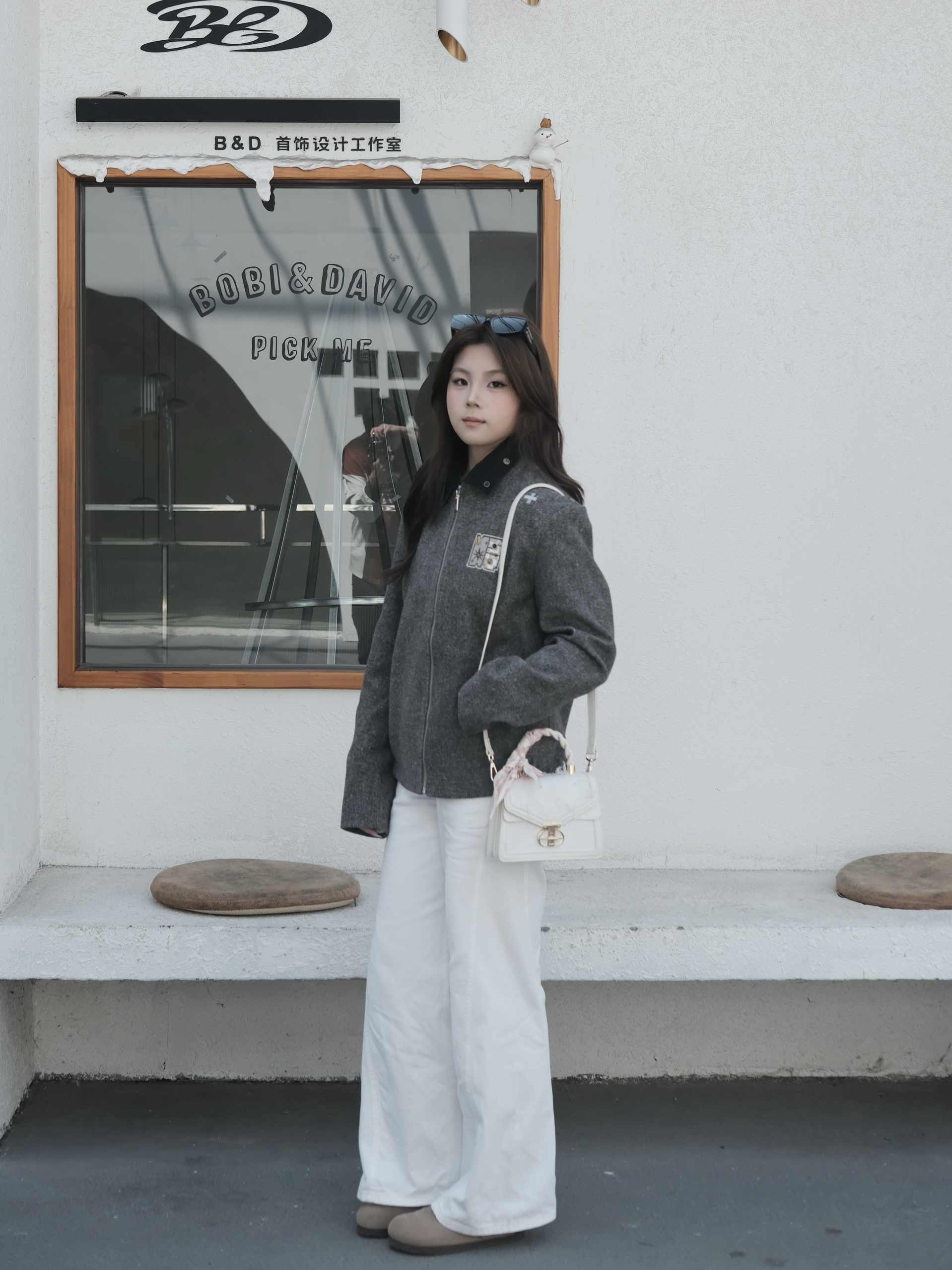 深灰夹克搭牛仔 手提白色凯莉包 解锁开春甜酷穿搭 给包包👜搭配了一条丝巾 有种精致的国风感 可以手提也可以单肩斜挎 容量日常出门也足够