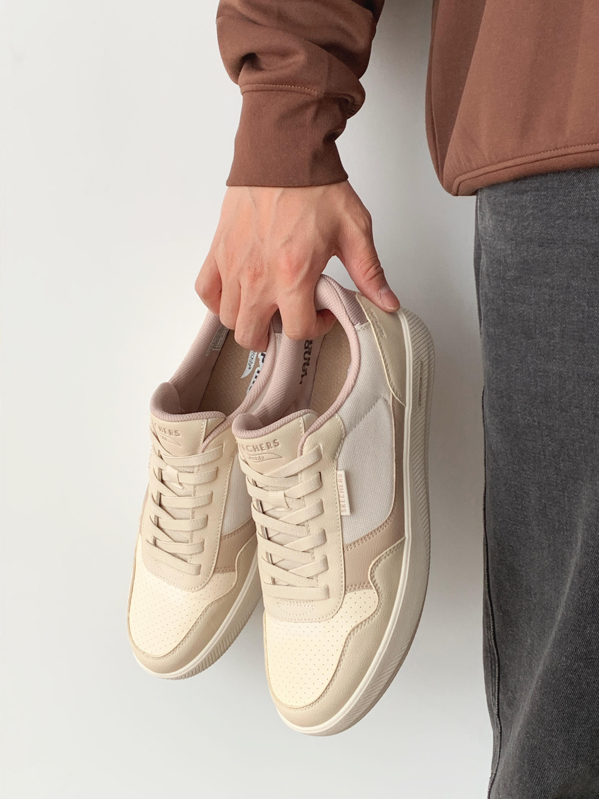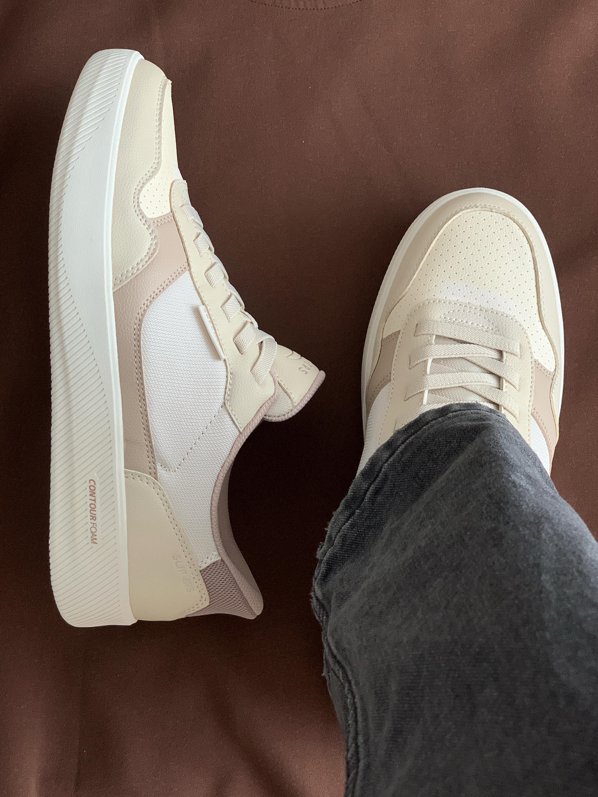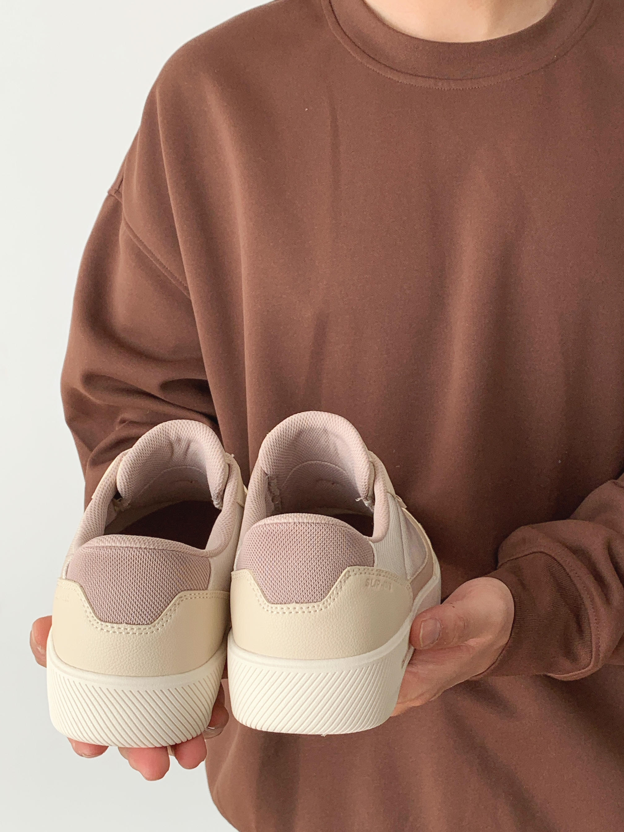 这双鞋的配色好像栗子蛋糕哦 浅浅的米色搭配浅咖 看着就是很温柔的样子 搭配我的咖色卫衣 早春也可以把美拉德玩出彩