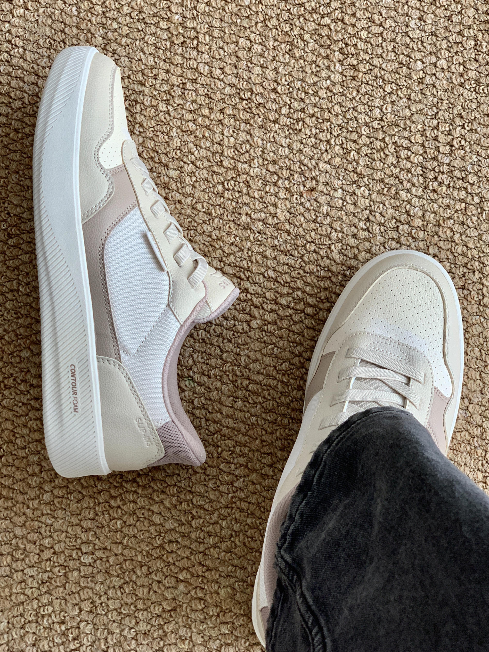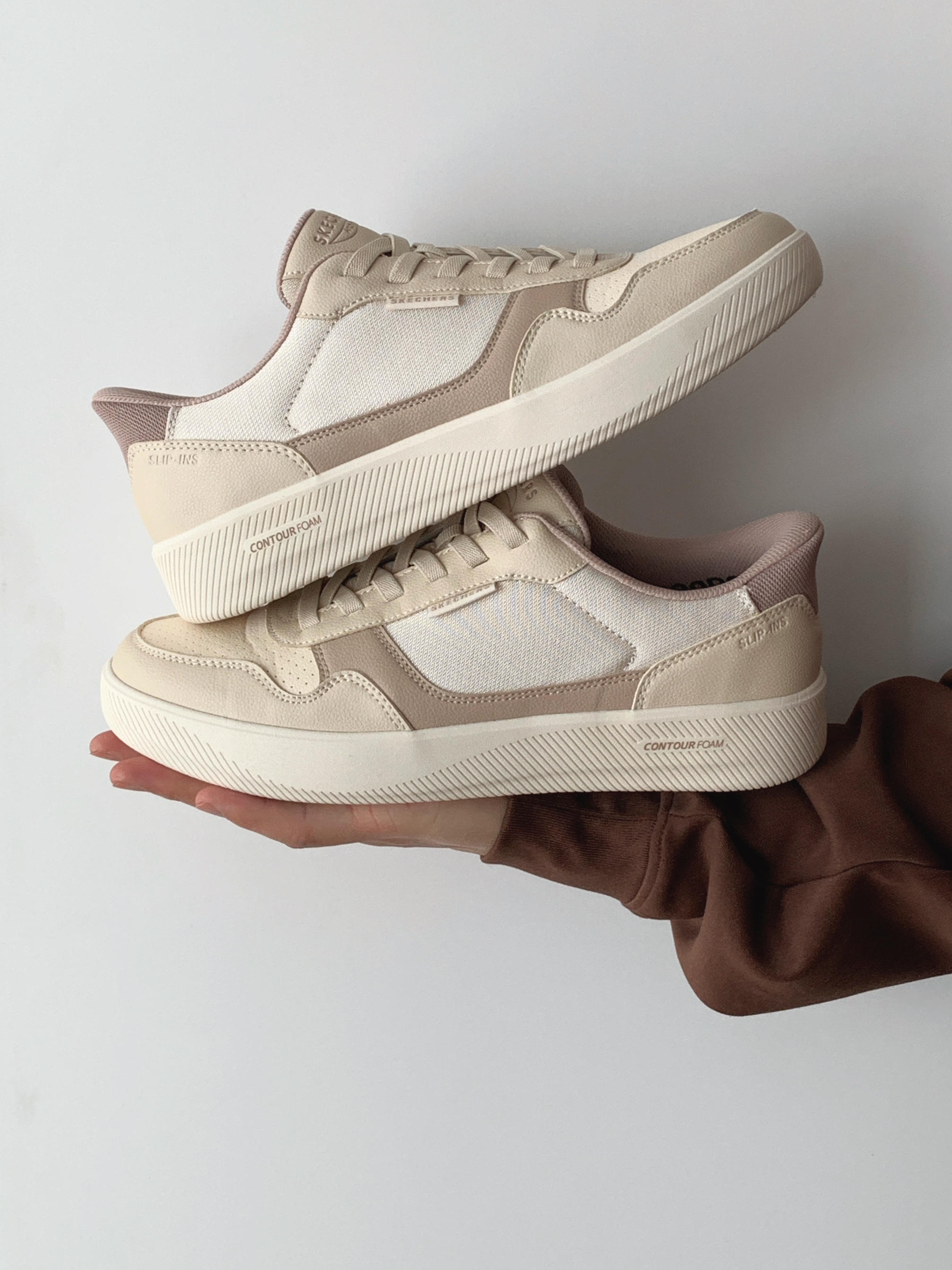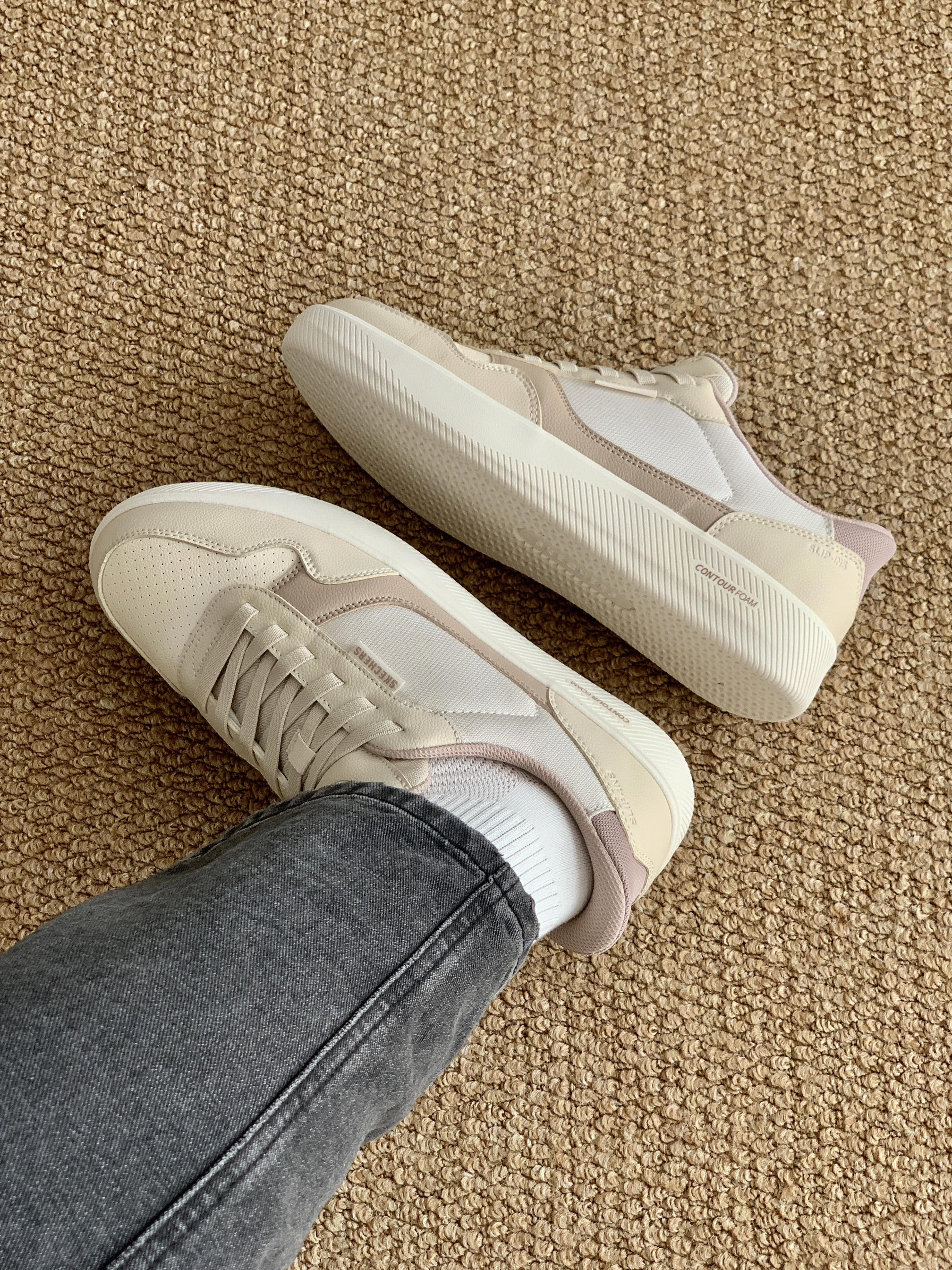 这双鞋的配色好像栗子蛋糕哦 浅浅的米色搭配浅咖 看着就是很温柔的样子 搭配我的咖色卫衣 早春也可以把美拉德玩出彩