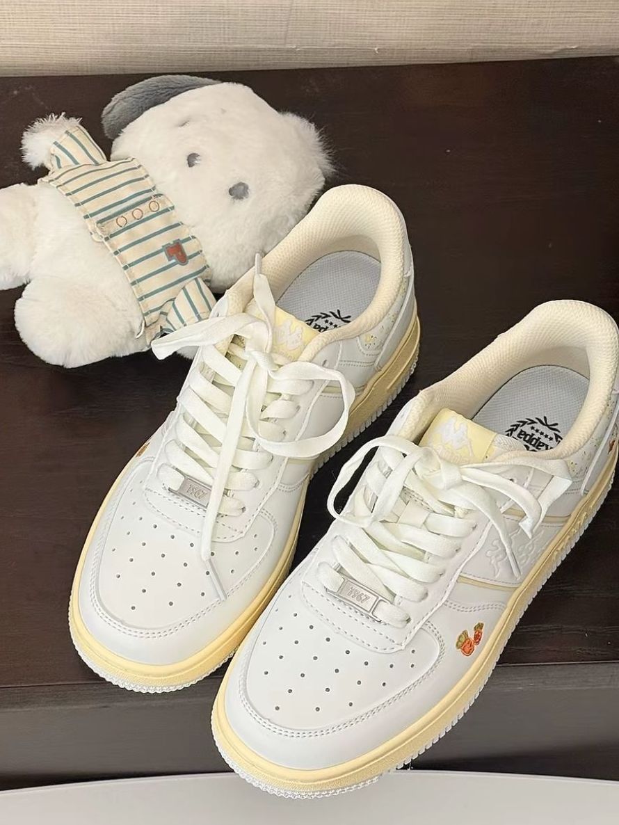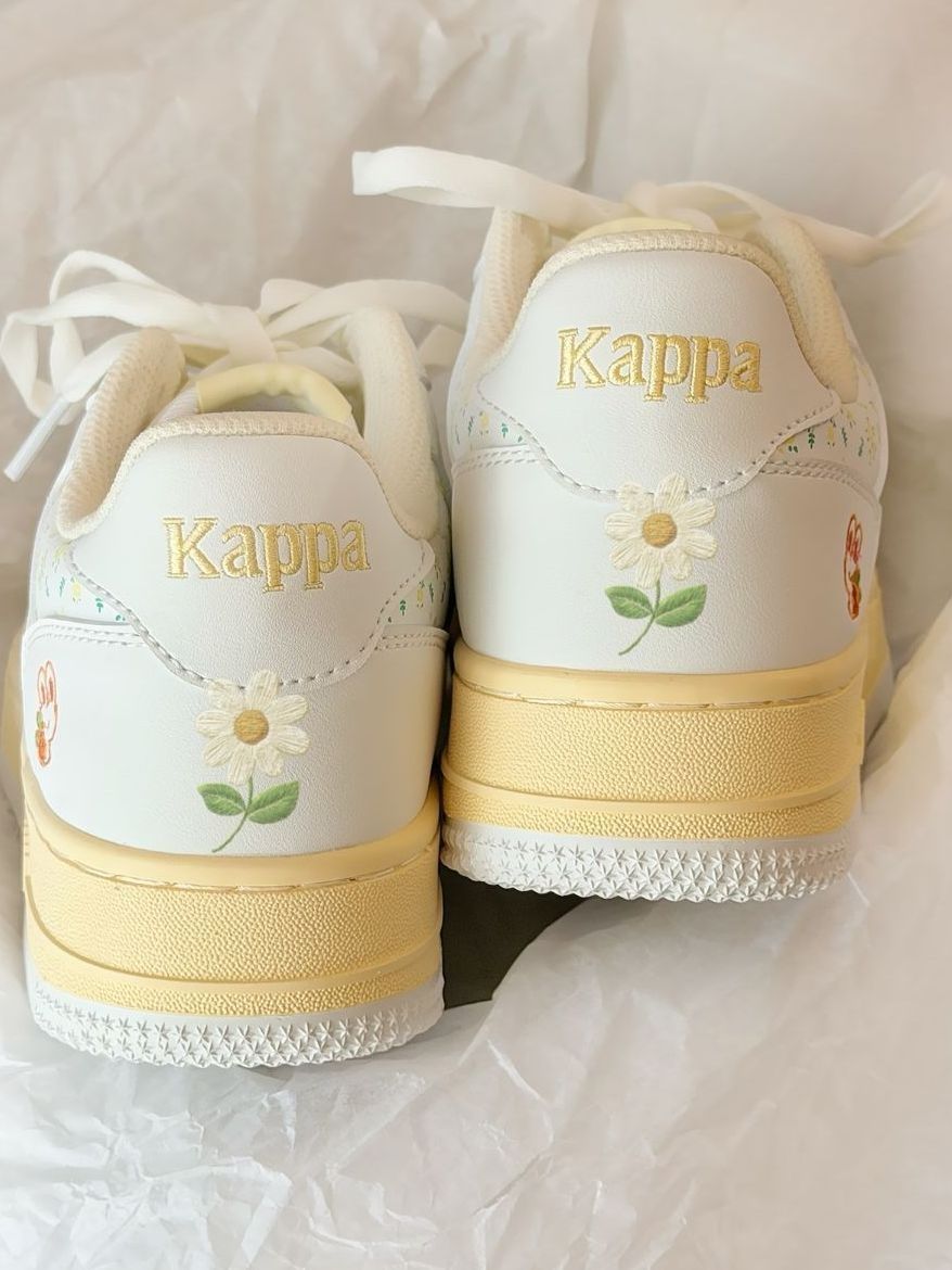 谁能拒绝这双Kappa兔年限定板鞋!胡萝卜小兔刺绣+小碎花细节,奶白+米黄配色温柔又干净,空军版型显脚小还增高,搭配百褶裙超甜,甜妹闭眼冲~