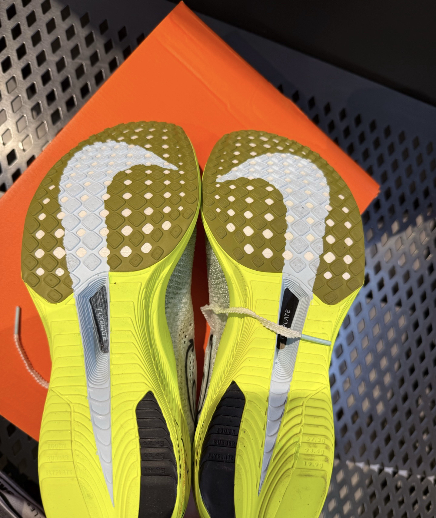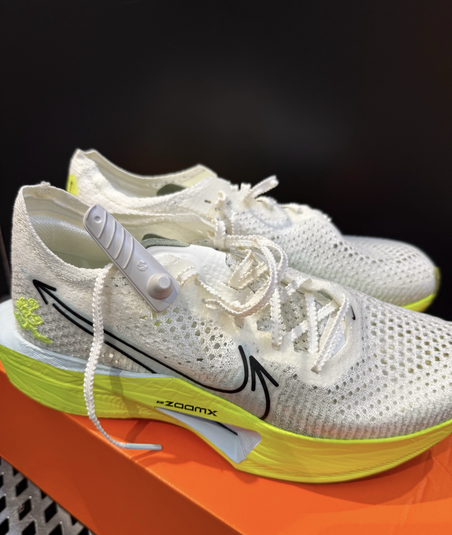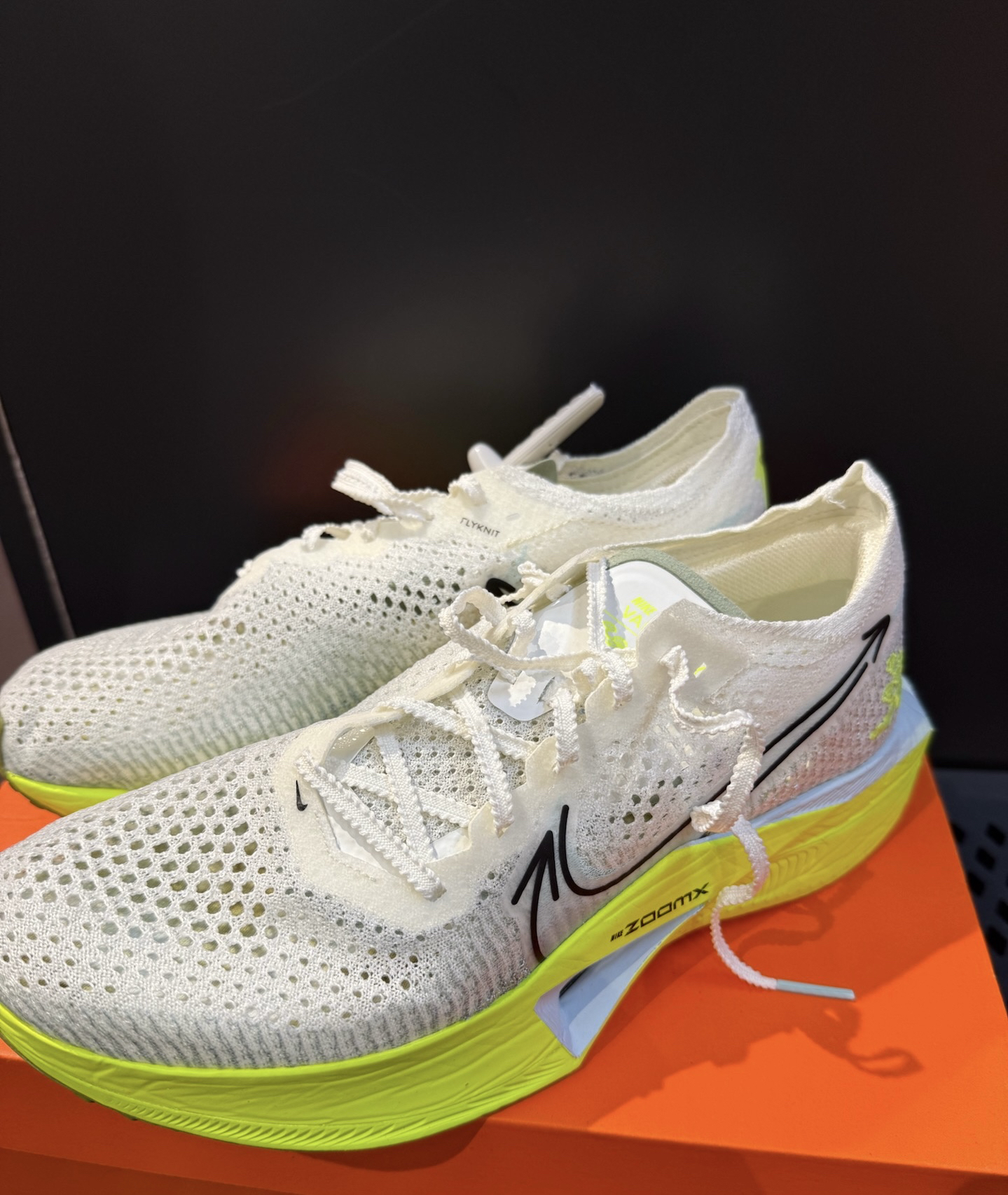 整体采用一个荧光黄白的一个配色☝️ 给人一种清新自然的感觉🏠 鞋面采用Flyknit编制面料透气且舒适😮 中底采用前掌zoomx缓震的同时增加脚感和弹性💌 鞋底采用经典橡胶外底结合华夫格底纹🎊 防滑耐磨的同时大大增强抓地力🥶 经典的是flyplate碳纤维板可以极大的增加助推弹力🔥