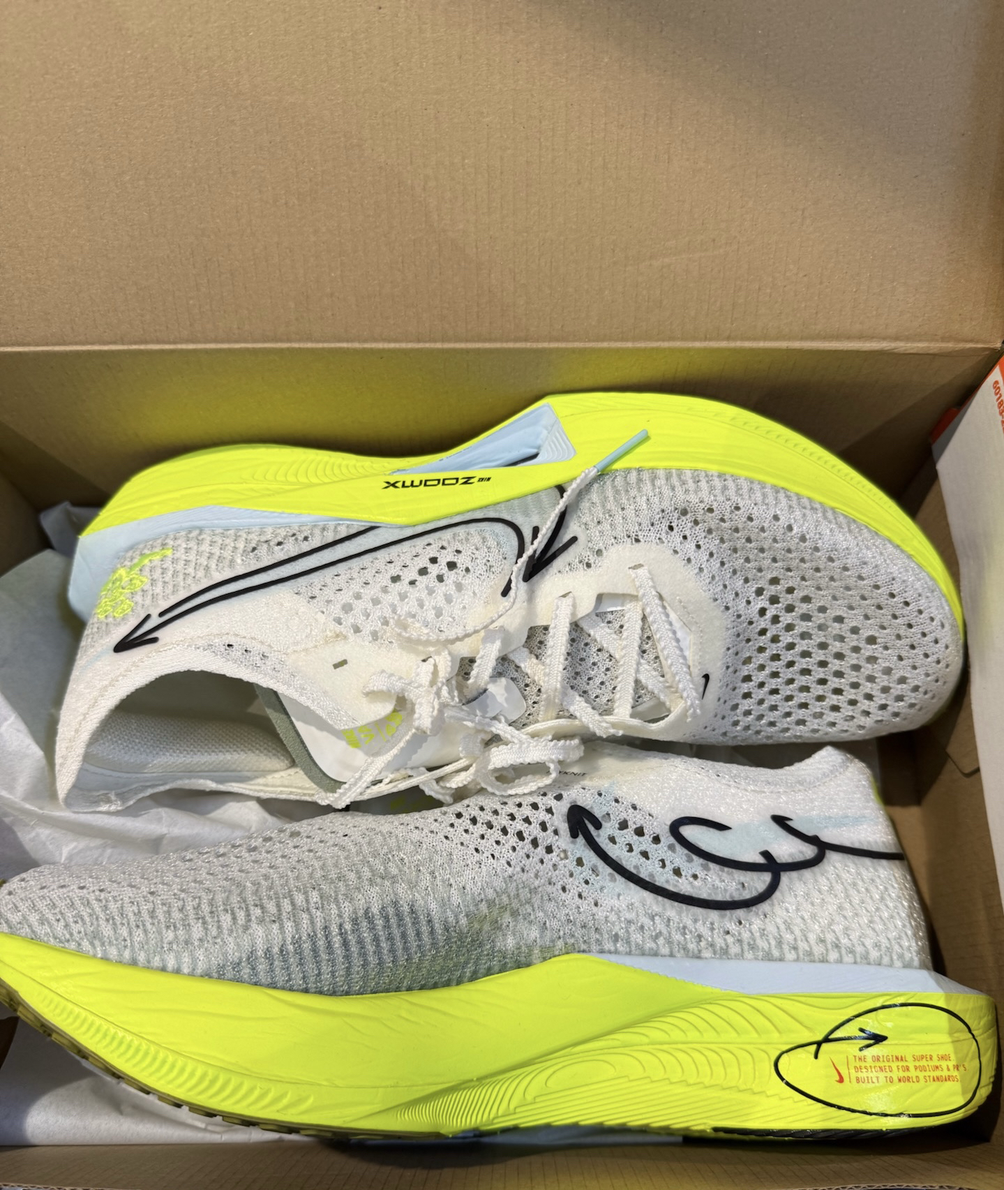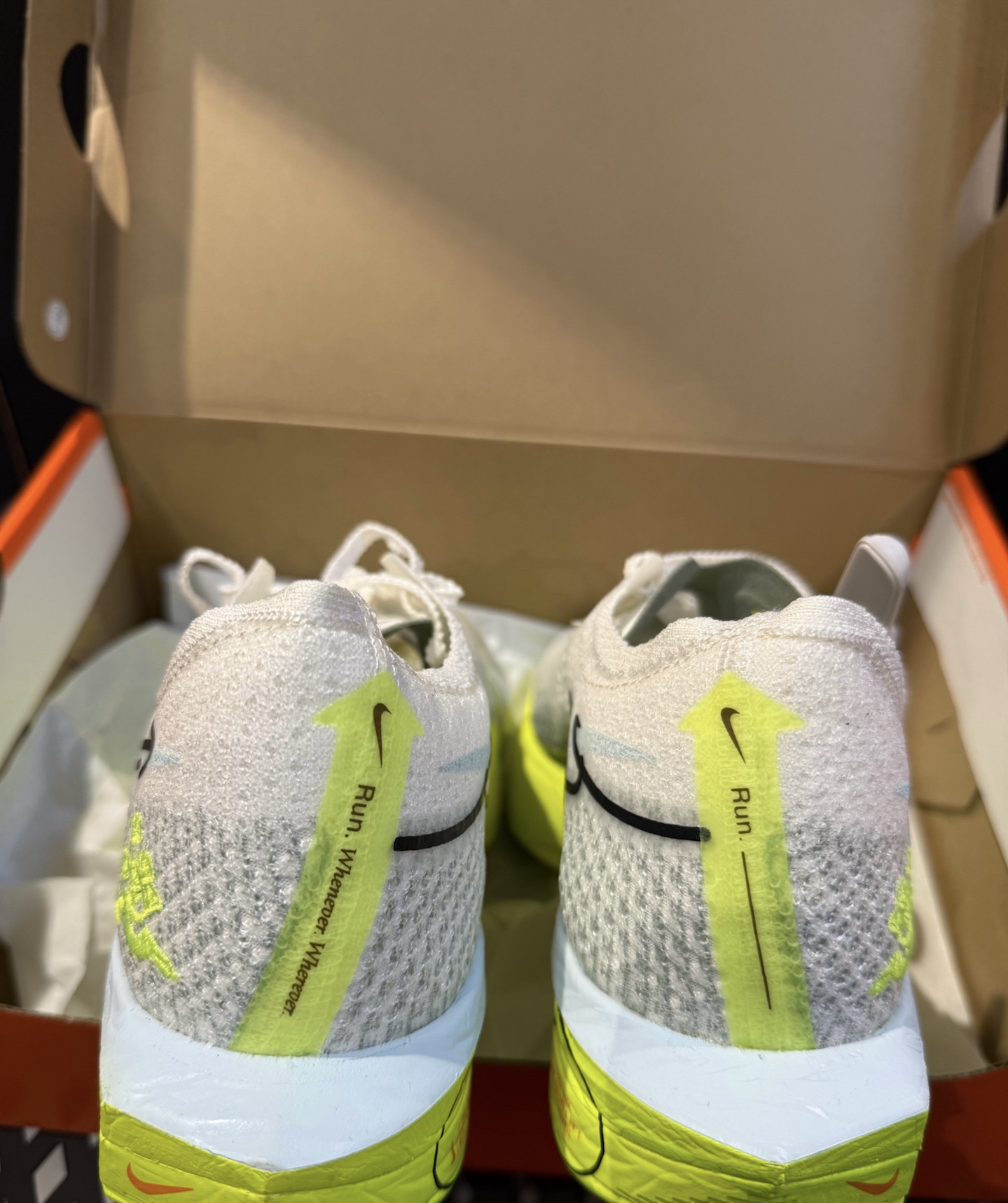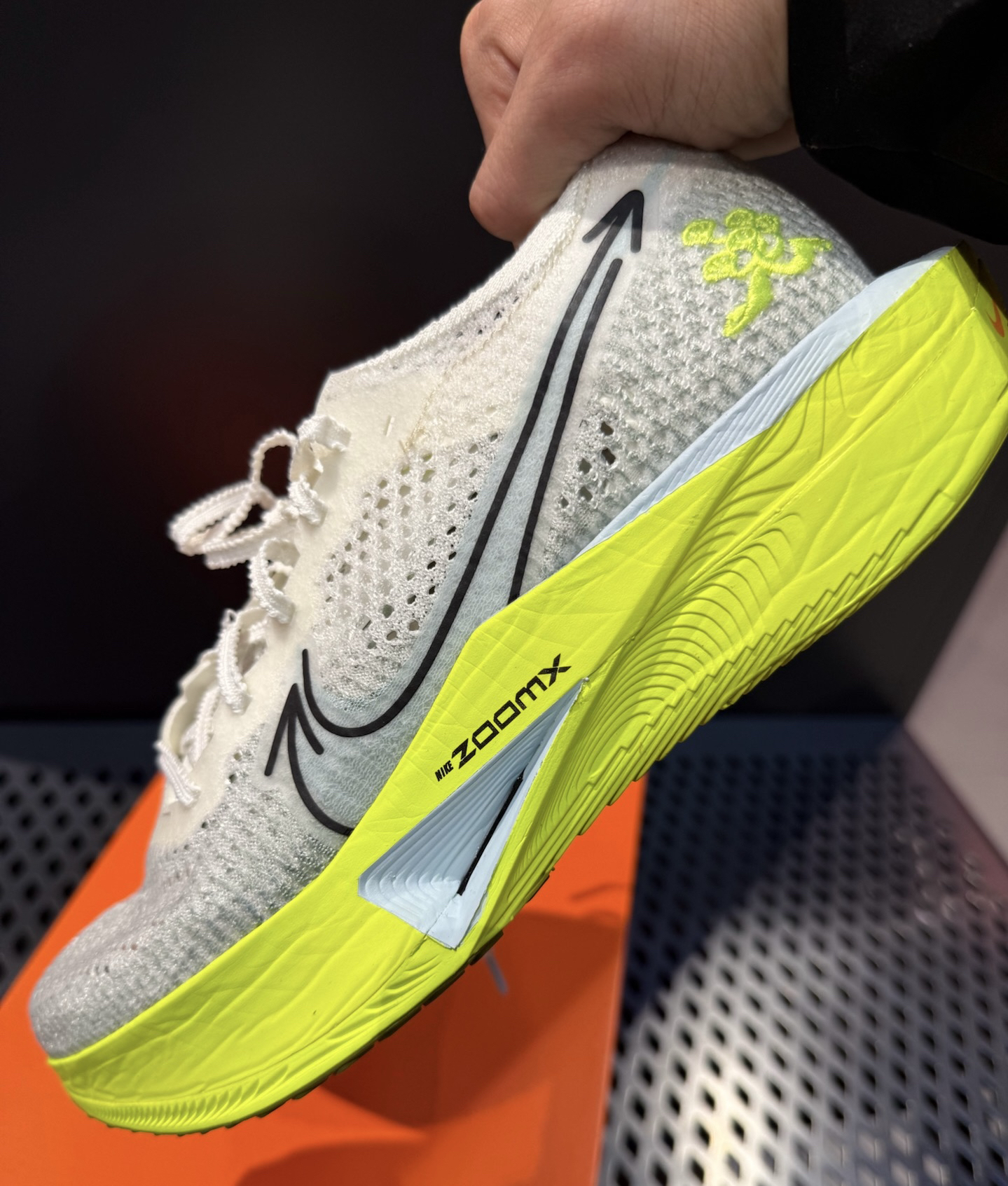 整体采用一个荧光黄白的一个配色☝️ 给人一种清新自然的感觉🏠 鞋面采用Flyknit编制面料透气且舒适😮 中底采用前掌zoomx缓震的同时增加脚感和弹性💌 鞋底采用经典橡胶外底结合华夫格底纹🎊 防滑耐磨的同时大大增强抓地力🥶 经典的是flyplate碳纤维板可以极大的增加助推弹力🔥