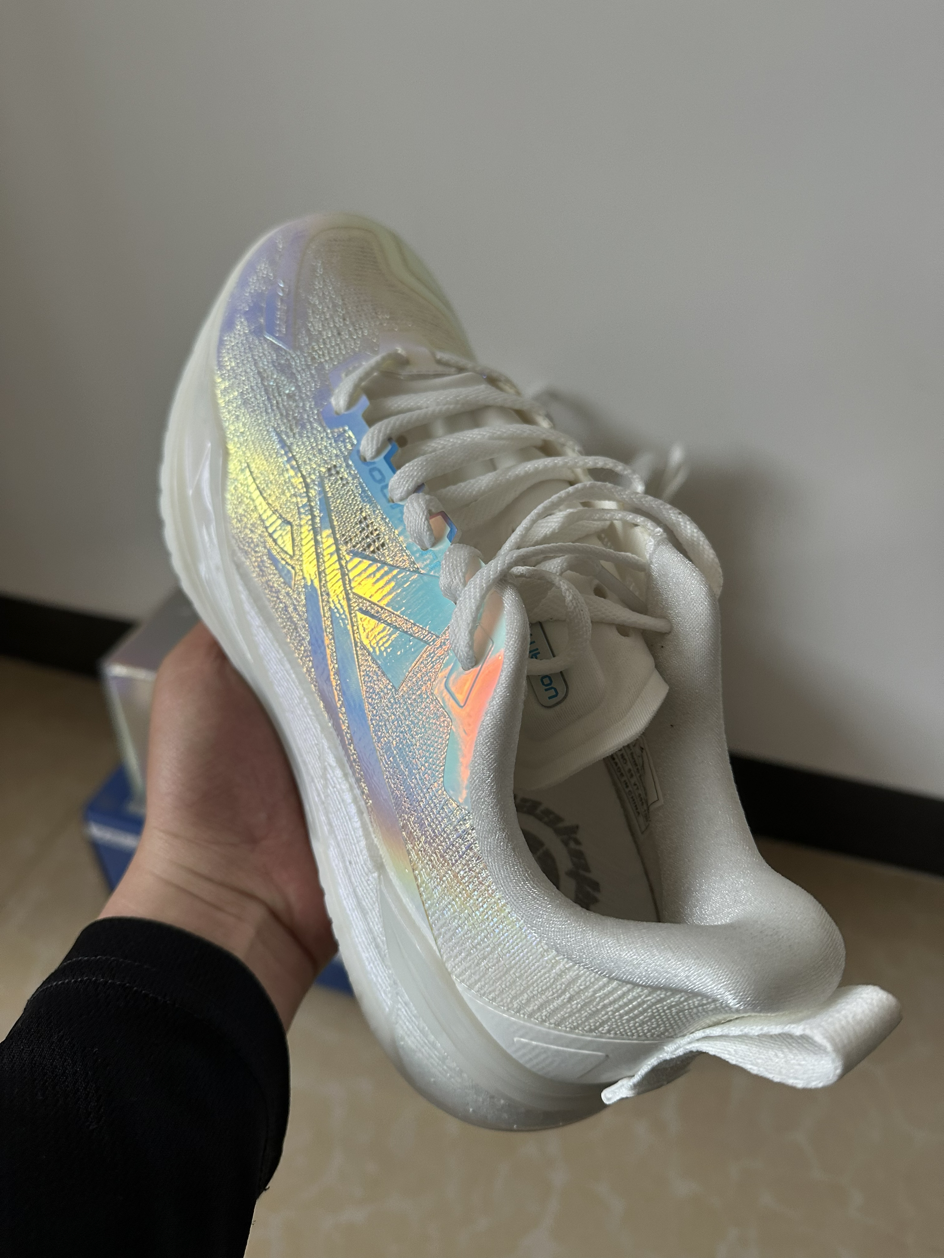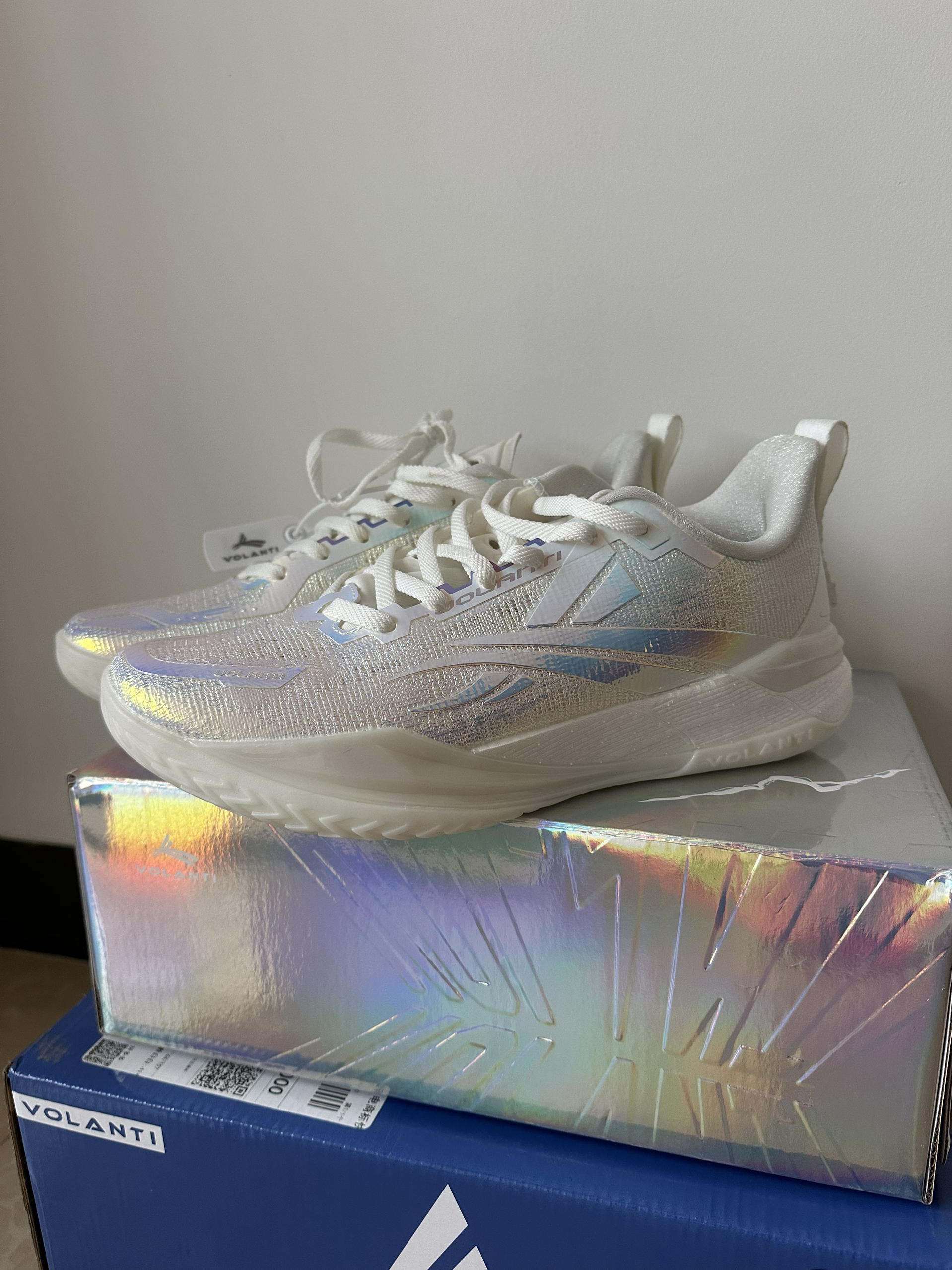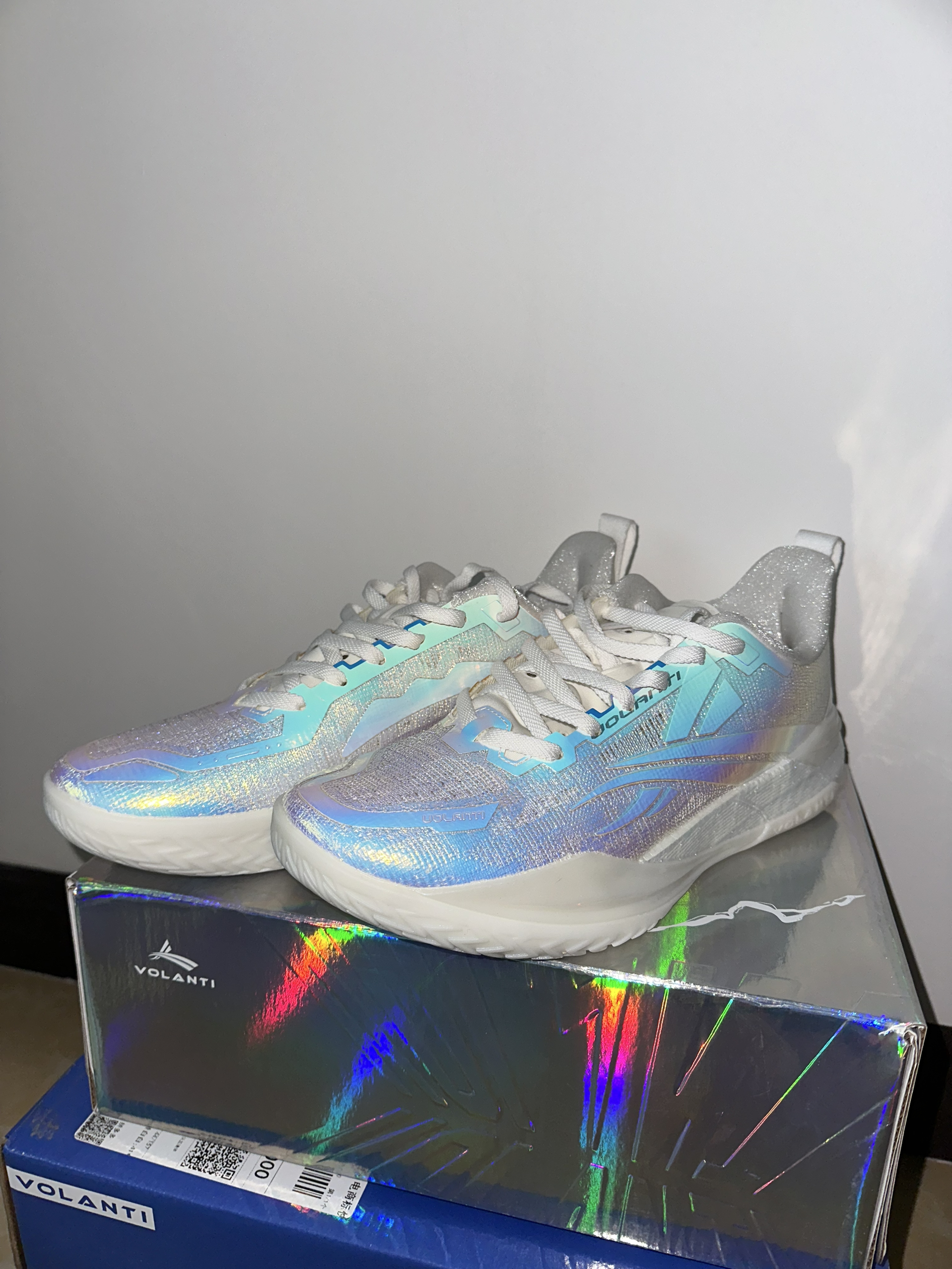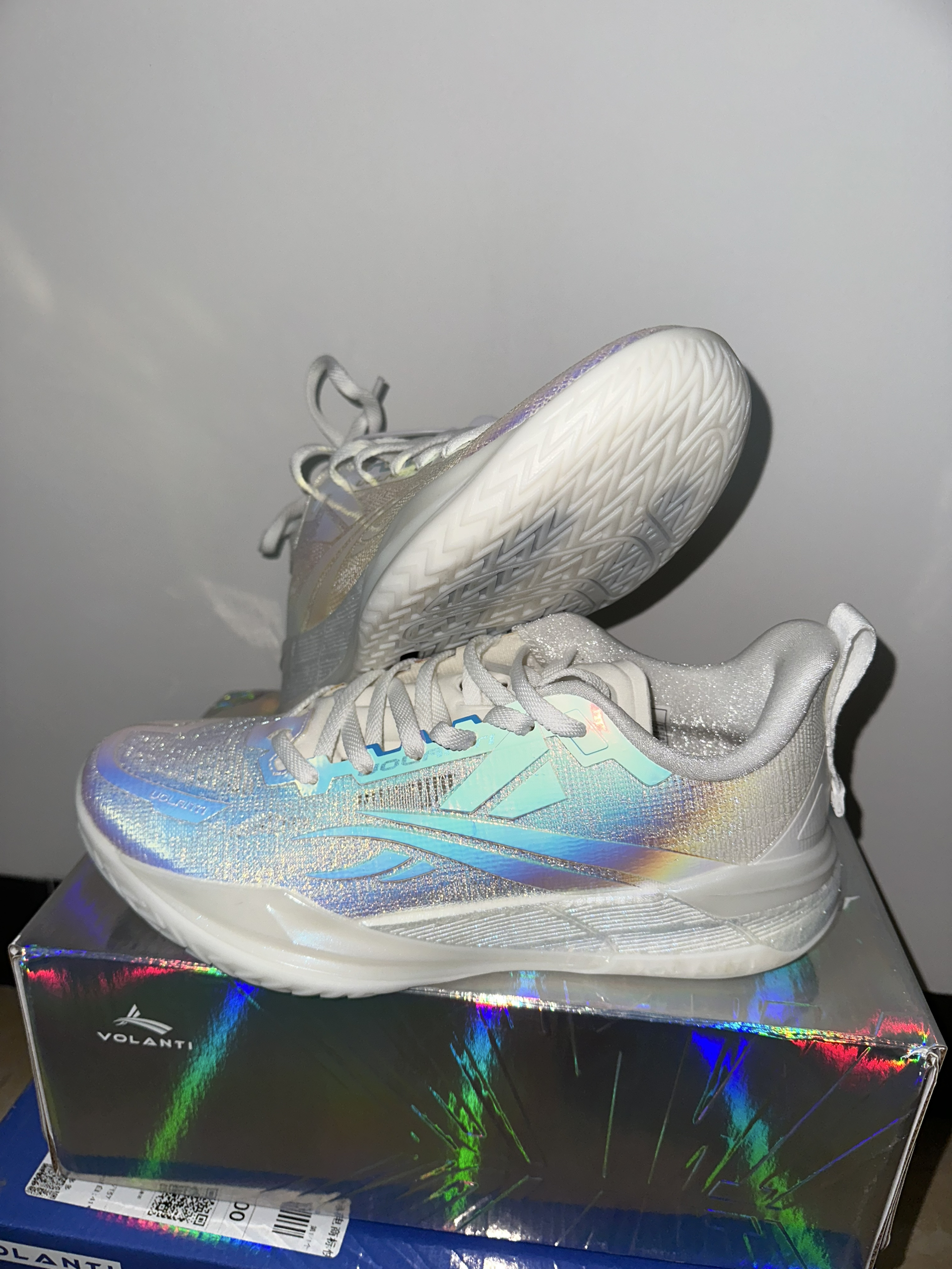 #校园篮球实战党 这周校园联赛开始,开箱刚到手沃兰迪911篮球鞋,镭射蓝银鞋面在灯光下泛着彩虹光泽,鞋身的闪银材质和透明冰底搭配,低帮鞋型勾勒出利落线条。本人一百四十斤比赛时上脚打两节比赛,中底反馈偏韧弹,突破启动蹬地超干脆,场地感拉满。鞋面的包裹紧致不压脚,系紧鞋带后变向稳得很,只是镭射材质有点沾灰,打理起来麻烦。校园球员、颜值党都能穿,就是大体重穿它不清楚缓震够不够?