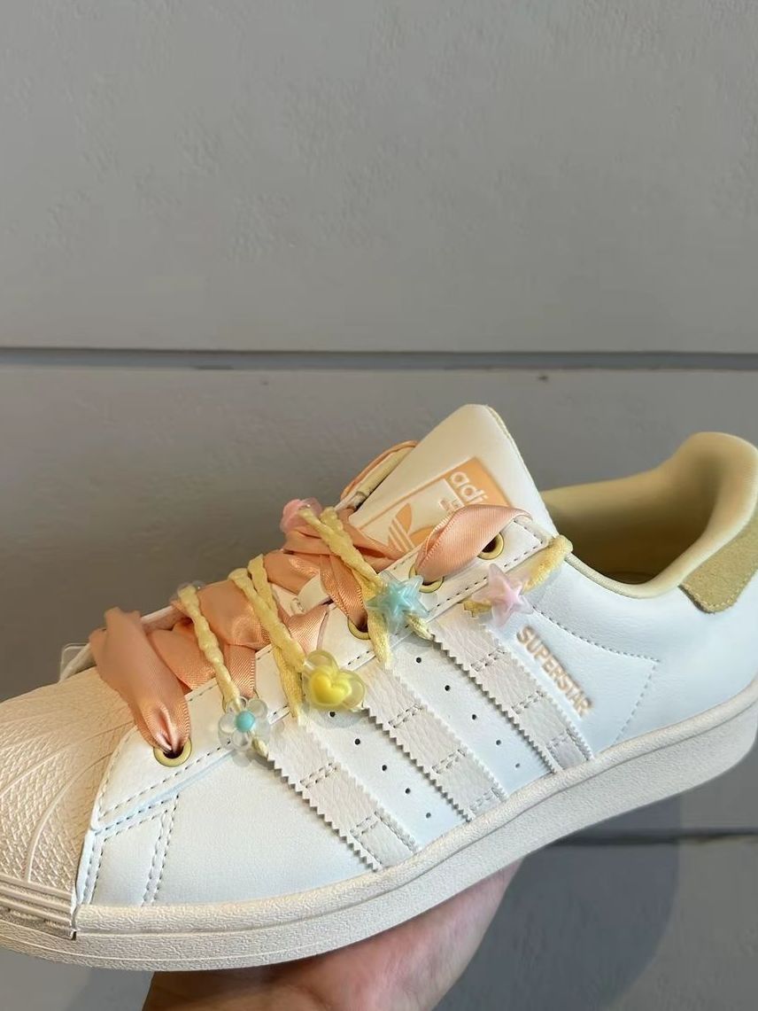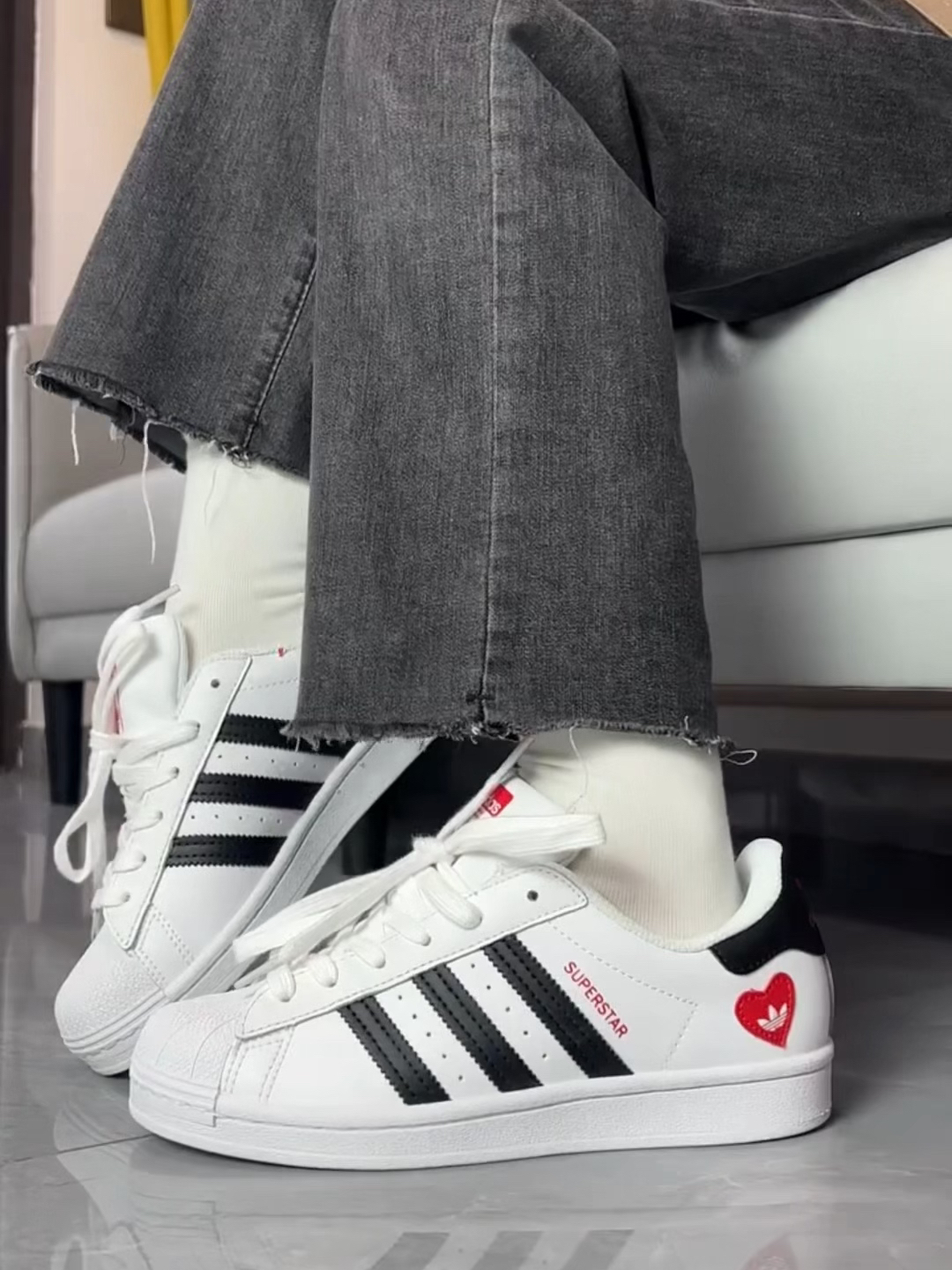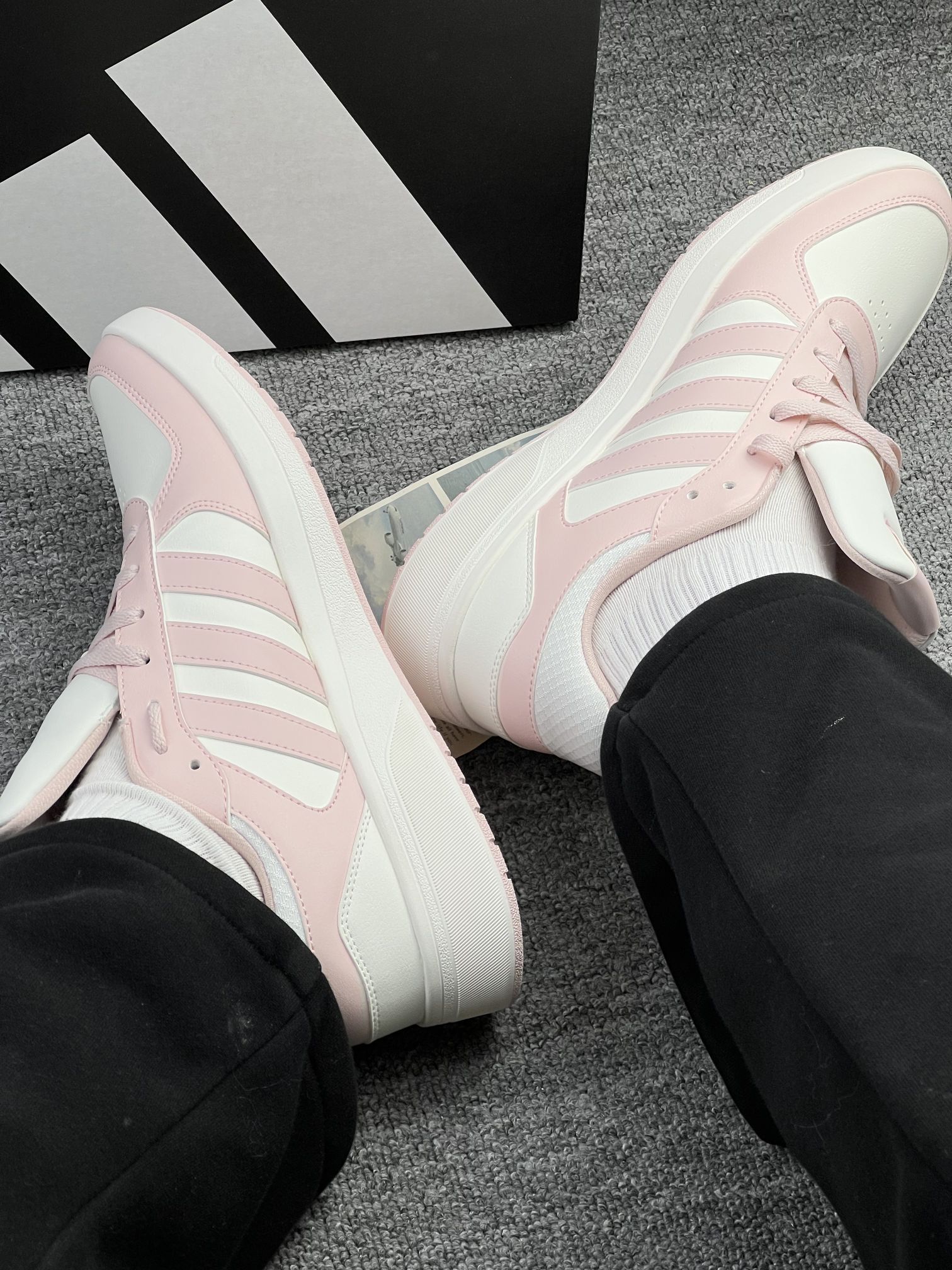 这双粉白阿迪板鞋,是我日常通勤穿得最多的一双。 配色是温柔的奶白粉拼米白,不扎眼,配牛仔裤、运动裤都很和谐,属于耐看型。鞋型偏利落,不会显脚笨,日常走路挺跟脚。 但缺点也挺明显: - 皮面偏硬,刚上脚时鞋口和后跟会磨脚,得穿厚袜子磨合几天。 - 鞋底偏薄,走久了脚底板会有点酸,不太适合长时间暴走。 - 白色部分容易脏,得经常擦,不然很快就显旧。 整体就是一双颜值在线但实用性一般...