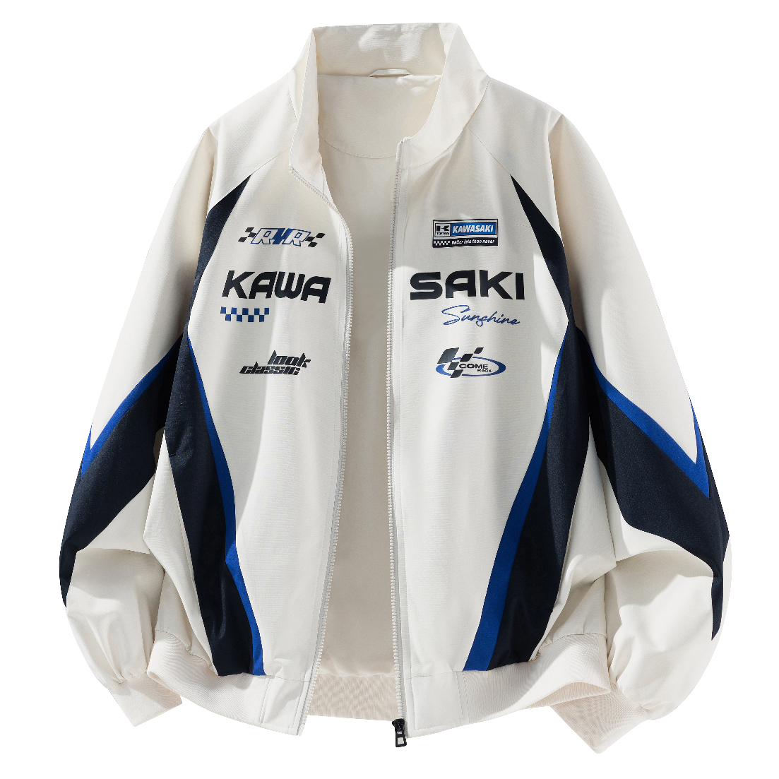 谁能拒绝一件自带速度感的赛车服夹克! @Kawasaki川崎运动 这件白蓝黑撞色拼接+满版赛车元素印花,复古美式那味儿直接拉满。 宽松廓形+立领设计,既能挡风又能凹造型,搭配做旧破洞阔腿牛仔裤,慵懒又不羁。 穿上这件赛车服仿佛置身于复古街头,自信满满 水泥墙+泼墨背景随便一拍,就是街头氛围感大片📸 OOTD👇 🧥:白蓝拼色赛车服夹克 Kawasaki川崎 👖:做旧破洞阔腿牛仔裤 👟:...