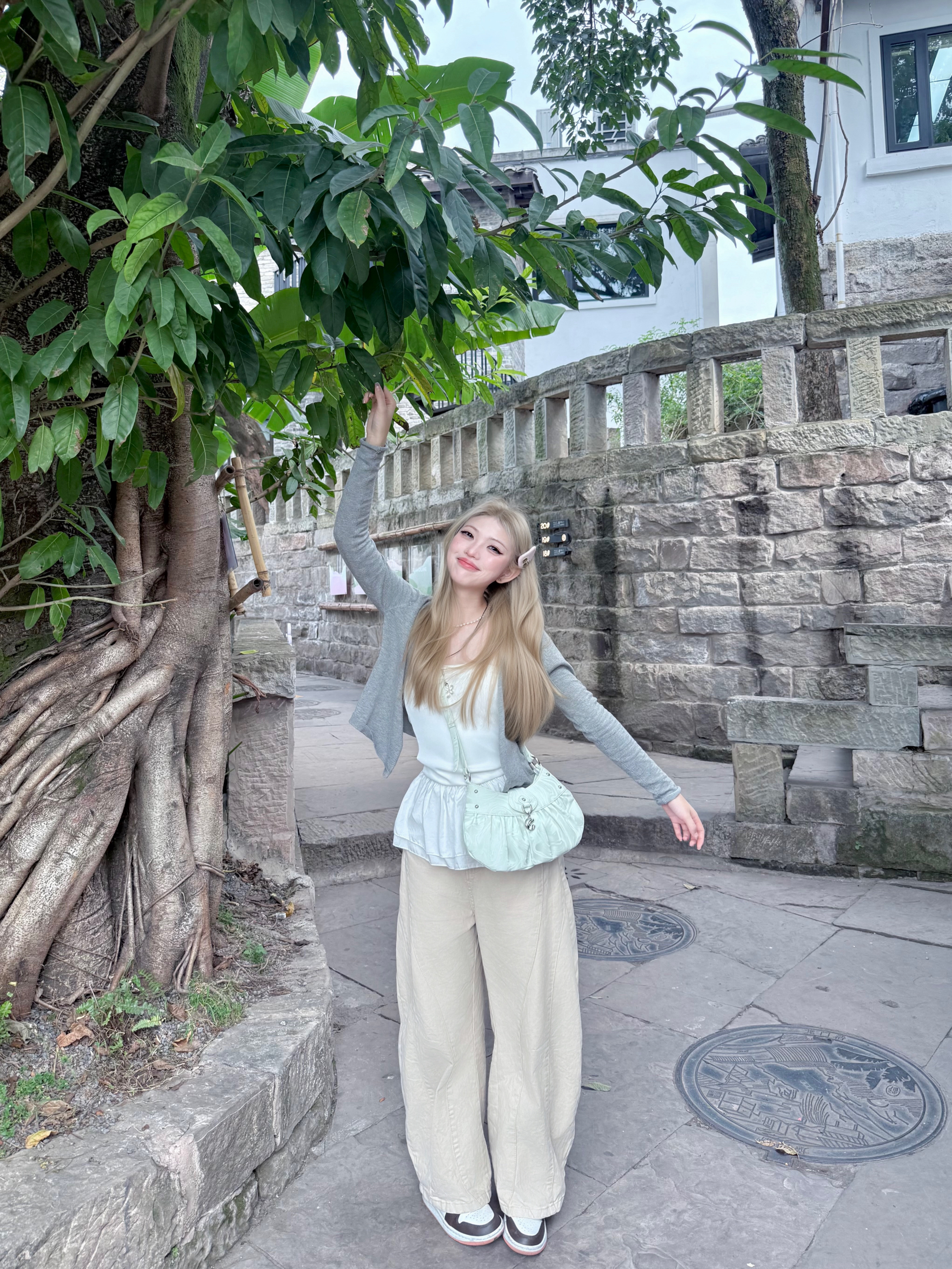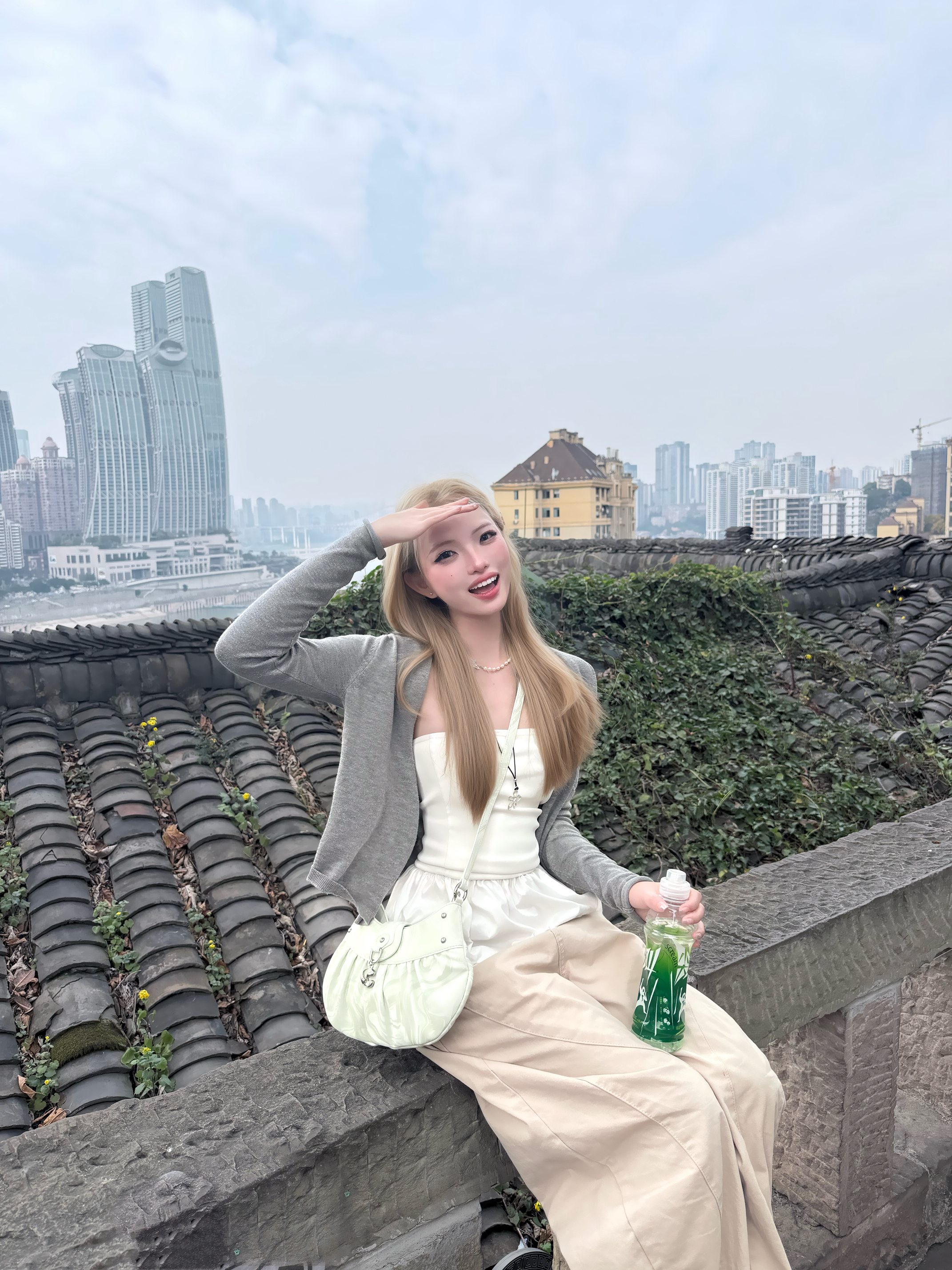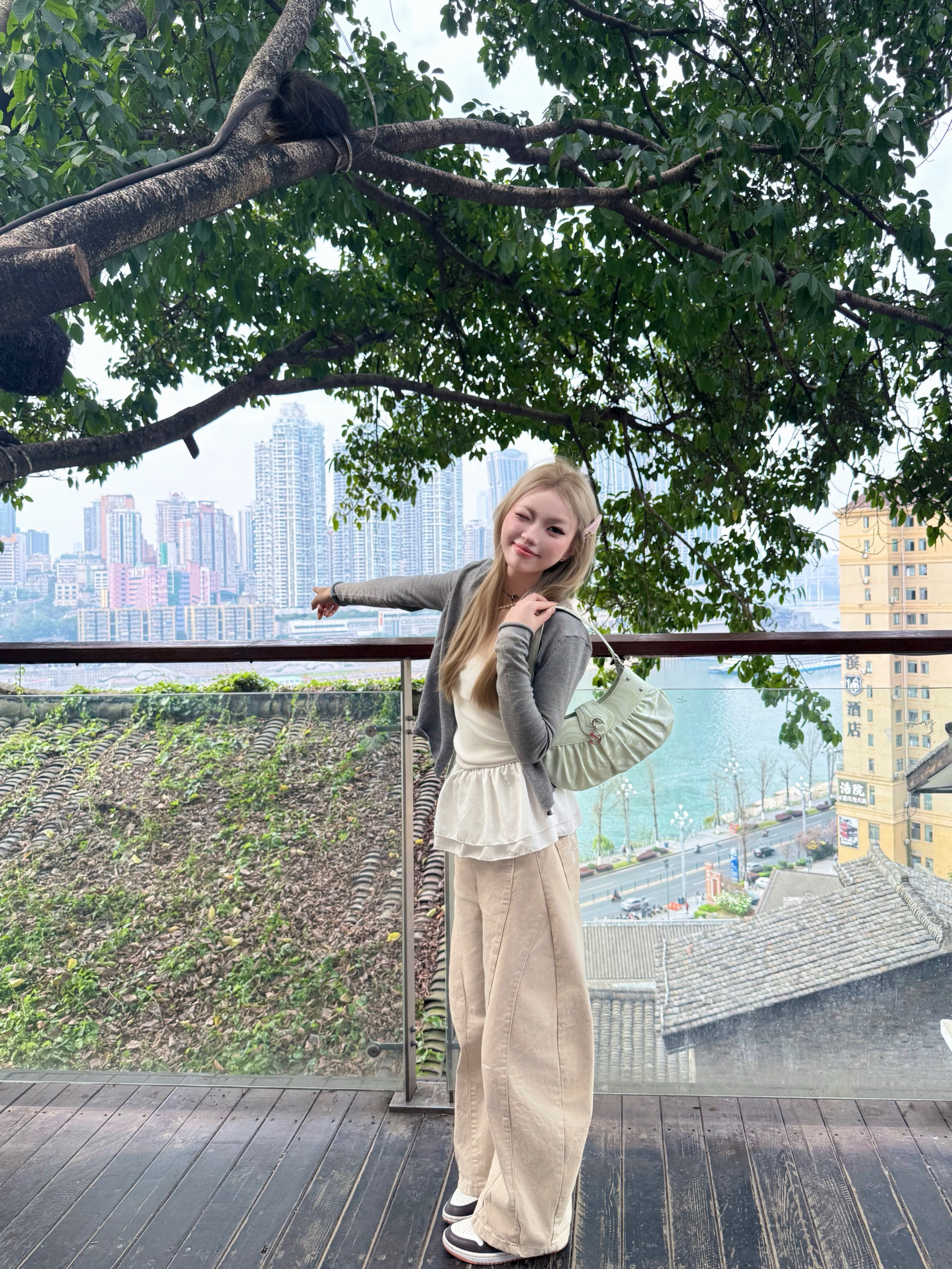 尊嘟美翻了~ 阴天也好逛啊! 穿白色抹胸搭配灰色开衫➕卡其色的阔腿裤 一套好韩系✌️ 在重庆这样穿美美过春天啦 搭配果冻薄荷腋下包 配色好清新😍 基本东西都能装吖 穿jordan可以在这里面暴走一天都不累脚 谁懂山城的惬意感💕