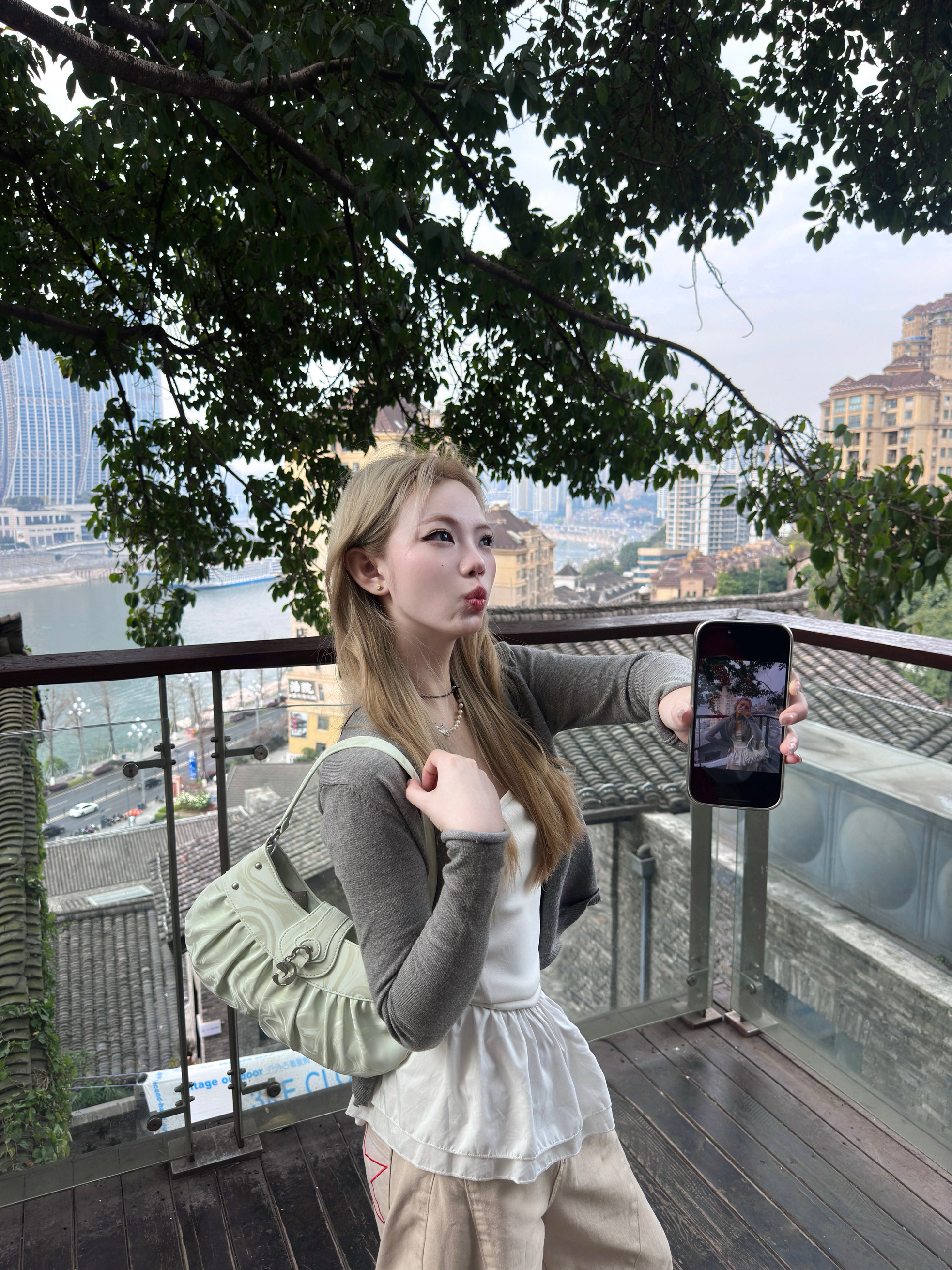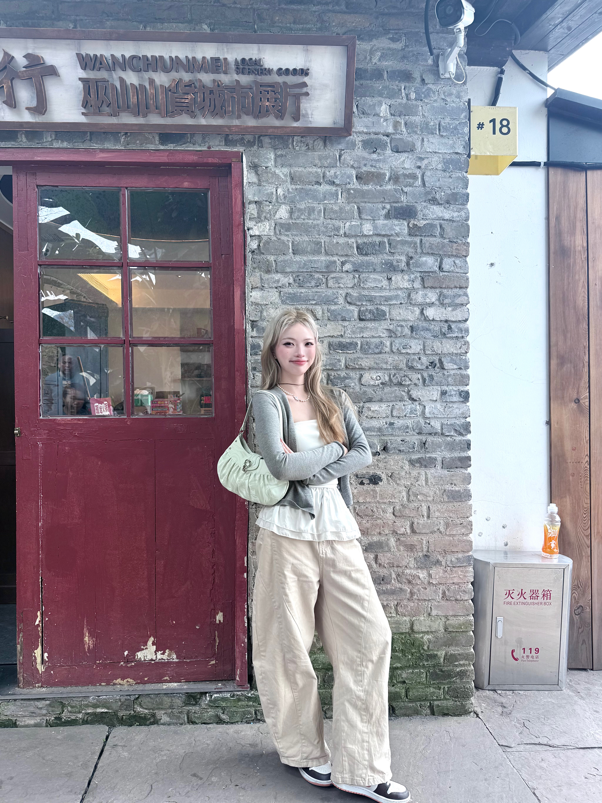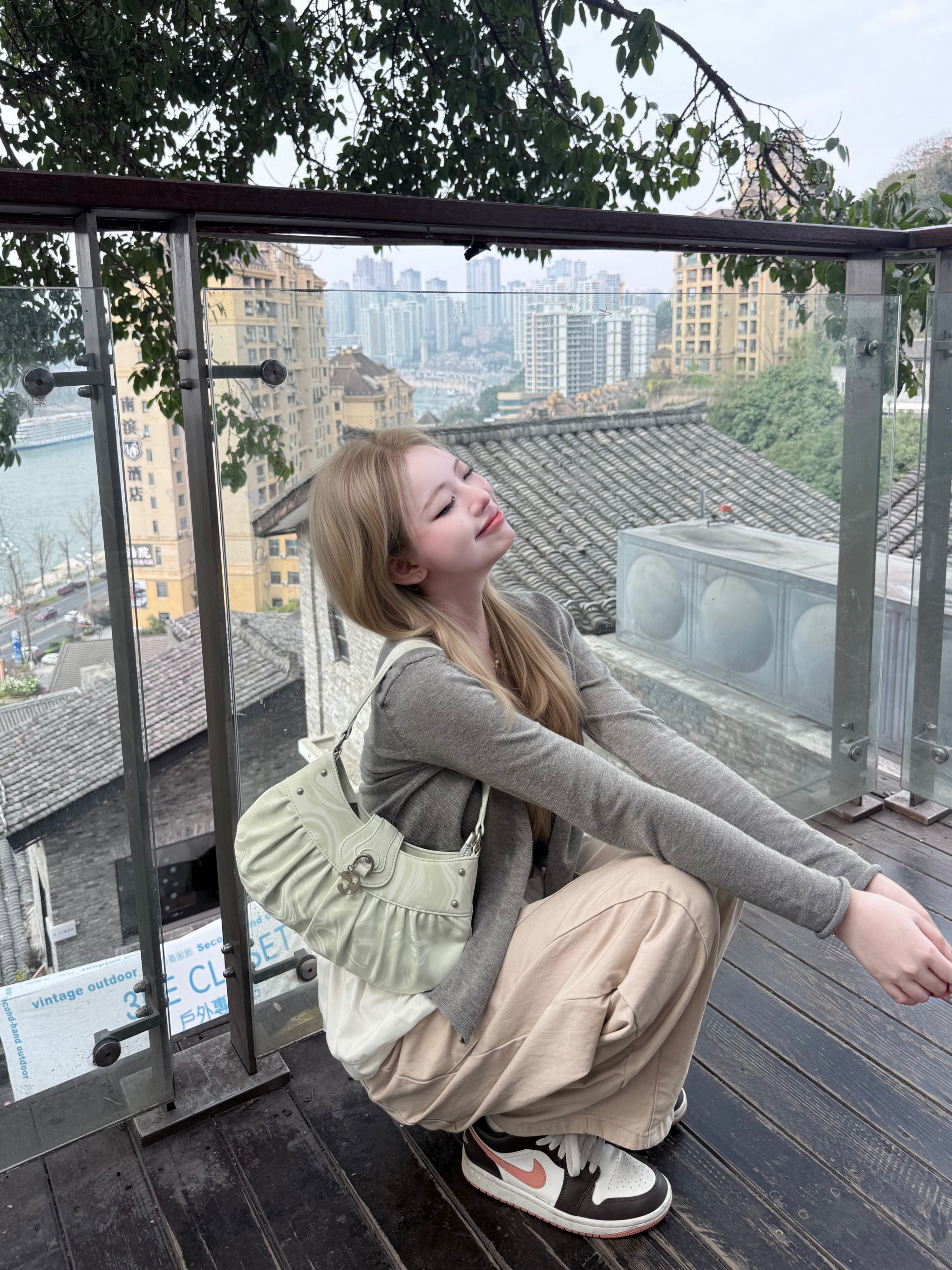 尊嘟美翻了~ 阴天也好逛啊! 穿白色抹胸搭配灰色开衫➕卡其色的阔腿裤 一套好韩系✌️ 在重庆这样穿美美过春天啦 搭配果冻薄荷腋下包 配色好清新😍 基本东西都能装吖 穿jordan可以在这里面暴走一天都不累脚 谁懂山城的惬意感💕